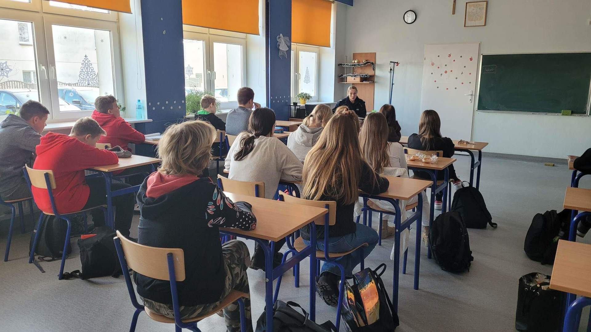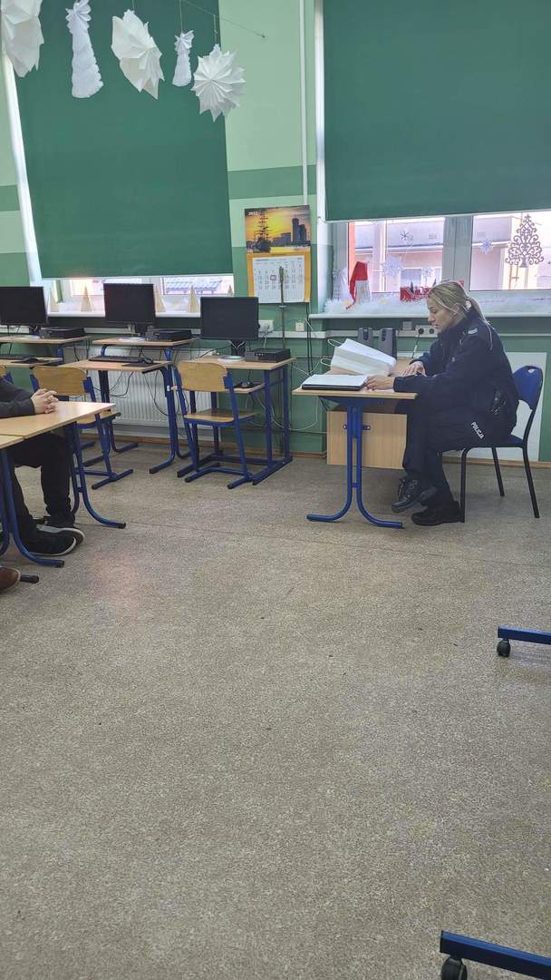 Dnia 14.12. 2022 odbyła się pogadanka profilaktyczna z uczniami klas VII i VIII prowadzona przez st. Sierżant p. Aleksandrę Żak z Komendy Powiatowej Policji w Kościanie. P. Sierzant przybliżyła uczniom temat demoralizacji nieletnich, czynów karalnych oraz konsekwencji jakie mogą ponieść osoby nieletnie w przypadku gdy je popełnią.