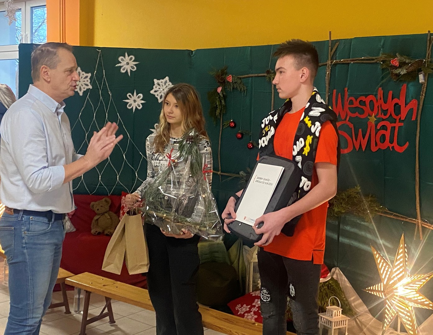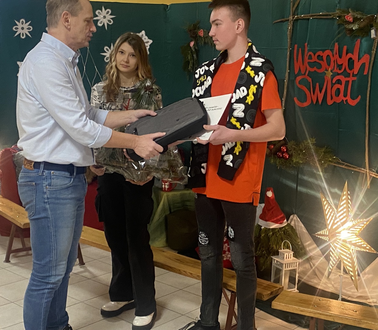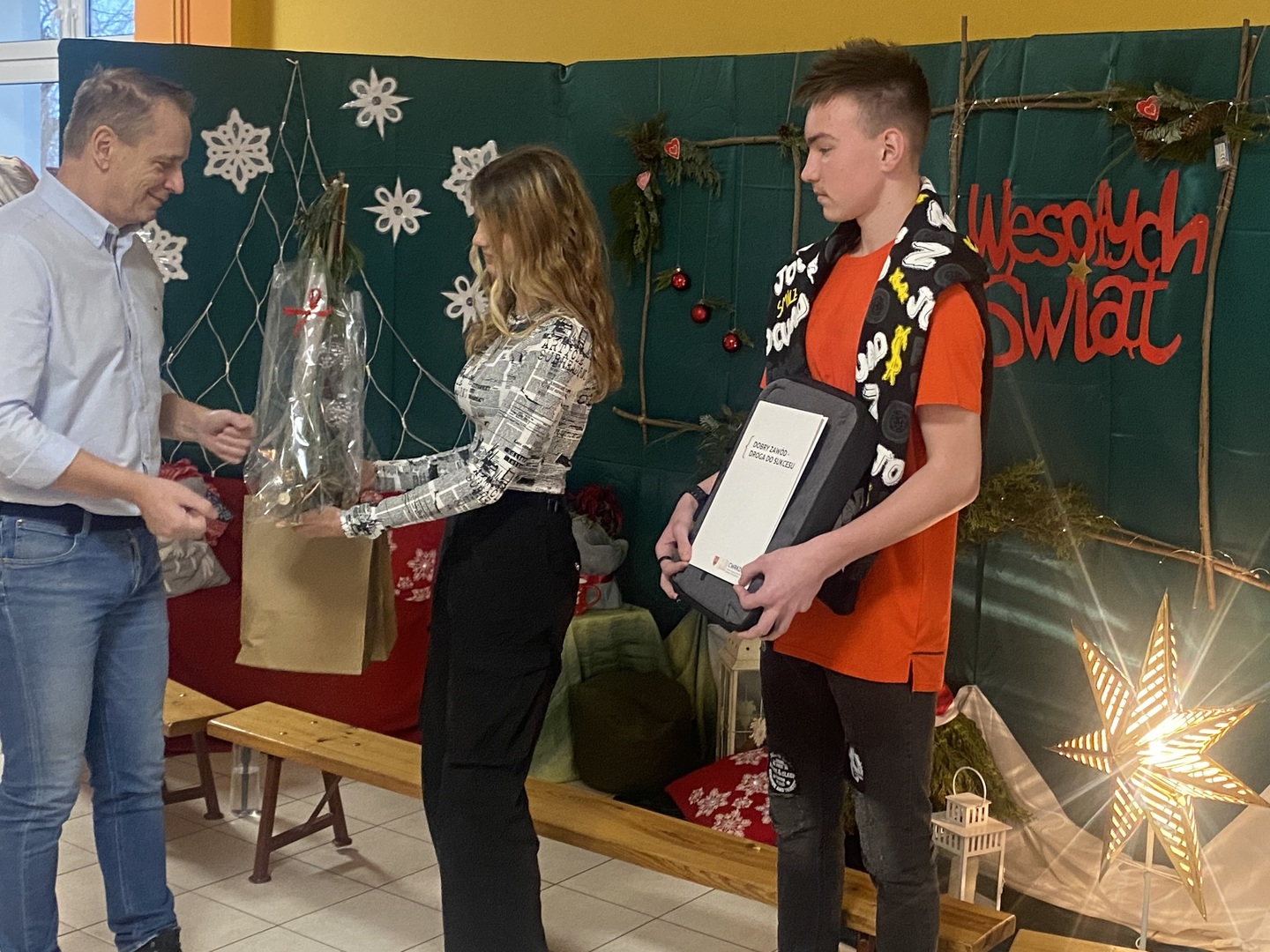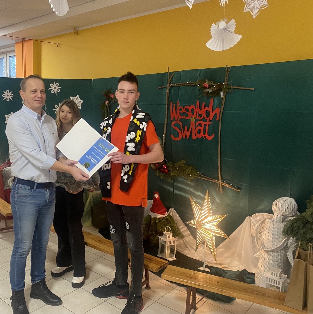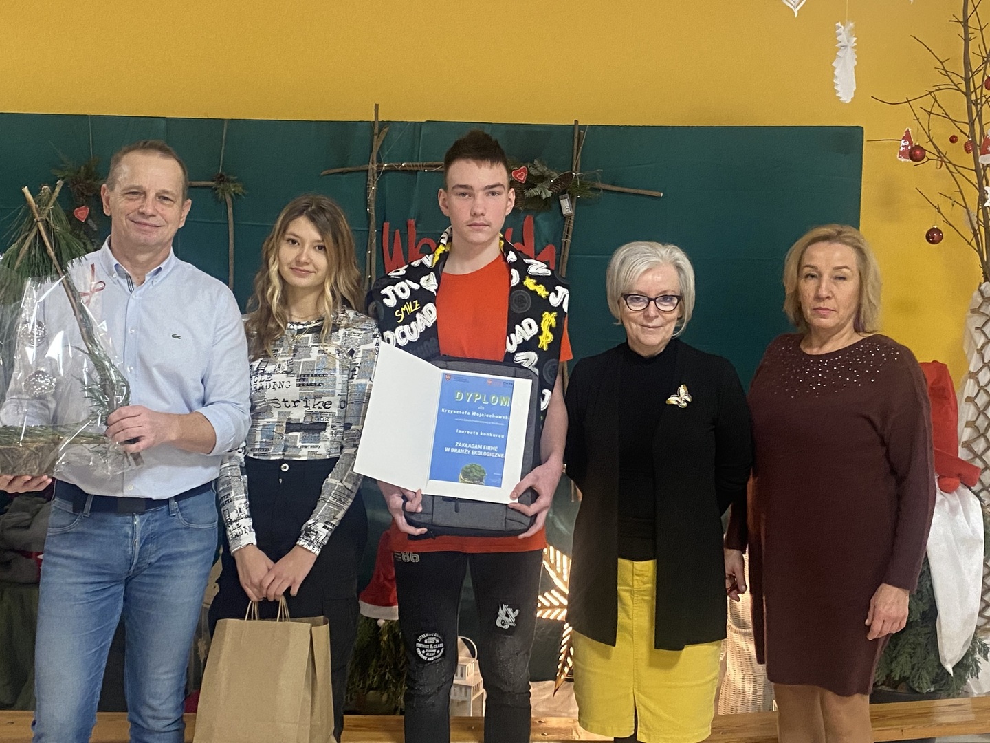 21 grudnia naszą szkołę odwiedził pan Grzegorz Kozak z CWRKDiZ w Lesznie, celem wręczenia nagrody uczniowi klasy ósmej - Krzysztofowi Wojciechowskiemu, który znalazł się wśród pięciu laureatów konkursu „Zakładam firmę w branży ekologicznej”. Celem konkursu było promowanie myślenia proekologicznego związanego z działalnością firm i przedsiębiorstw, poszukiwanie nowych rozwiązań proekologicznych oraz zwrócenie uwagi na rolę kompetencji i zainteresowań przy podejmowaniu decyzji nt. przyszłej kariery zawodowej.