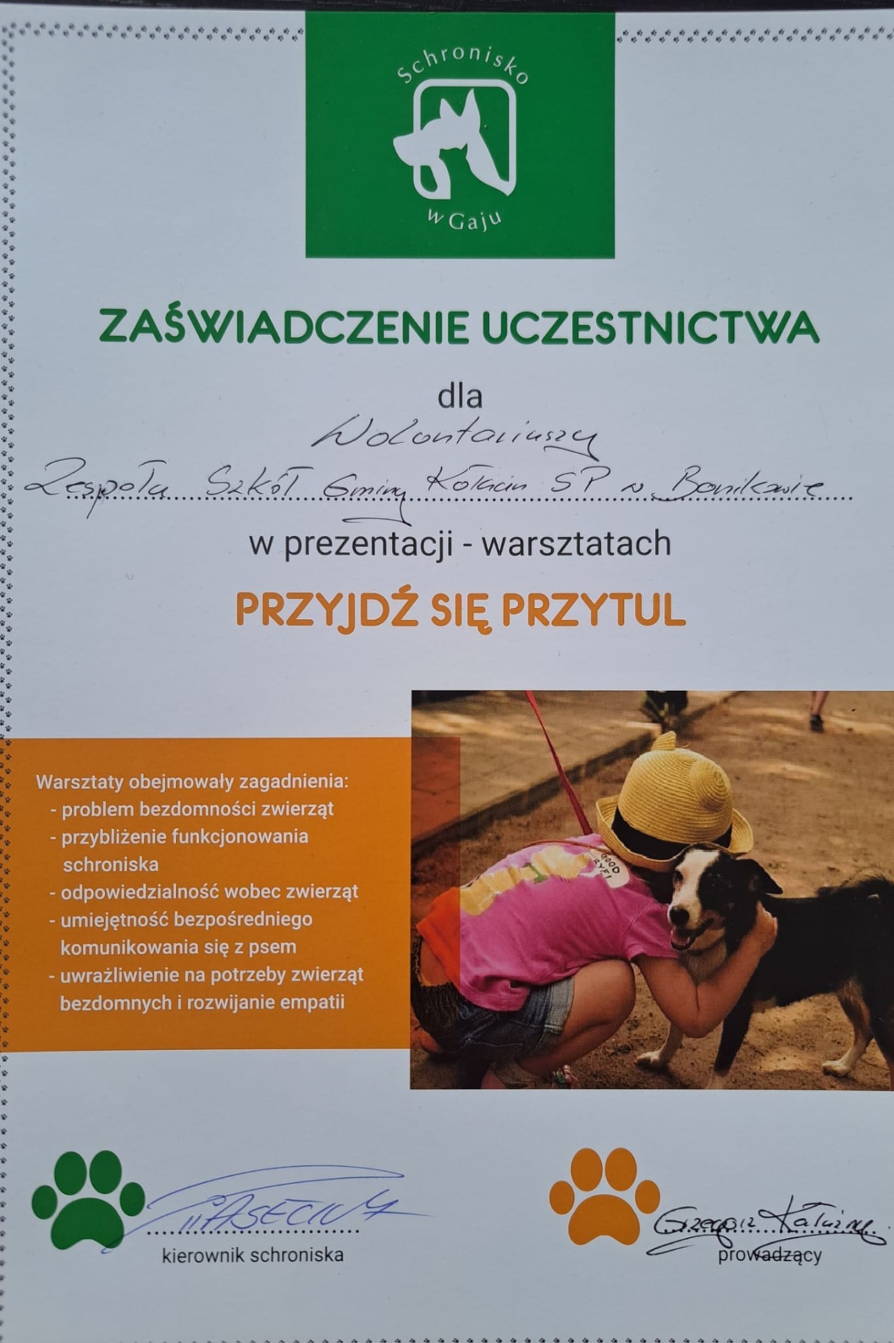 "Przyjdź się przytul"- celem jest wykreowanie właściwych postaw w zakresie traktowania zwierząt oraz zaproponowanie Wolontariatu jako skutecznej formy nauki i pracy jednocześnie.