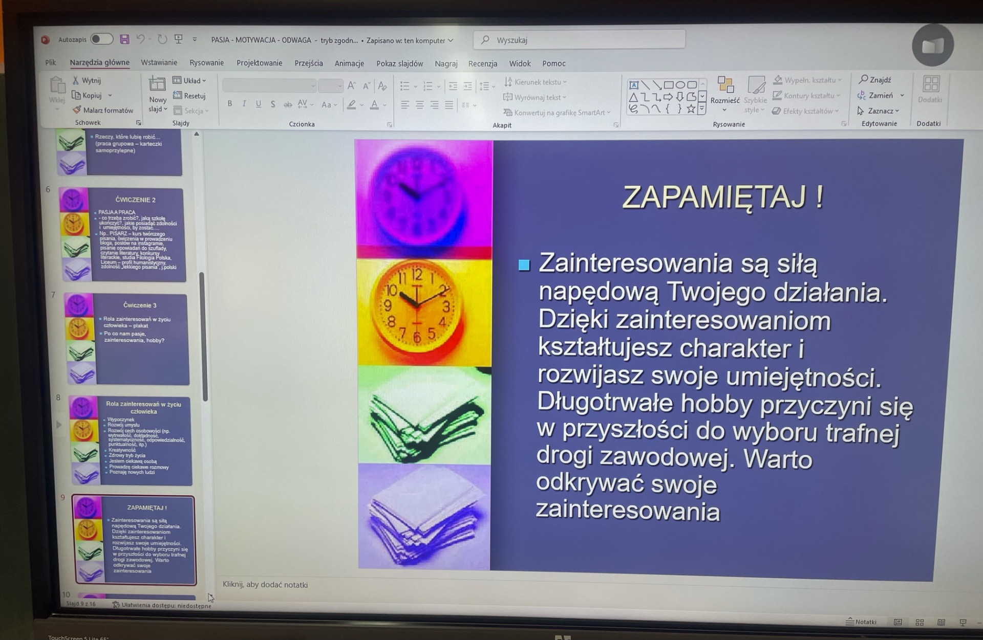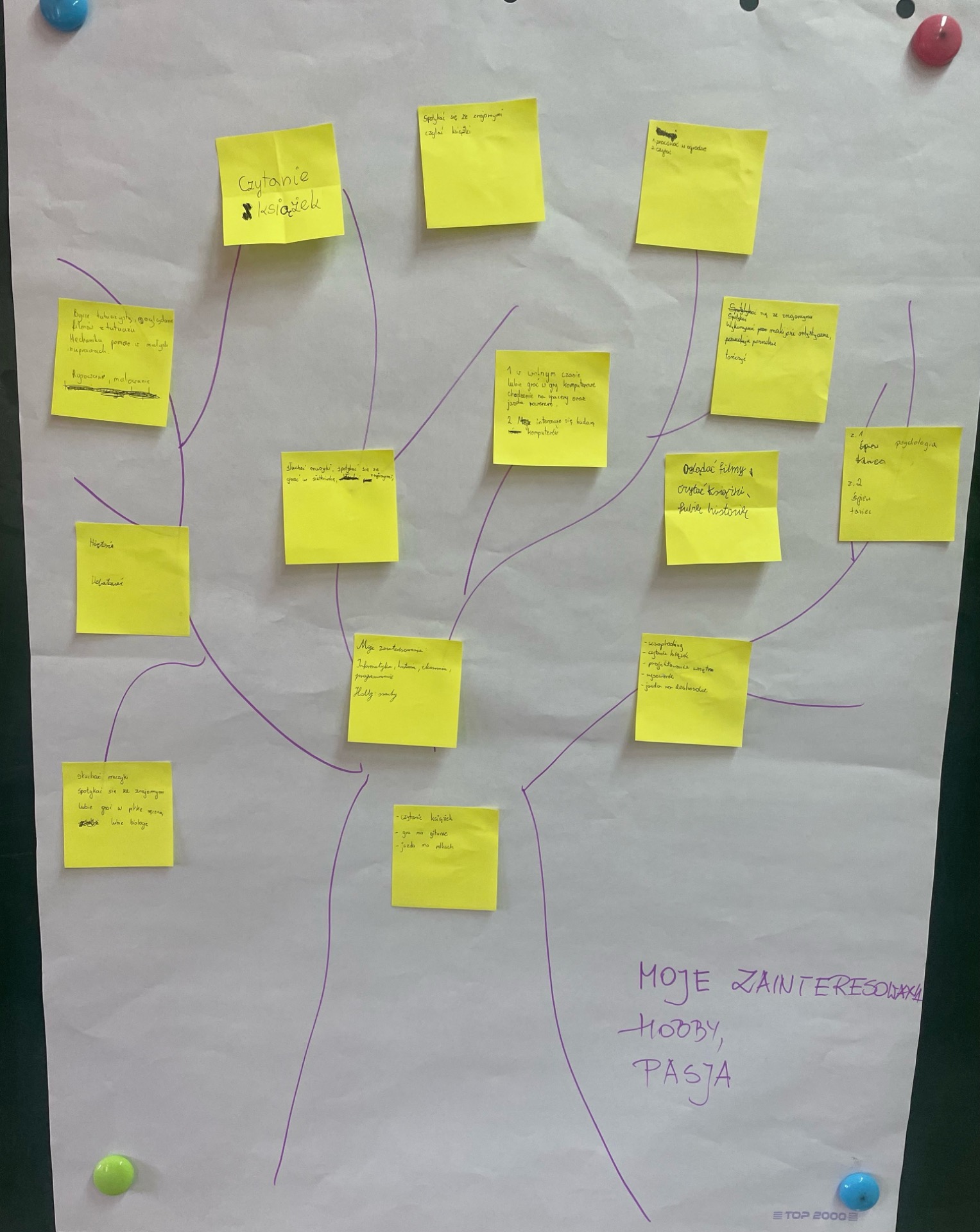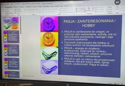Celem zajęć było uświadomienie uczniom znaczenia pasji i zainteresowań w procesie planowania własnego rozwoju zawodowego, poznanie własnych zasobów i mocnych stron, odnajdywanie motywacji i odwagi w wyborze ścieżki edukacyjno-zawodowej.