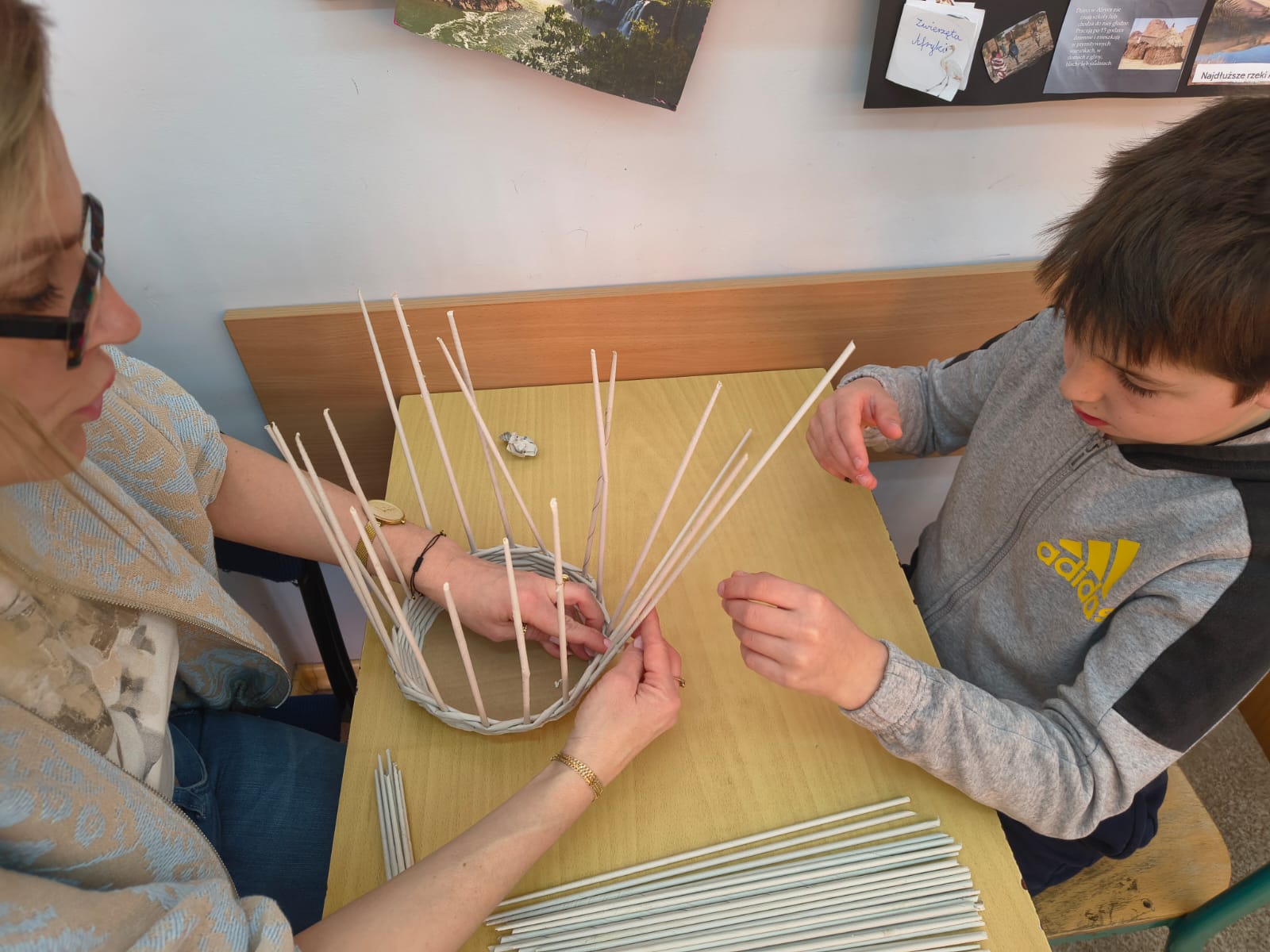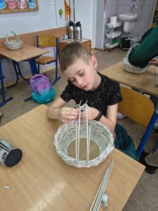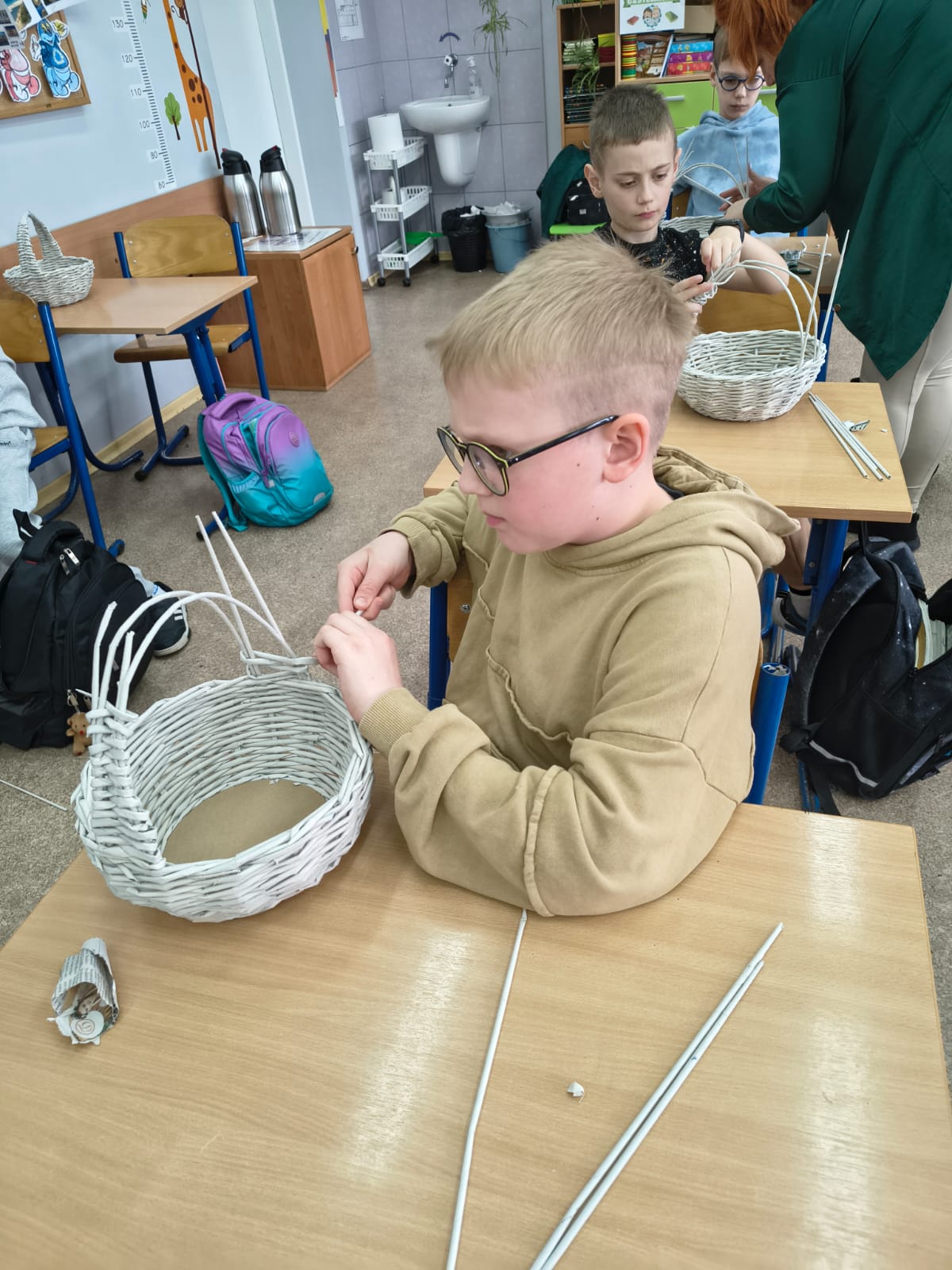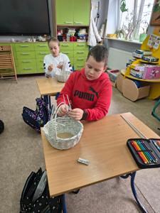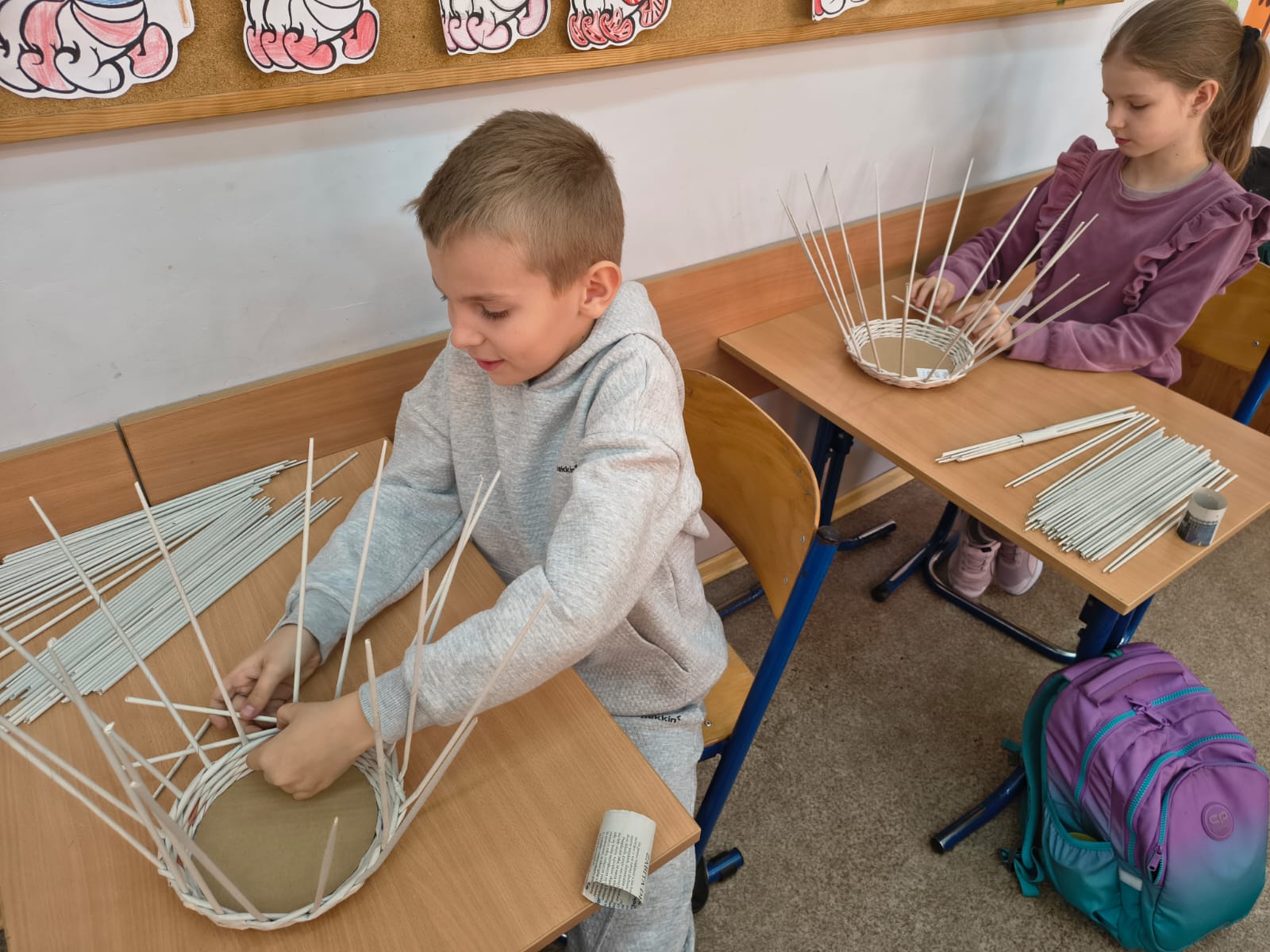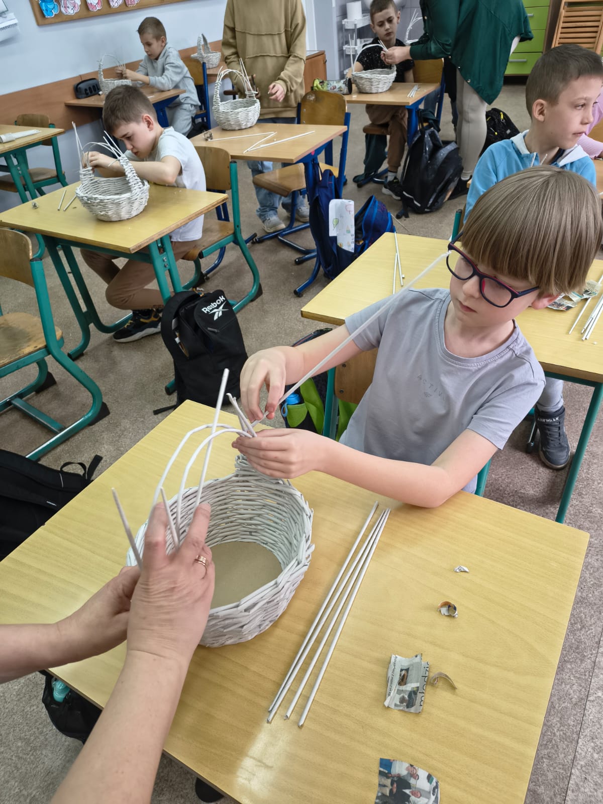 Dnia 09.04.2025 r. uczniowie klasy trzeciej podczas zajęć gościli Panią Marikę, która wprowadziła ich w magiczny świat wielkanocnych ozdób. Dzieci dowiedziały się, że z szarej gazety mogą powstać koszyczki. Warsztaty wikliniaskie wcale nie były takie proste, ale zaangażowanie i staranność trzeciolasistów, a także pomoc Pani Mariki i Pani Roksany przyniosły wspaniałe efekty. Dzieci wykonały piękne koszyki z papierowej wikliny oraz zające z tektury i krepiny.