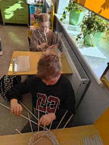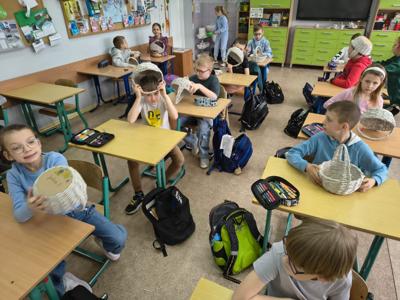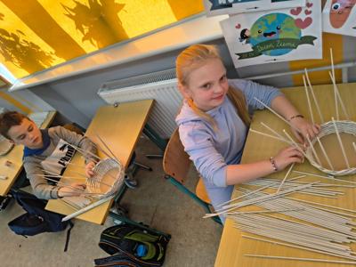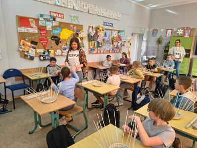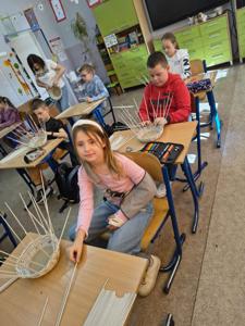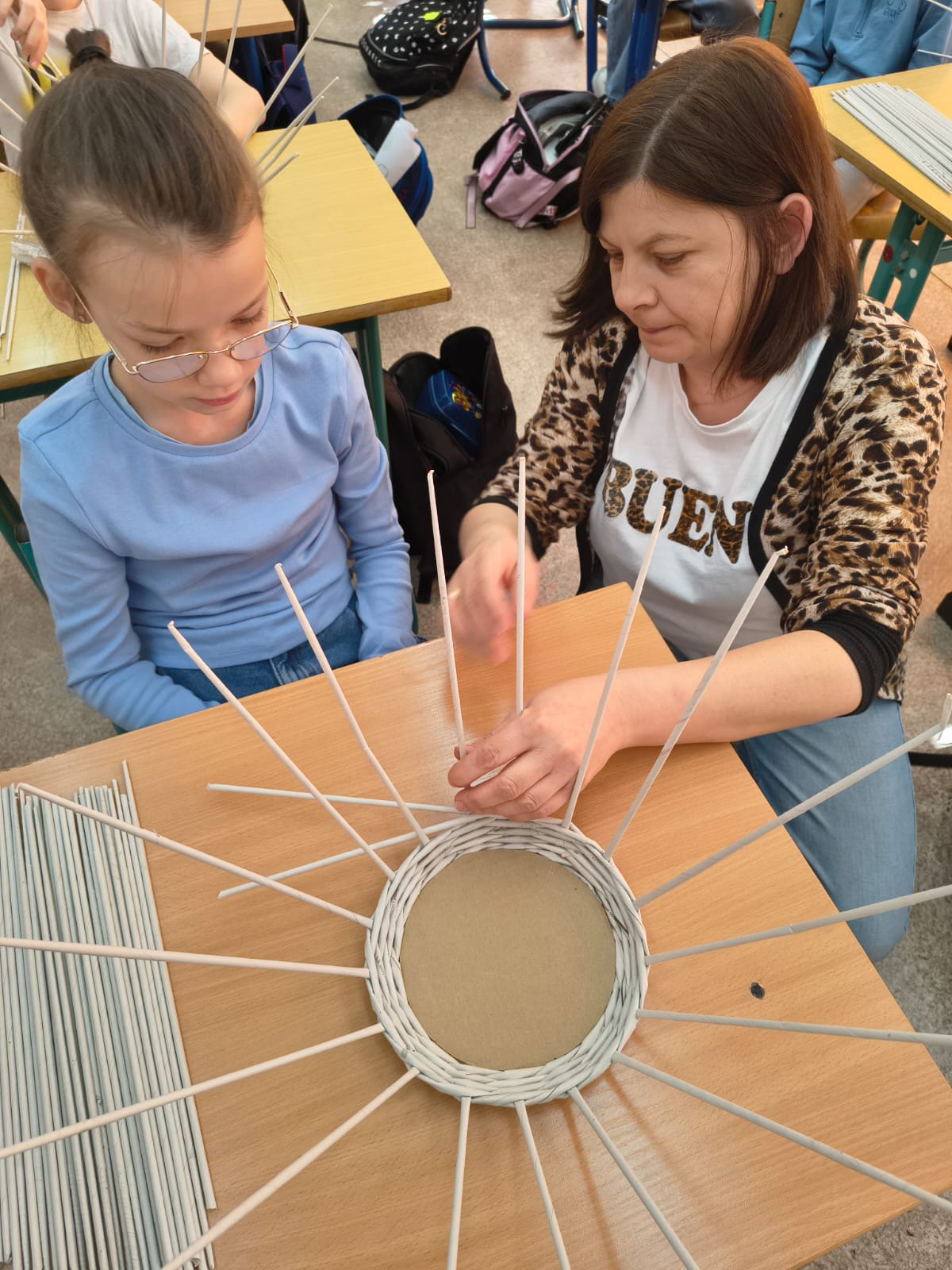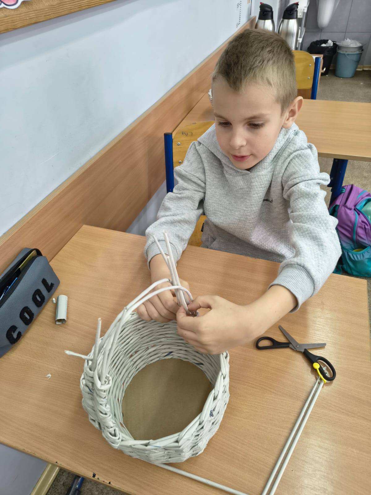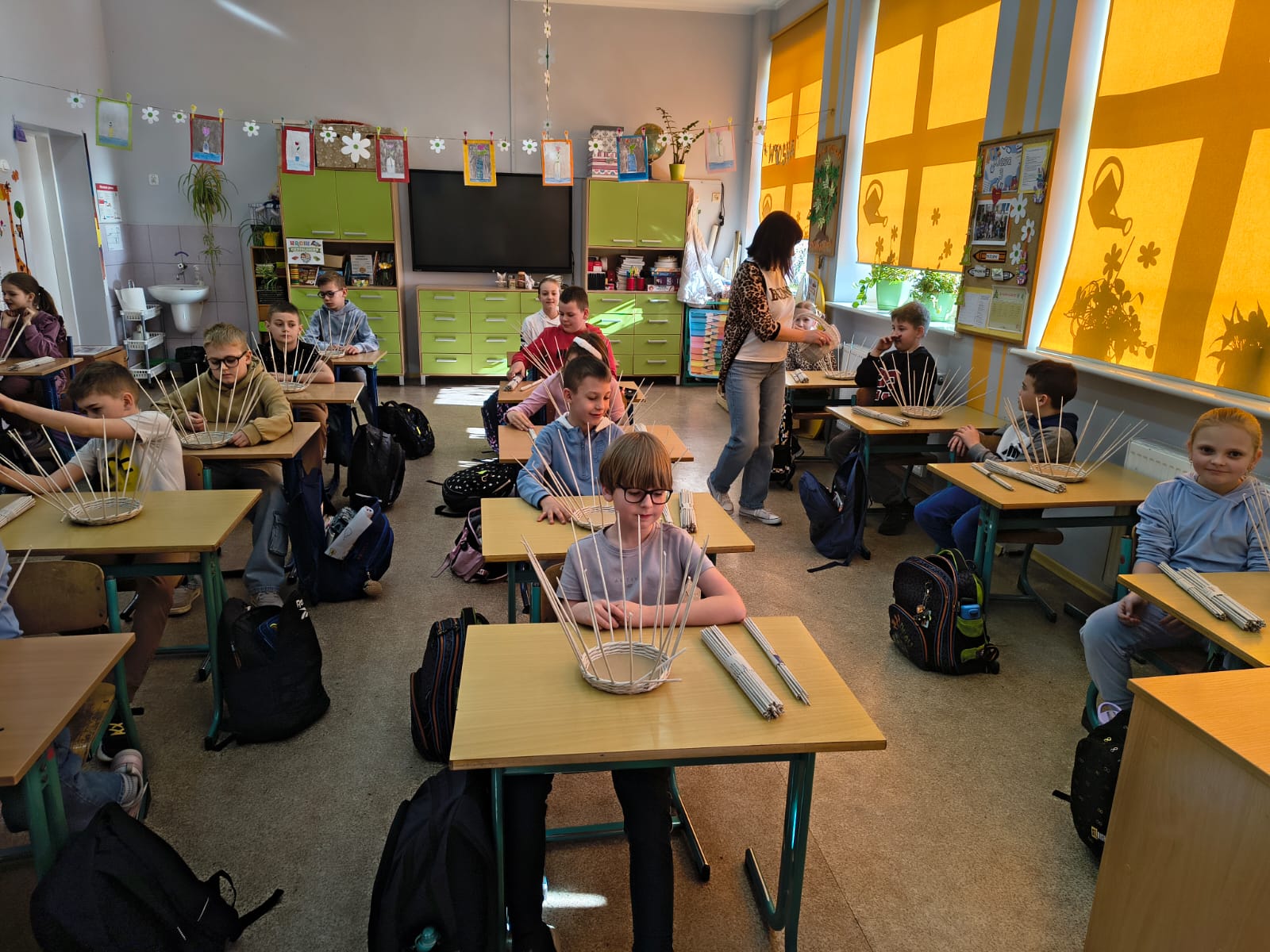 Dnia 09.04.2025 r. uczniowie klasy trzeciej podczas zajęć gościli Panią Marikę, która wprowadziła ich w magiczny świat wielkanocnych ozdób. Dzieci dowiedziały się, że z szarej gazety mogą powstać koszyczki. Warsztaty wikliniaskie wcale nie były takie proste, ale zaangażowanie i staranność trzeciolasistów, a także pomoc Pani Mariki i Pani Roksany przyniosły wspaniałe efekty. Dzieci wykonały piękne koszyki z papierowej wikliny oraz zające z tektury i krepiny.