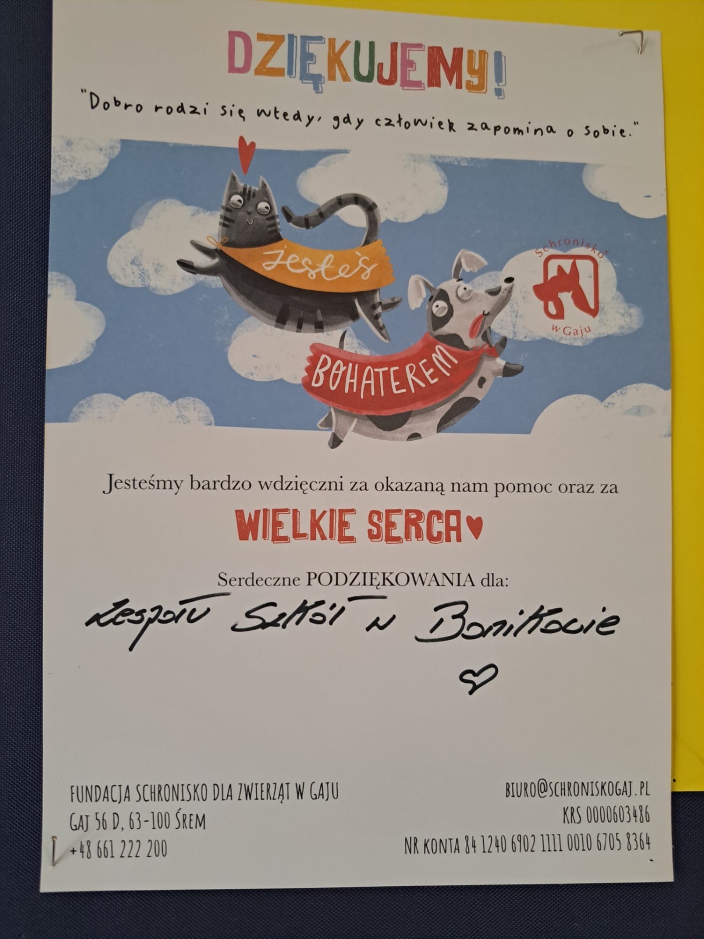 W niedzielę 22 czerwca Klub Wolontariatu przekazał zebrane rzeczy dla kotów ze Schroniska w Gaju. Było to podziękowanie całej społeczności naszej szkoły za sfinansowanie leczenia naszego kotka.