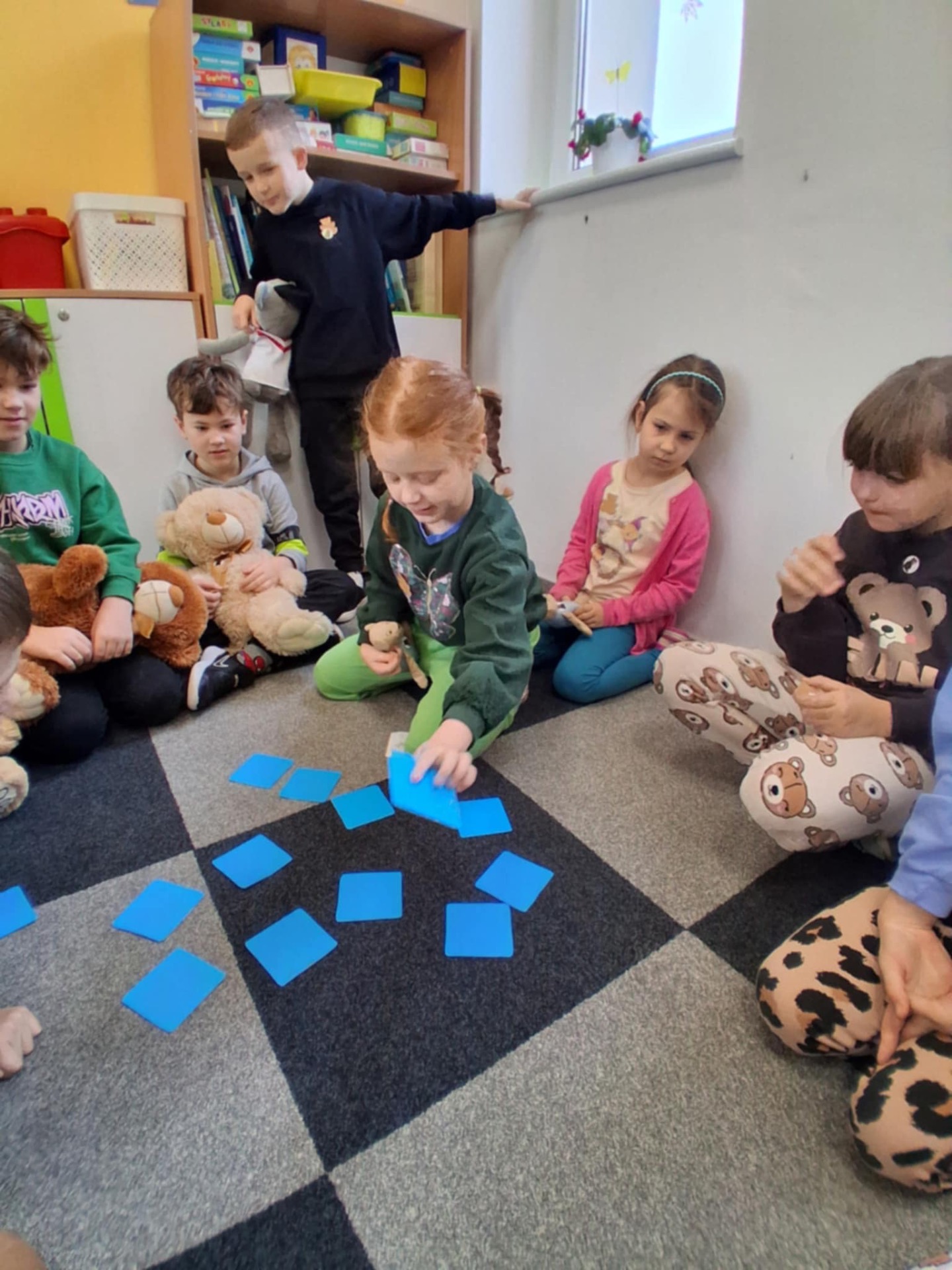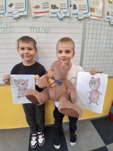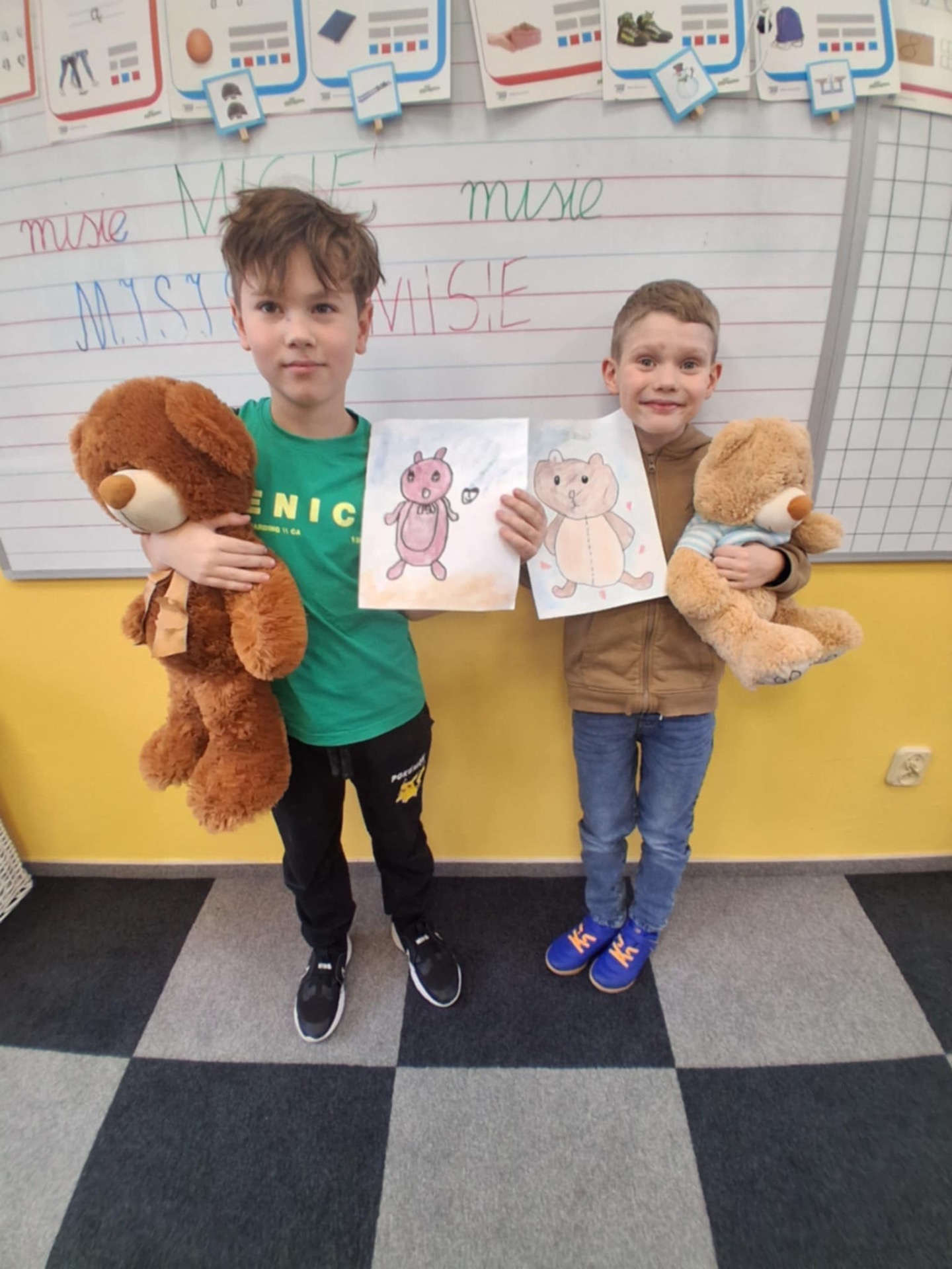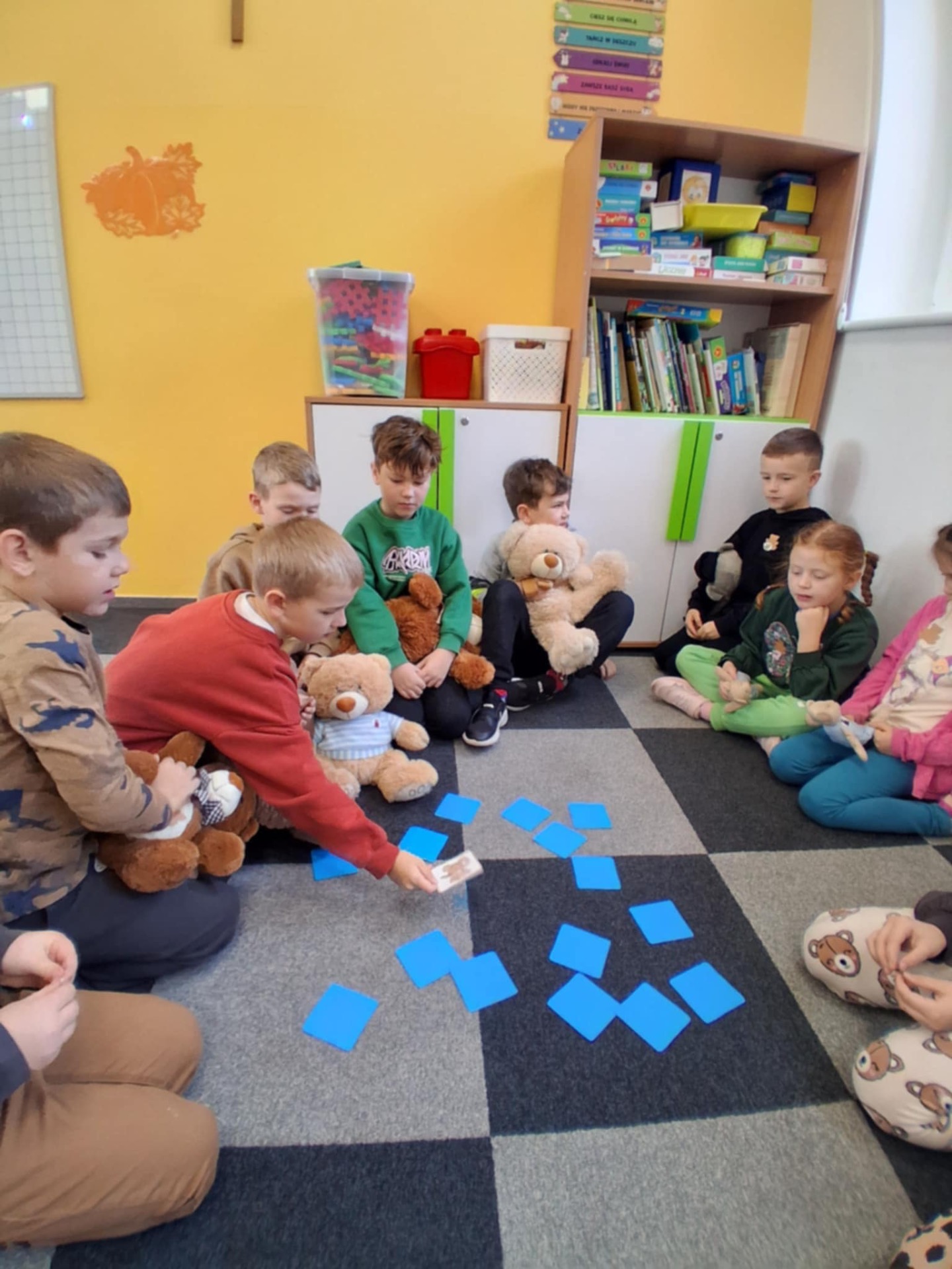 Podczas zajęć dzieci doskonaliły grafomotorykę, rysując dużego misia i starannie poprawiając jego kontury. Nie zabrakło także zabawy — uczniowie wzięli udział w misiowej grze pamięciowej, rozwijając spostrzegawczość oraz koncentrację.
