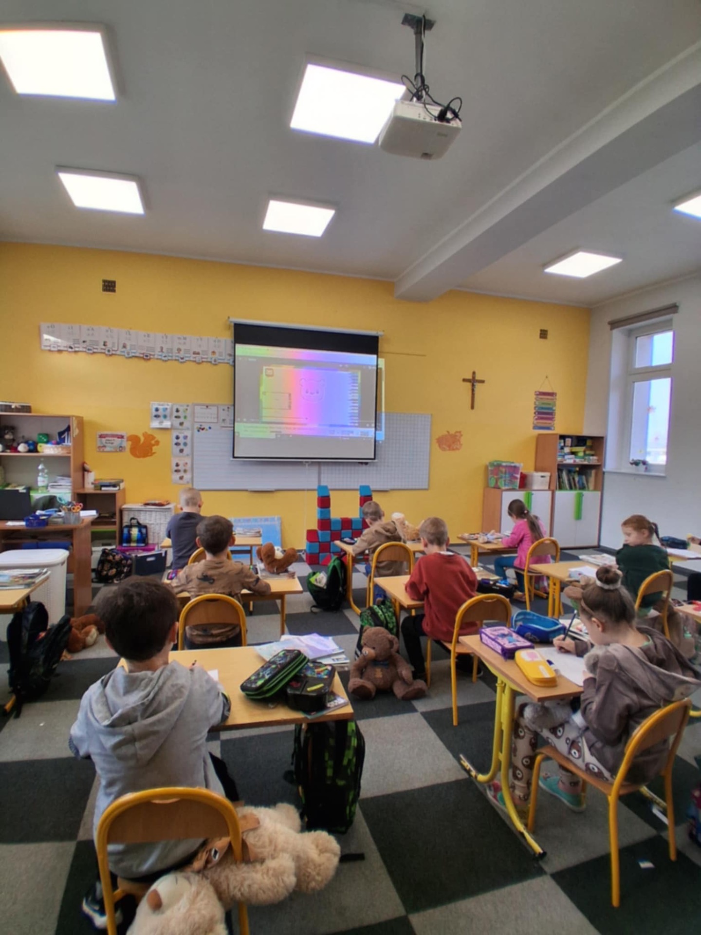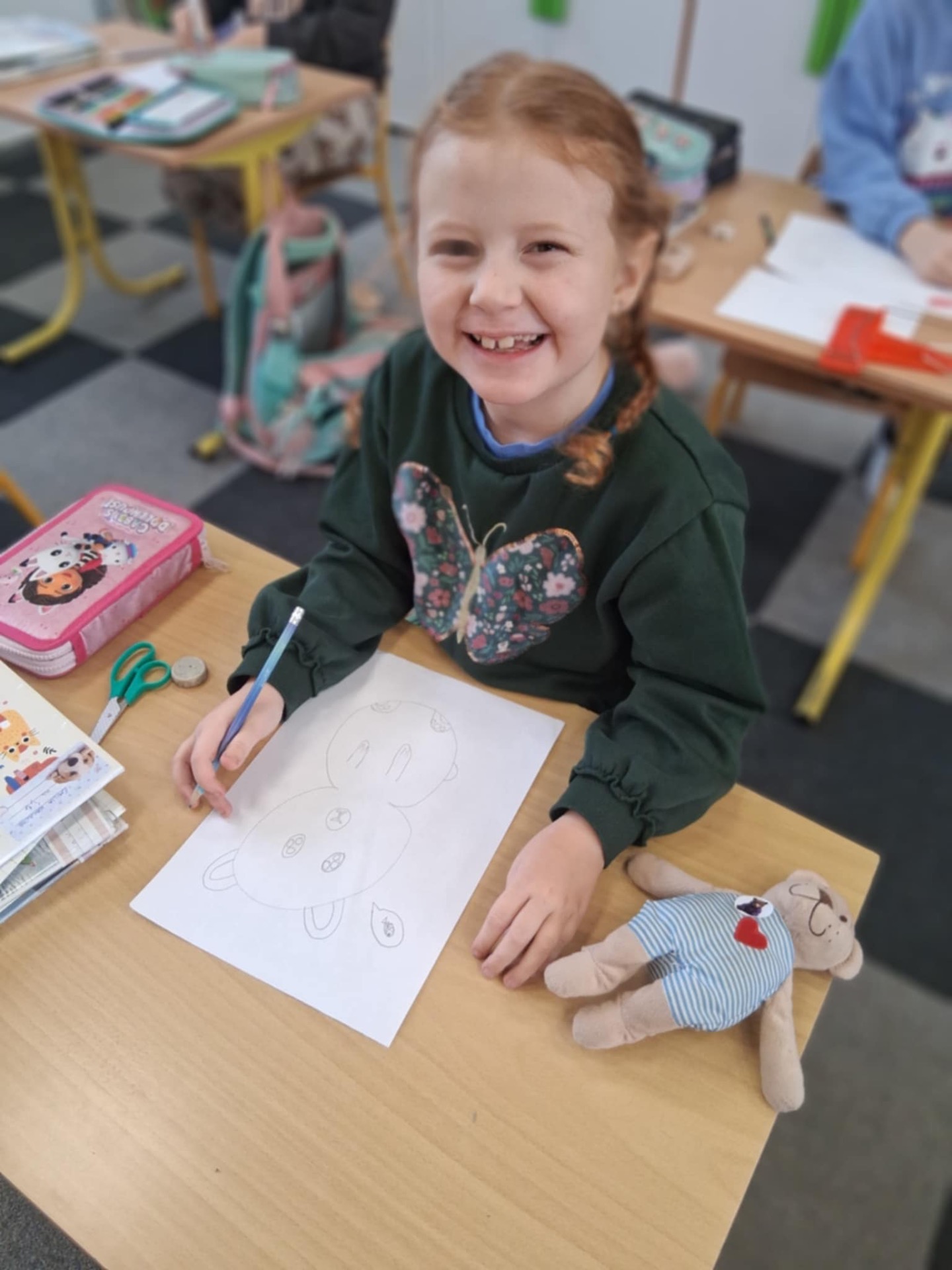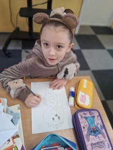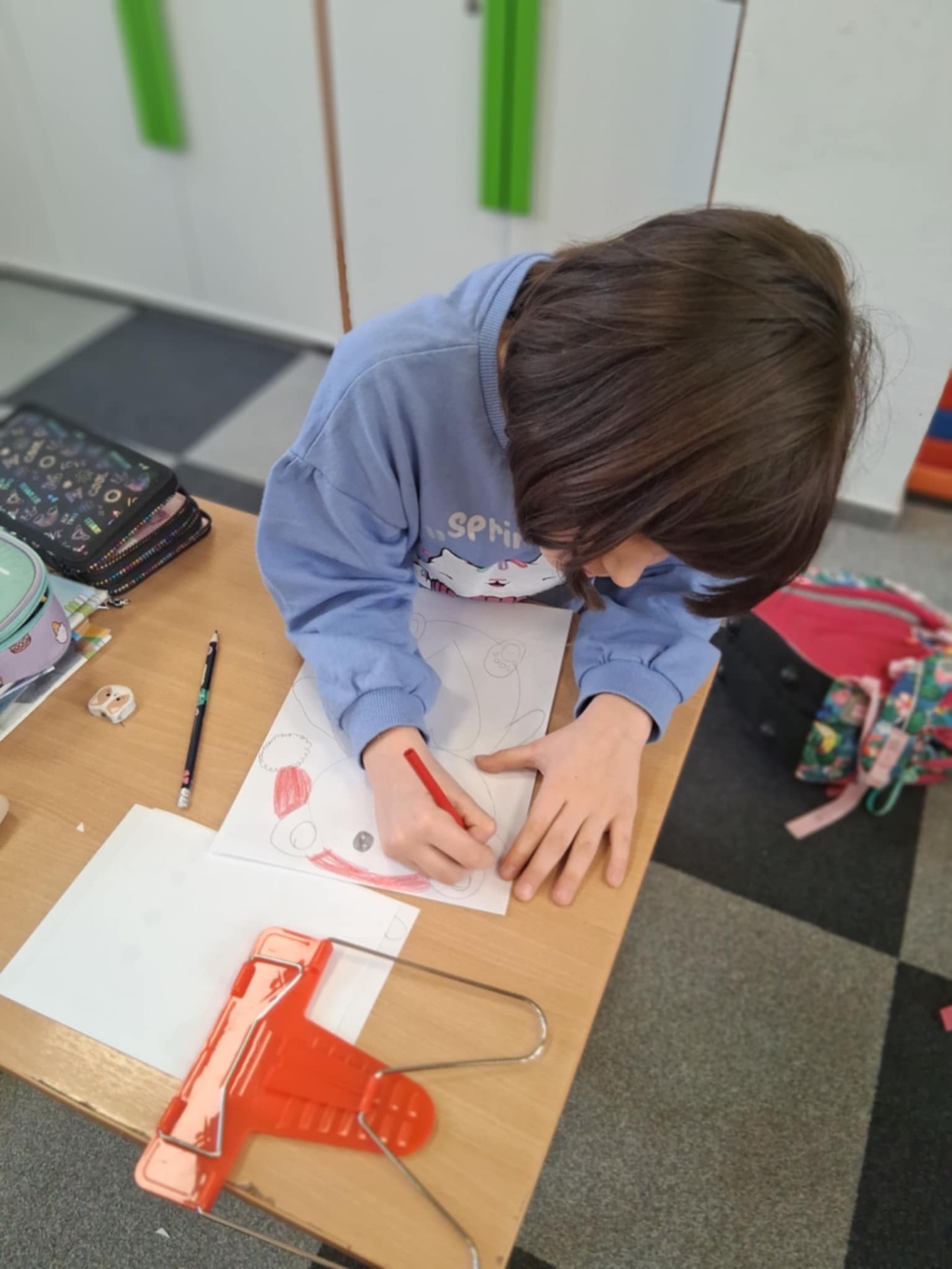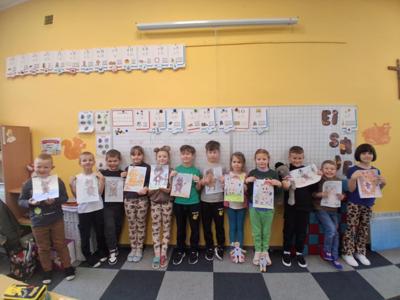 Podczas zajęć dzieci doskonaliły grafomotorykę, rysując dużego misia i starannie poprawiając jego kontury. Nie zabrakło także zabawy — uczniowie wzięli udział w misiowej grze pamięciowej, rozwijając spostrzegawczość oraz koncentrację.