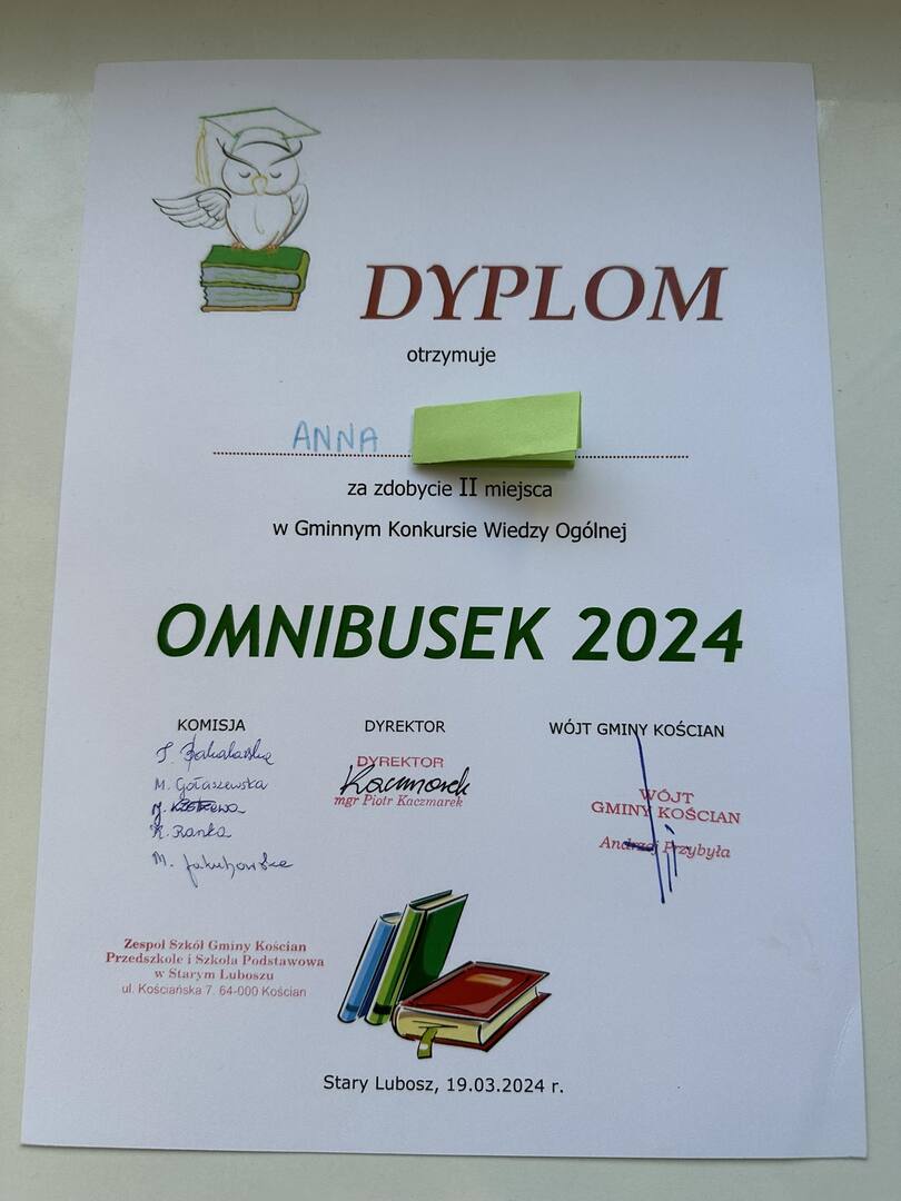 Zobacz również 06.06.2025 Gminny Konkurs Matematyczny „Mistrz Rachunków... 05.06.2025 Big challenge - międzynarodowy konkurs z języka... 27.05.2025 II Gminny Konkurs Recytatorski 20.05.2025 Powiatowy Konkurs Matematyczno-Przyrodniczy dla... OMNIBUSEK 2024 Serdecznie gratulujemy Ani zajęcia II miejsca w Gminnym Konkursie Wiedzy Ogólnej "OMNIBUSEK 2024". Opublikowano: 26 marca 2024 12:39 Kategoria: Konkursy Wydrukuj Wyświetleń: 106