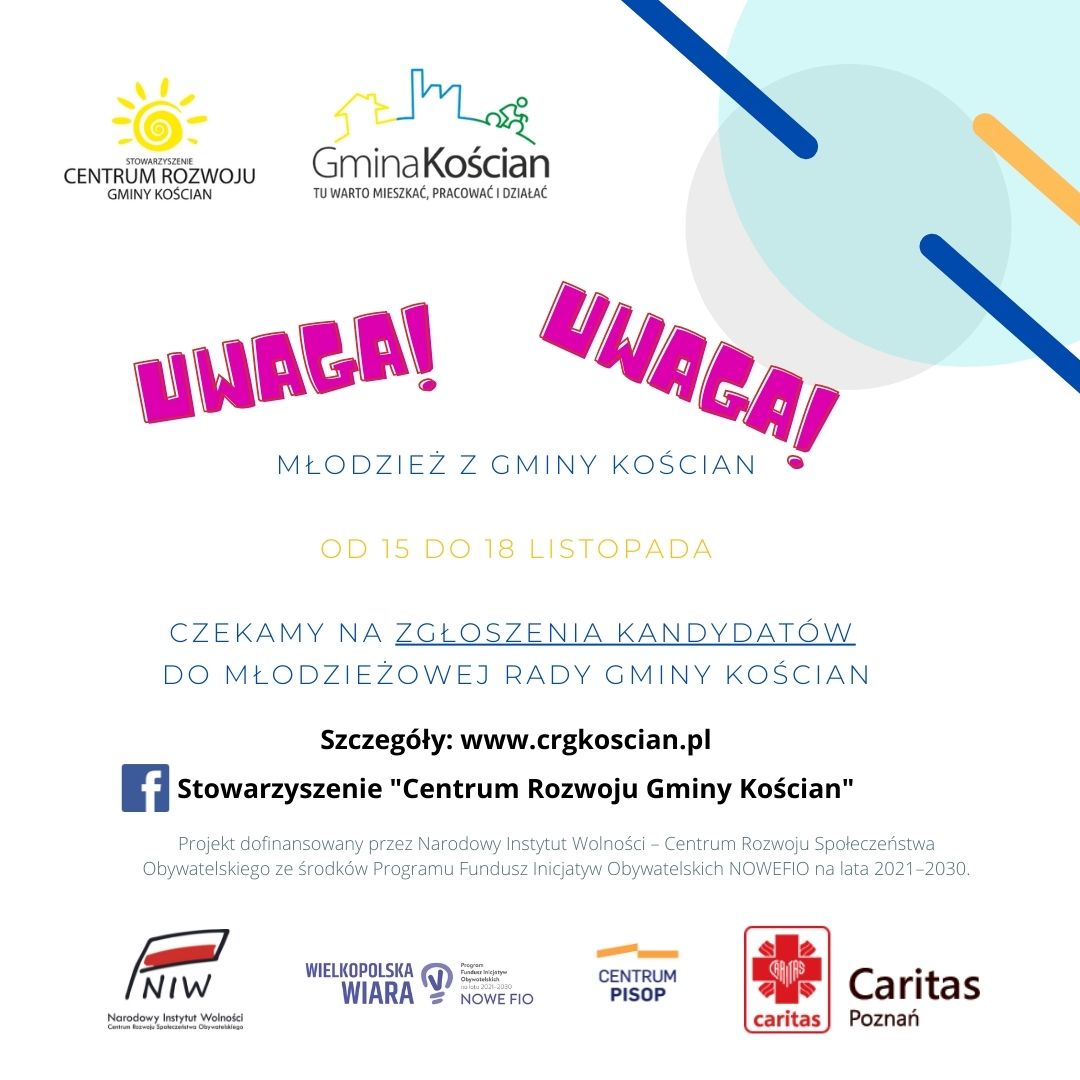 Masz wrażenie, że życie jest mało ekscytujące, chciałbyś coś zmienić, czegoś nowego się nauczyć? A może zrobić coś na rzecz innych? Nie czekaj, bo jest mało czasu, ZGŁOŚ się jako kandydat do MŁODZIEŻOWEJ RADY GMINY KOŚCIAN 😊 Zgłoszenia kandydatów przyjmują opiekunowie Samorządów Uczniowskich w naszych szkołach.
