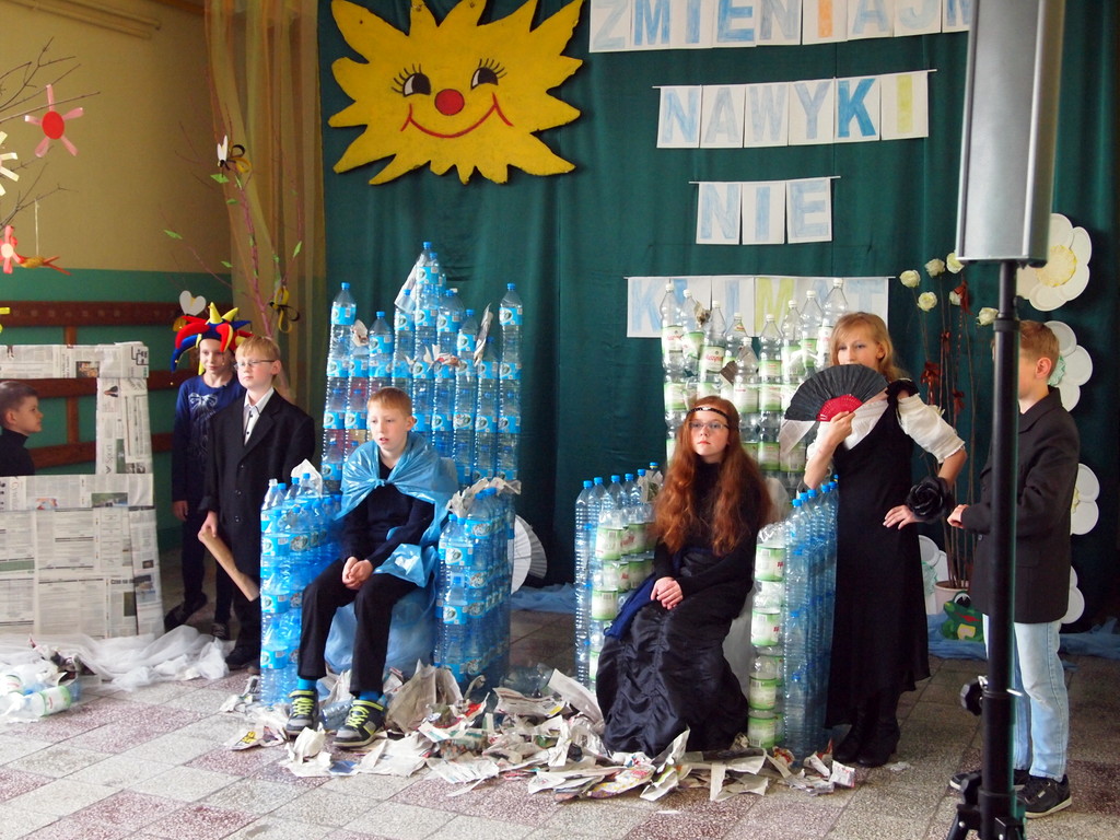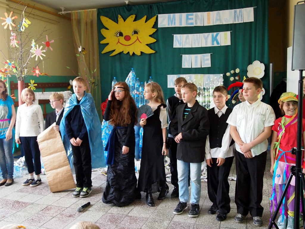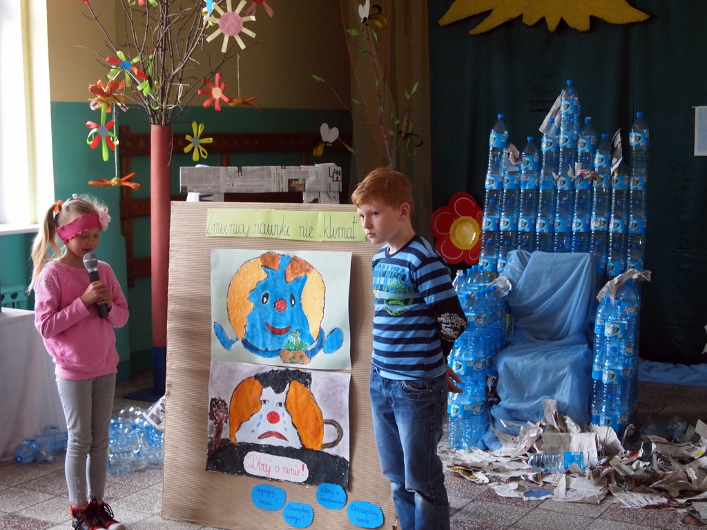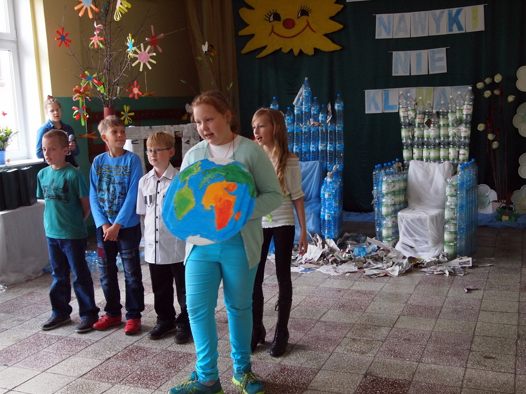 Uczniowie klas I – III brali udział w konkursach: najdłuższy wąż z butelek, zgniatanie go na czas oraz Zielona Piramida Marzeń. Uczniowie klas IV – VI wykonali plakaty „Drzewo dobrych nawyków”. Na obchodach Dnia Ziemi przedstawili przygotowane piosenki ekologiczne i list Ziemi do ludzi zawierający prośbę o zachowanie jej dla przyszłych pokoleń. Zmagania sportowe dla klas starszych polegały na zgniataniu butelek na czas oraz rzutach puszką do celu. W kategorii klas I- III zwyciężyła klasa III natomiast pierwsze miejsce wśród klas starszych zajęli piątoklasiści. Zwycięzcom nagrody wręczyli pani dyrektor Beata Kubacka oraz nasi goście pani Edyta Majorek i pan Marek Ptak.