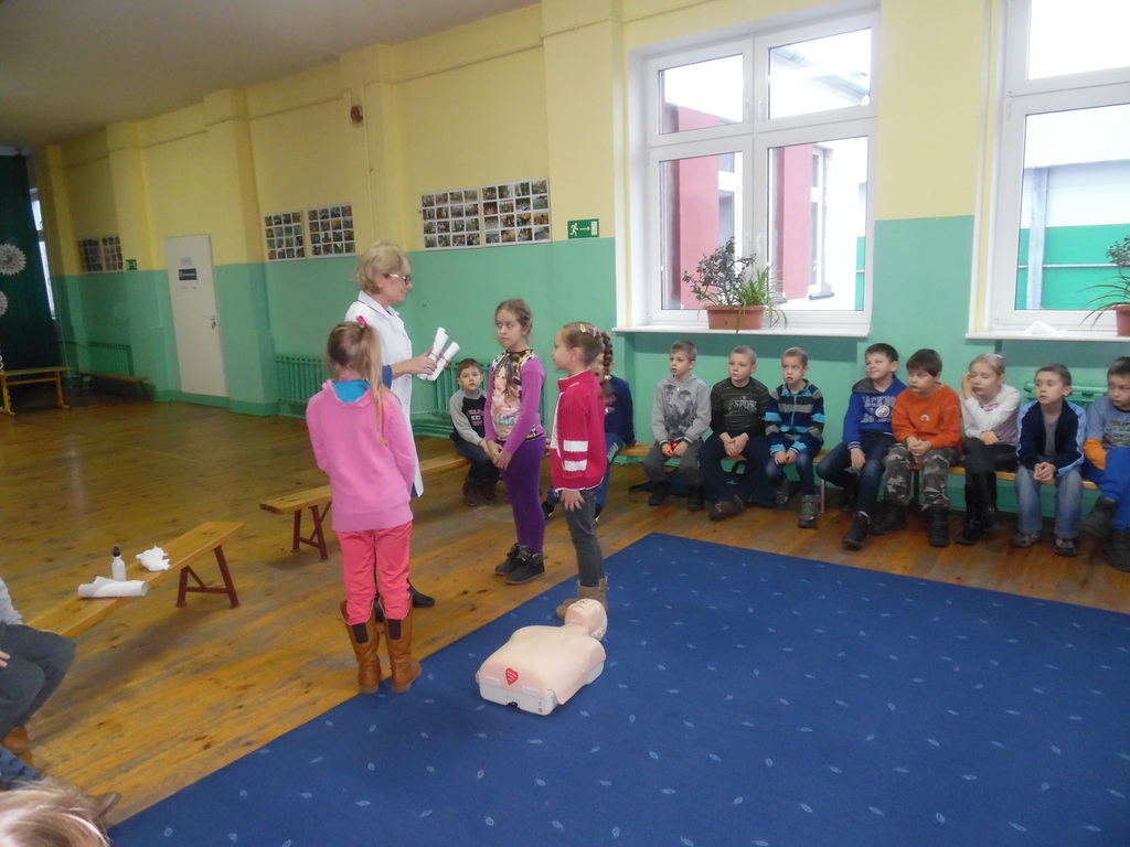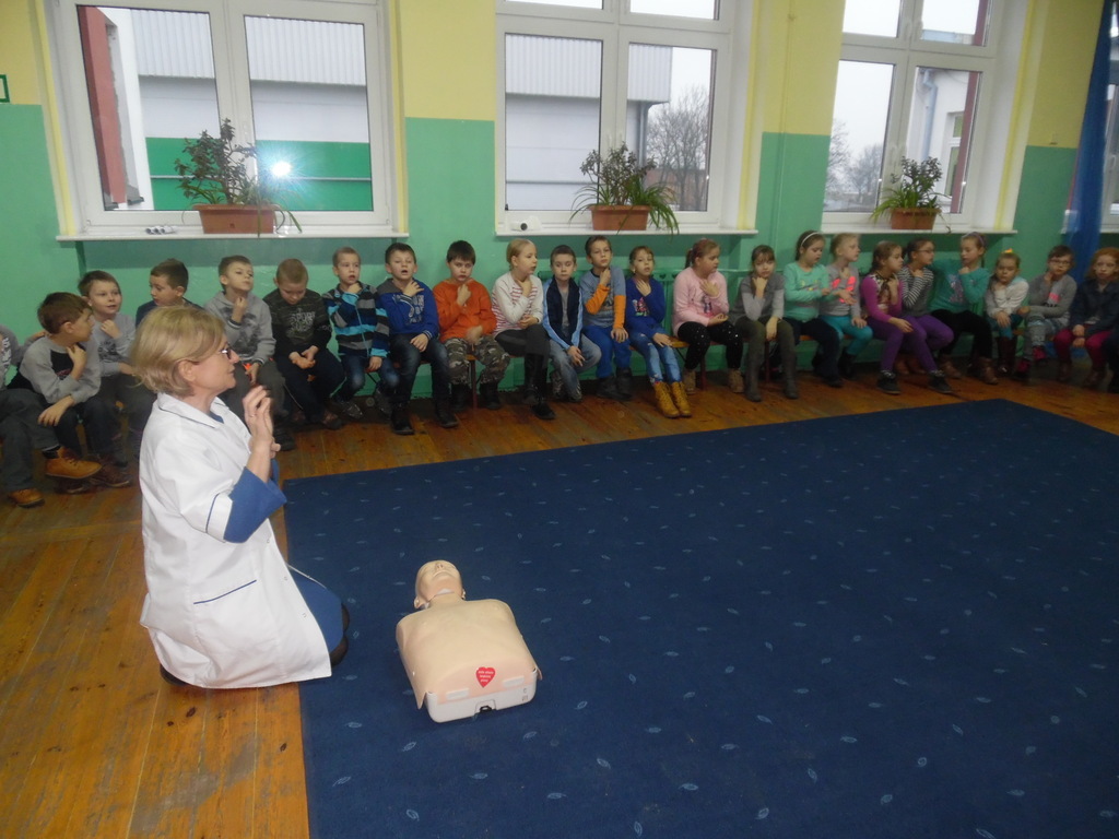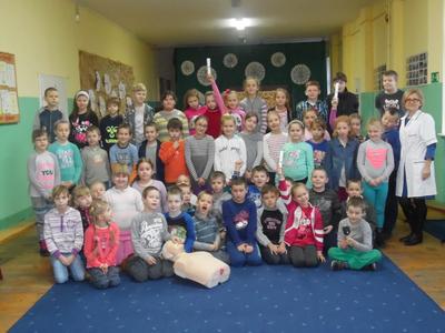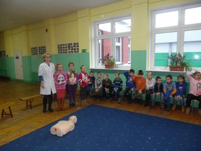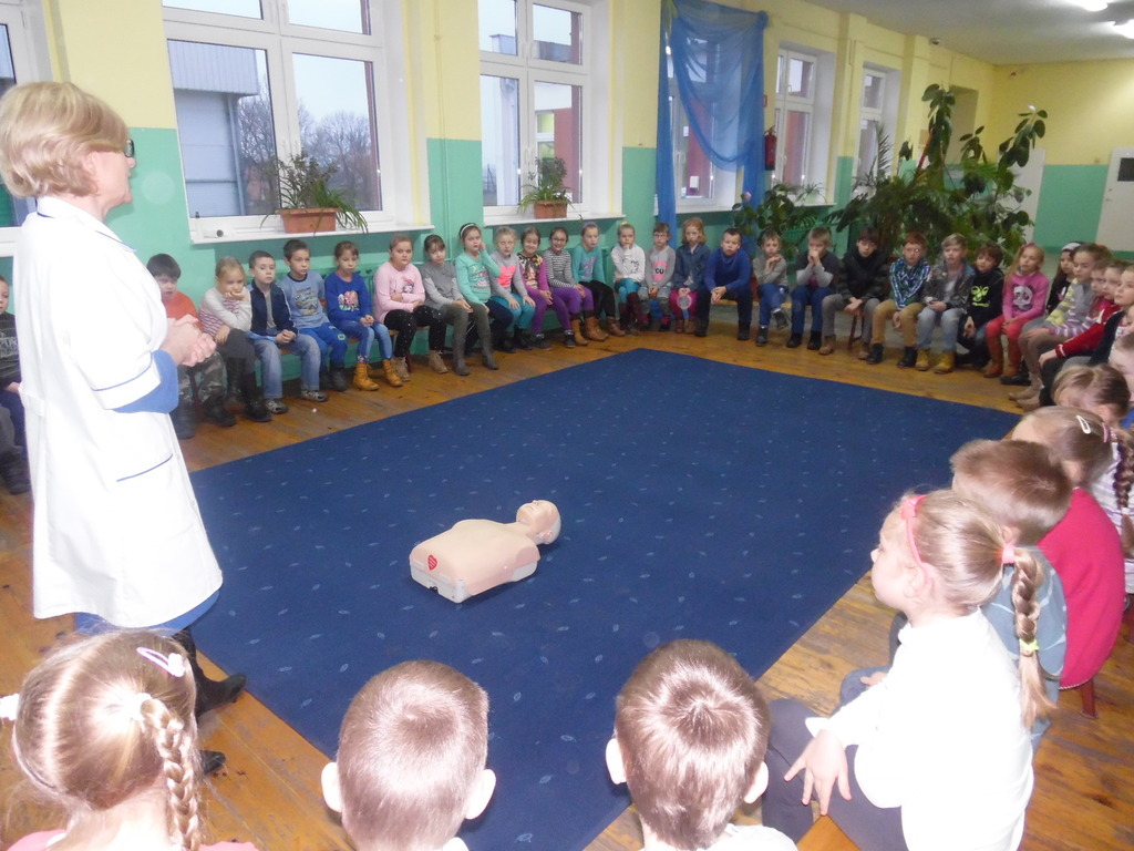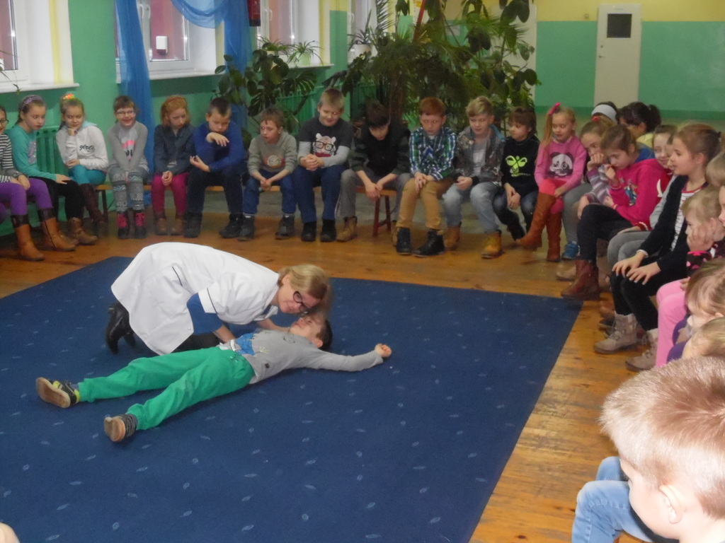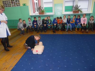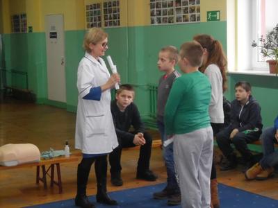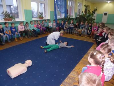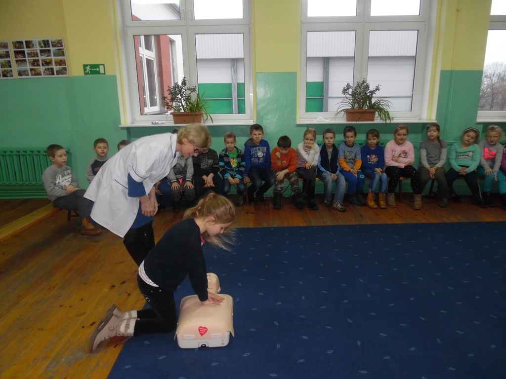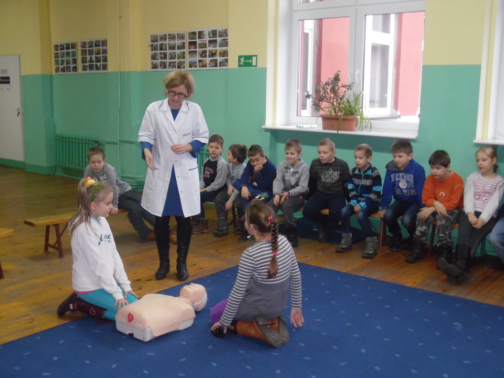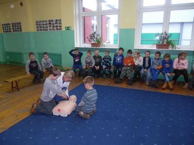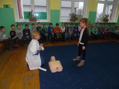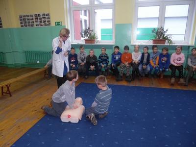 Dnia 21 stycznia br. w ramach konkursu „ BEZPIECZNA SZKOŁA, BEZPIECZNY UCZEŃ” odbyło się szkolenie z pierwszej pomocy przedmedycznej, które przeprowadziła pani pielęgniarka Agata Szwarc. Podczas zajęć uczniowie, podzieleni na dwie grupy wiekowe – kl. I – III i kl. IV - VI, mieli okazję obserwować, w jaki sposób należy się zachować w nagłych wypadkach oraz jak udzielić pierwszej pomocy osobie poszkodowanej. Chętni uczniowie przystąpili również do ćwiczeń praktycznych z wykorzystaniem fantoma.