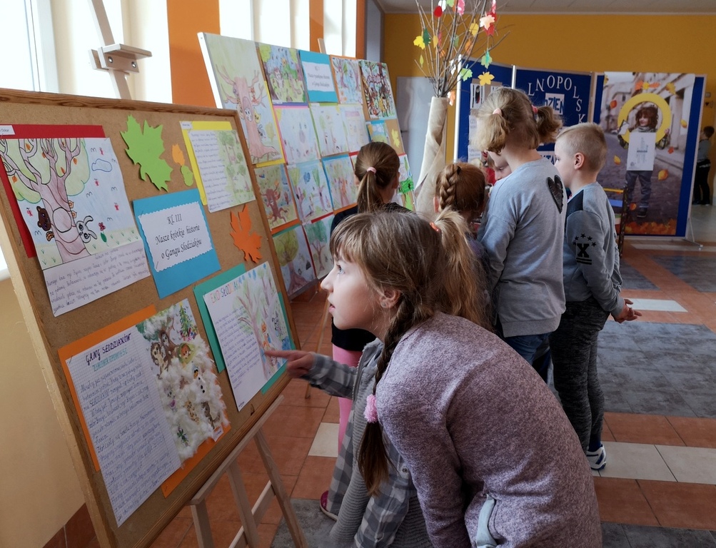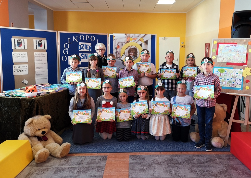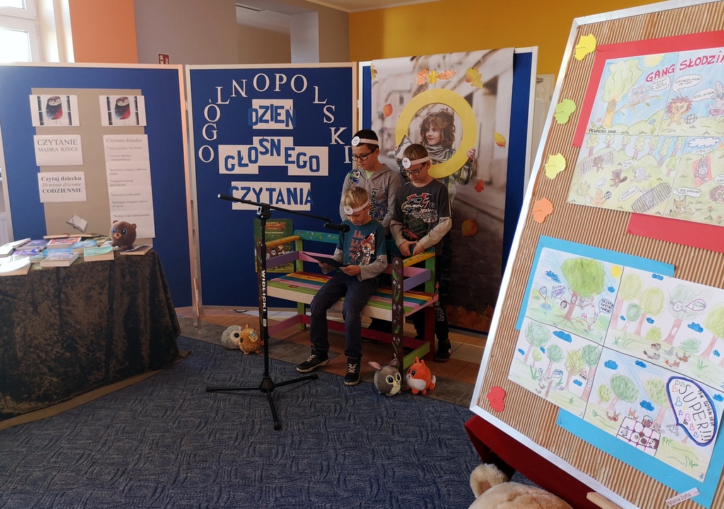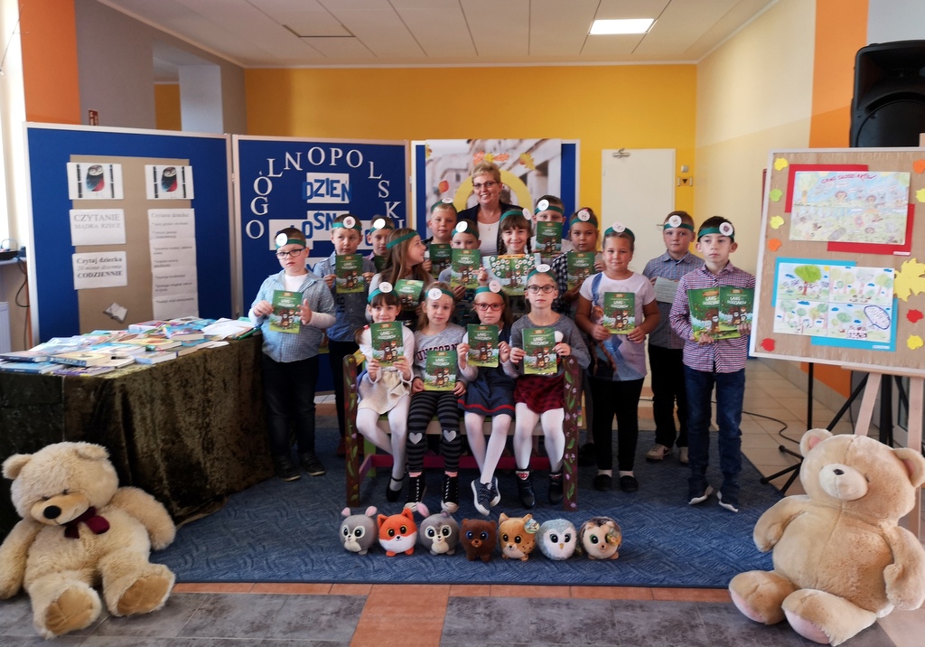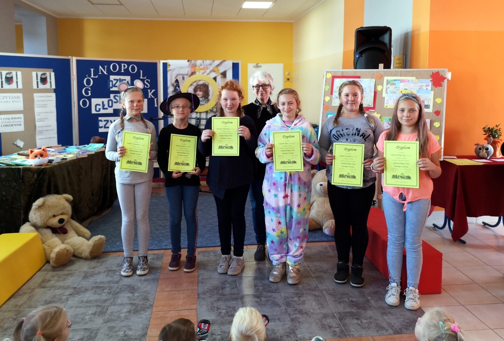 W piątek obchodziliśmy w naszej szkole Dzień Głośnego Czytania. W ramach "Literackich fascynacji", każda chętna osoba mogła tego dnia zaprezentować fragment swojej ulubionej książki. Inspiracją do przygody z literaturą i wzięcia udziału w zmaganiach, szczególnie dla uczniów z klas I - III stały się opowieści o przygodach Słodziaków, opisane w książce Renaty Piątkowskiej pt. " Co słychać na leśnej polanie, czyli wesołe przygody Gangu Słodziaków." Nasi młodsi koledzy przygotowali wspaniałe prace plastyczne oraz plastyczno - literackie, które można było podziwiać na przygotowanej wystawie. Swoją obecnością zaszczyciły nas też przedszkolaki, które z wielkim zainteresowaniem słuchały fragmentów czytanych książek. Dodatkową atrakcją tego dnia byli uczniowie przebrani w barwne i ciekawe stroje ukazujące bohaterów literackich. Dla zainteresowanych głośne czytanie odbywało się także podczas przerwy.