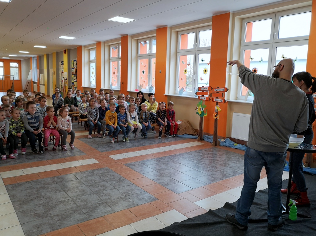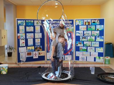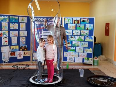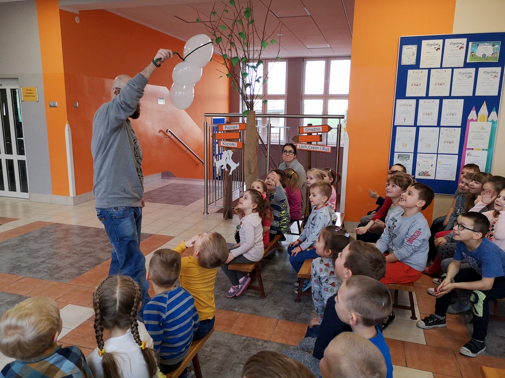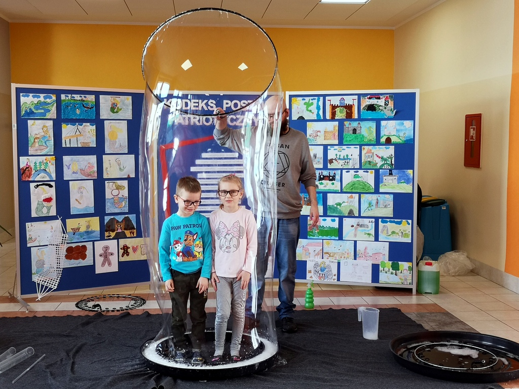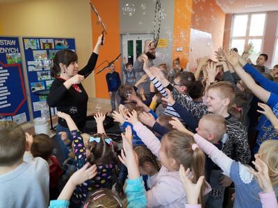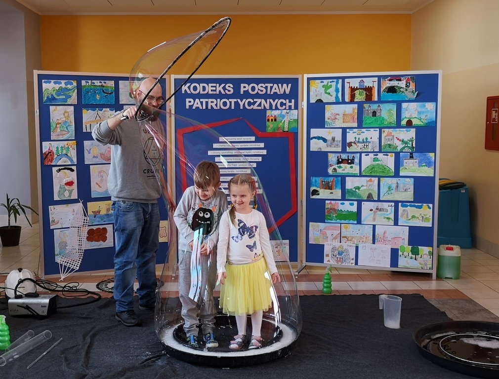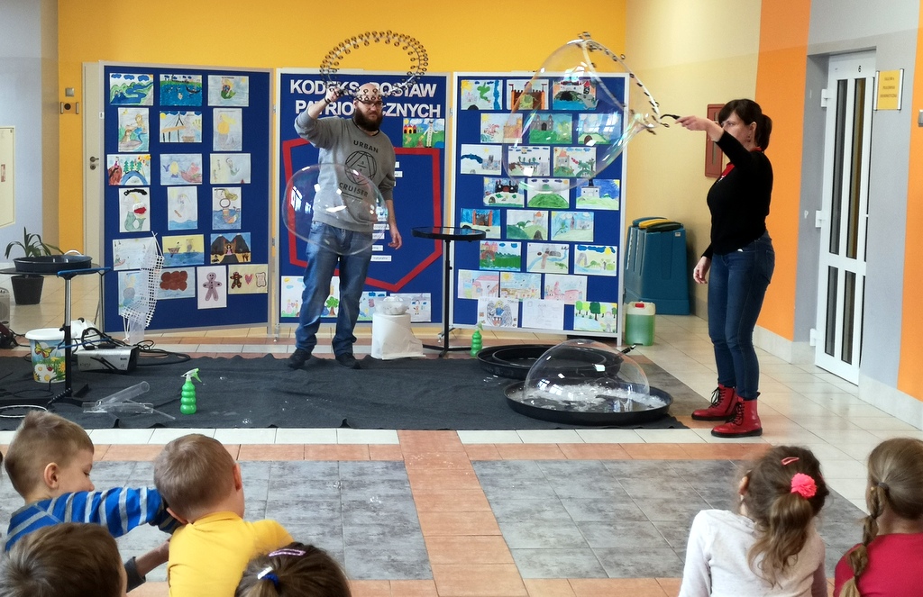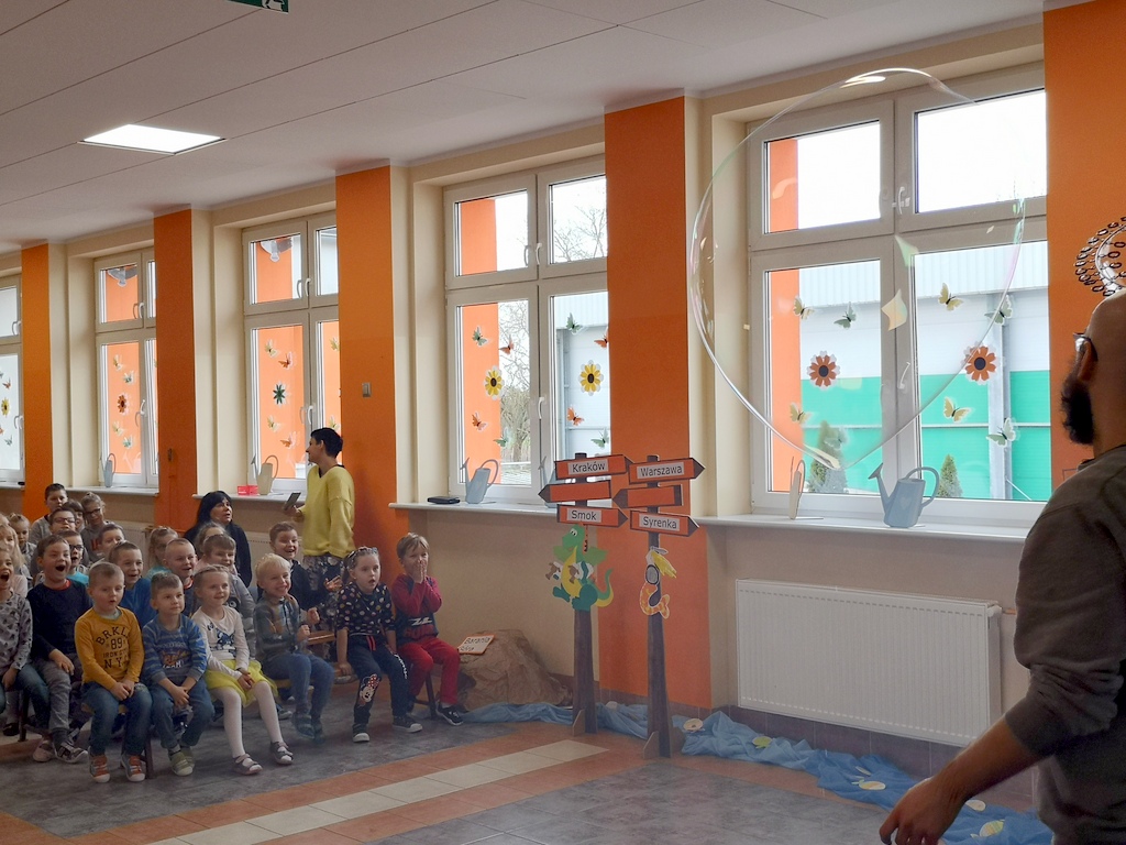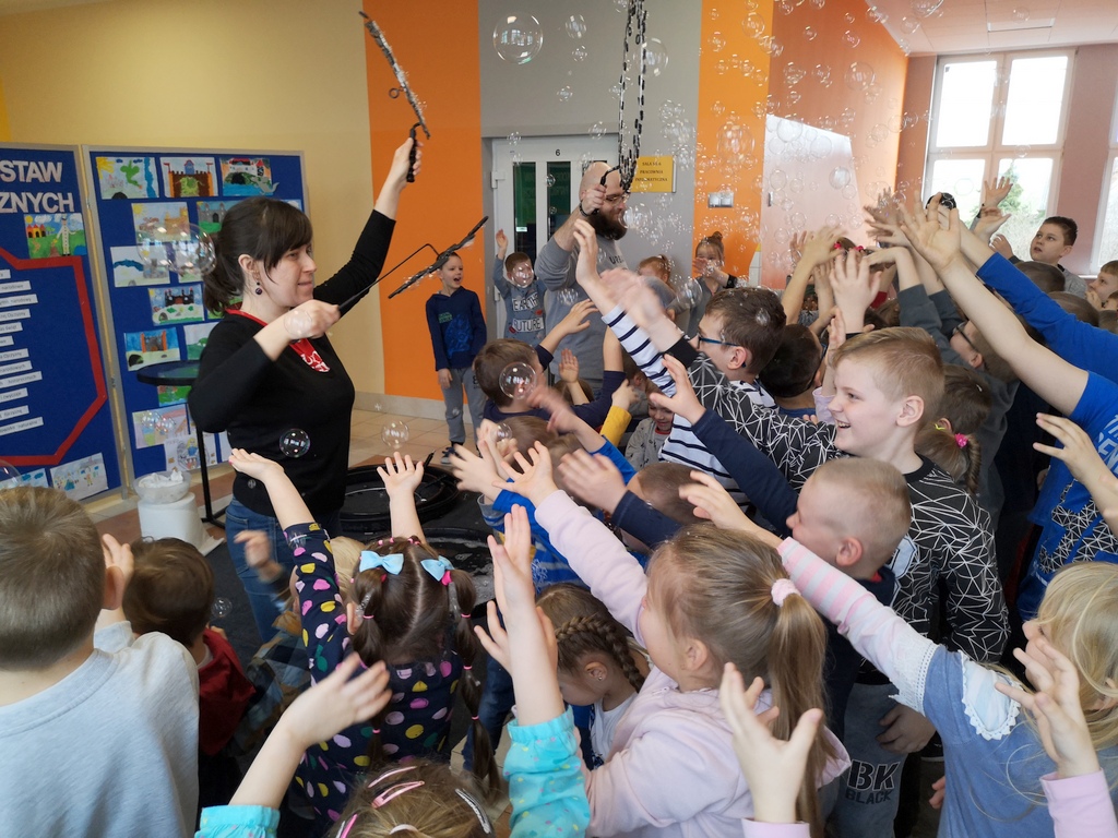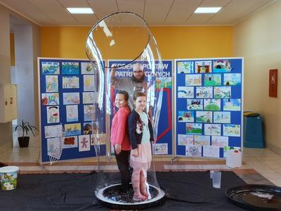 W poniedziałek 4 marca br. odbył się pokaz pt.” Bańki mydlane”, w wykonaniu Agencji Artystycznej Bulle z Gniezna. Przedszkolakom oraz uczniom z klas I – III zostały zaprezentowane bańki różnych rozmiarów i kolorów. Dzieci chętnie występowały w roli pomocników p. Magdy i p. Wojtka. Największą atrakcją była możliwość zamknięcia w bańce mydlanej każdego z uczestników spotkania.