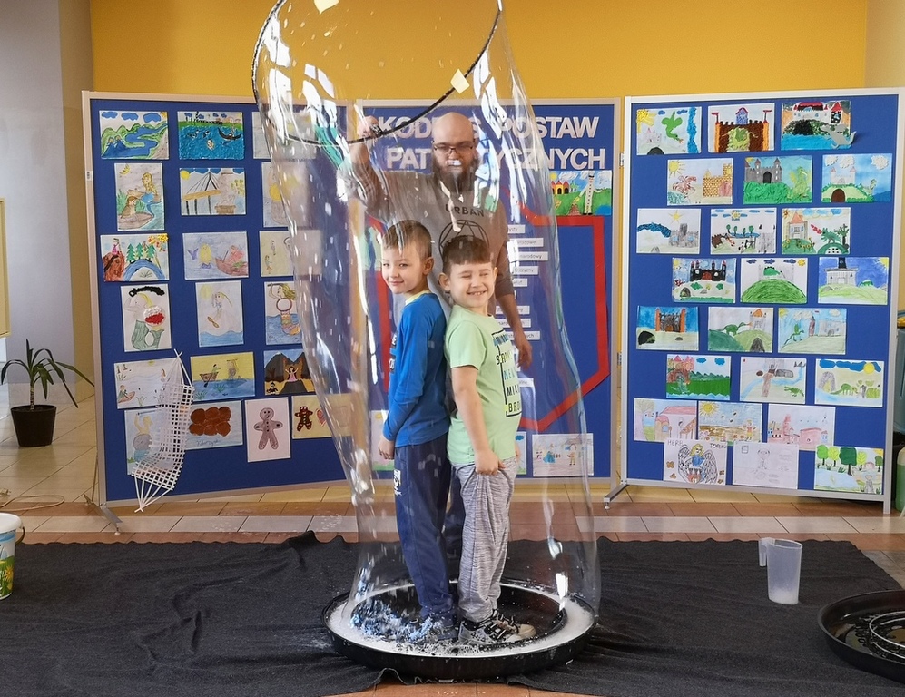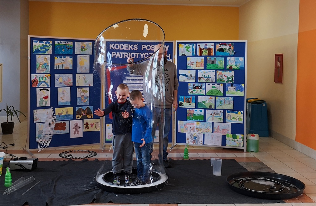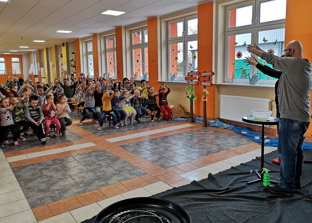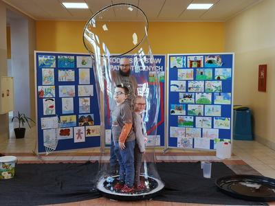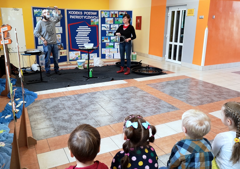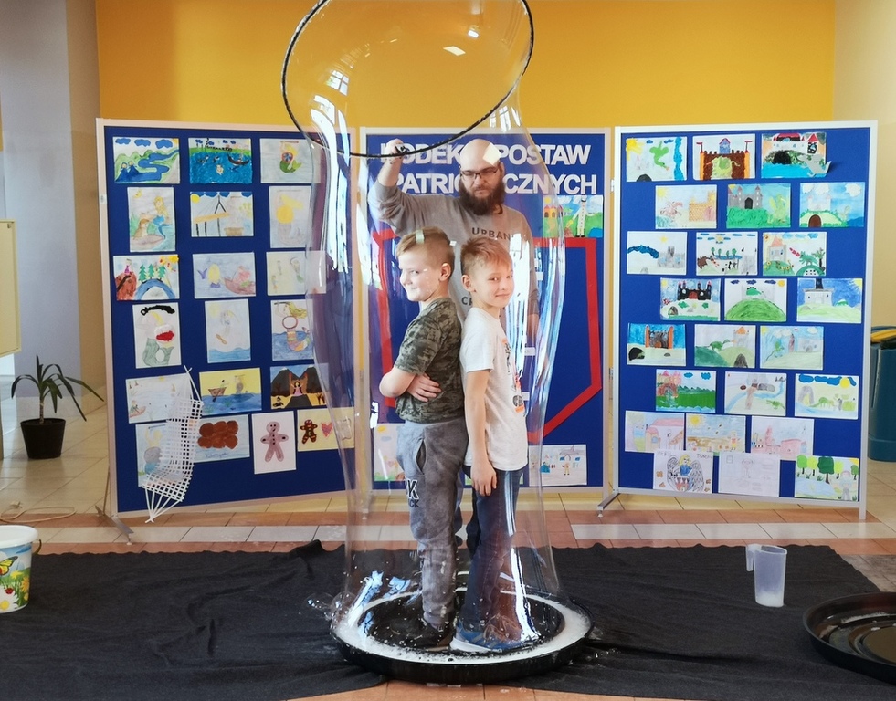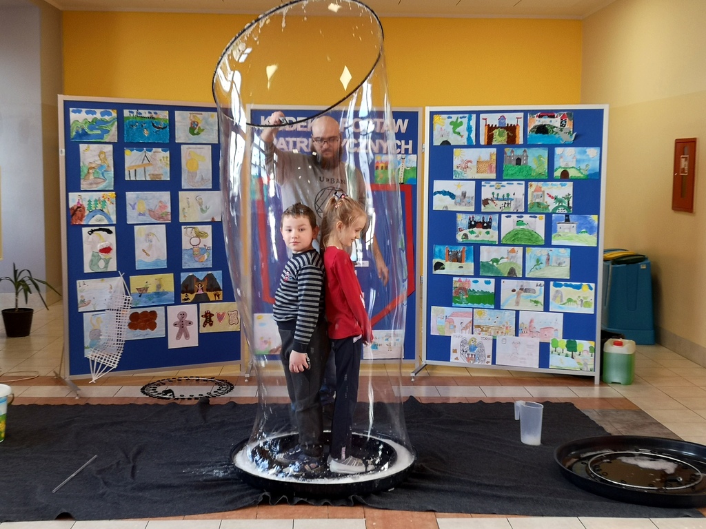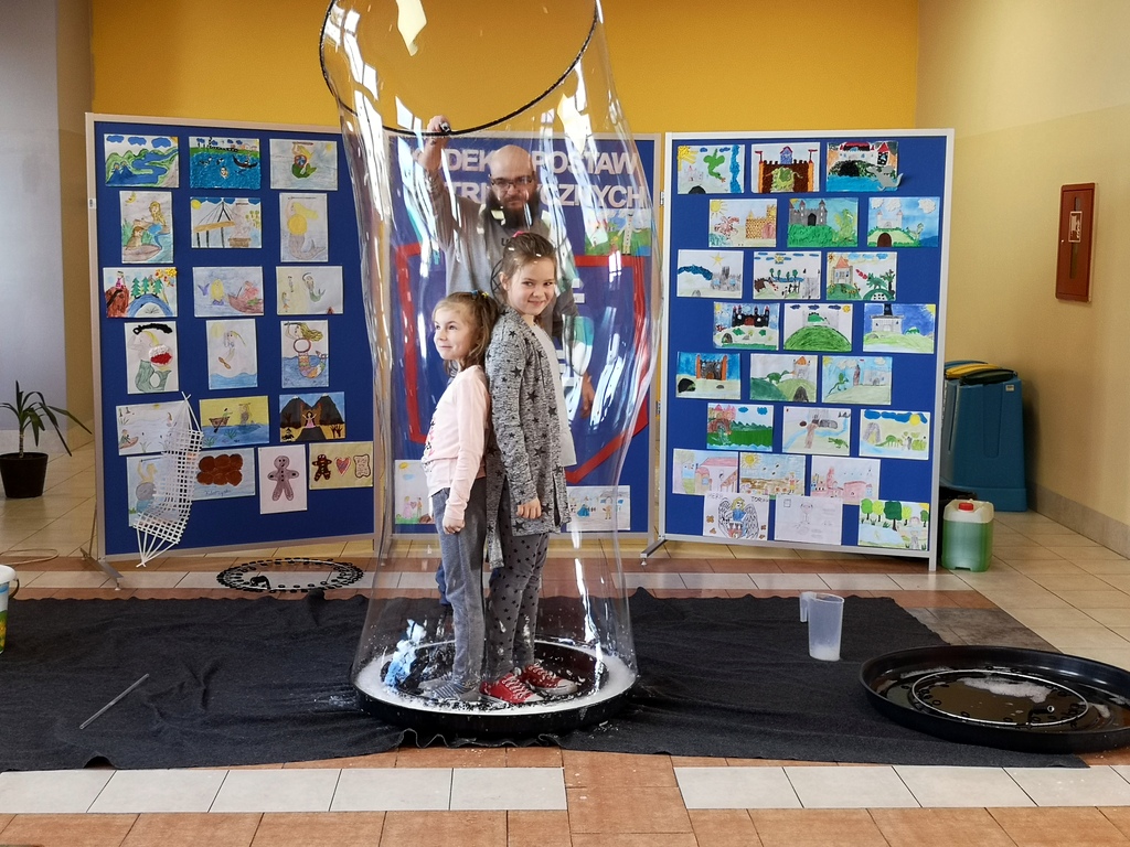 W poniedziałek 4 marca br. odbył się pokaz pt.” Bańki mydlane”, w wykonaniu Agencji Artystycznej Bulle z Gniezna. Przedszkolakom oraz uczniom z klas I – III zostały zaprezentowane bańki różnych rozmiarów i kolorów. Dzieci chętnie występowały w roli pomocników p. Magdy i p. Wojtka. Największą atrakcją była możliwość zamknięcia w bańce mydlanej każdego z uczestników spotkania.
