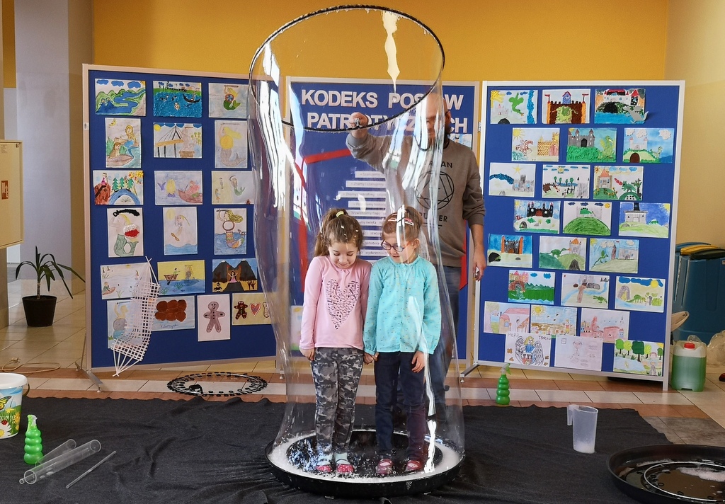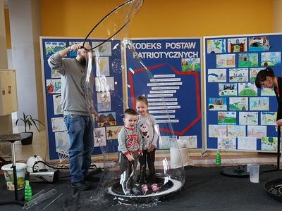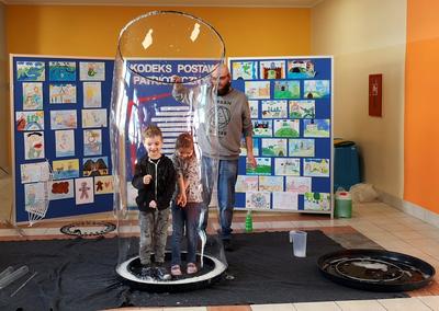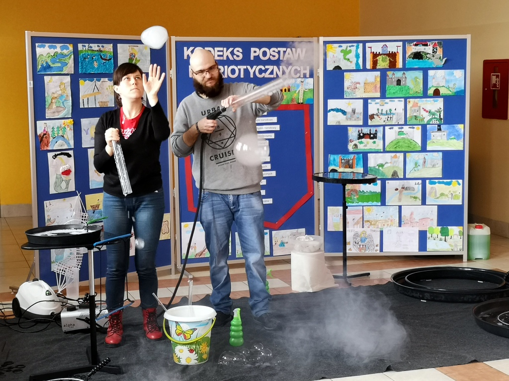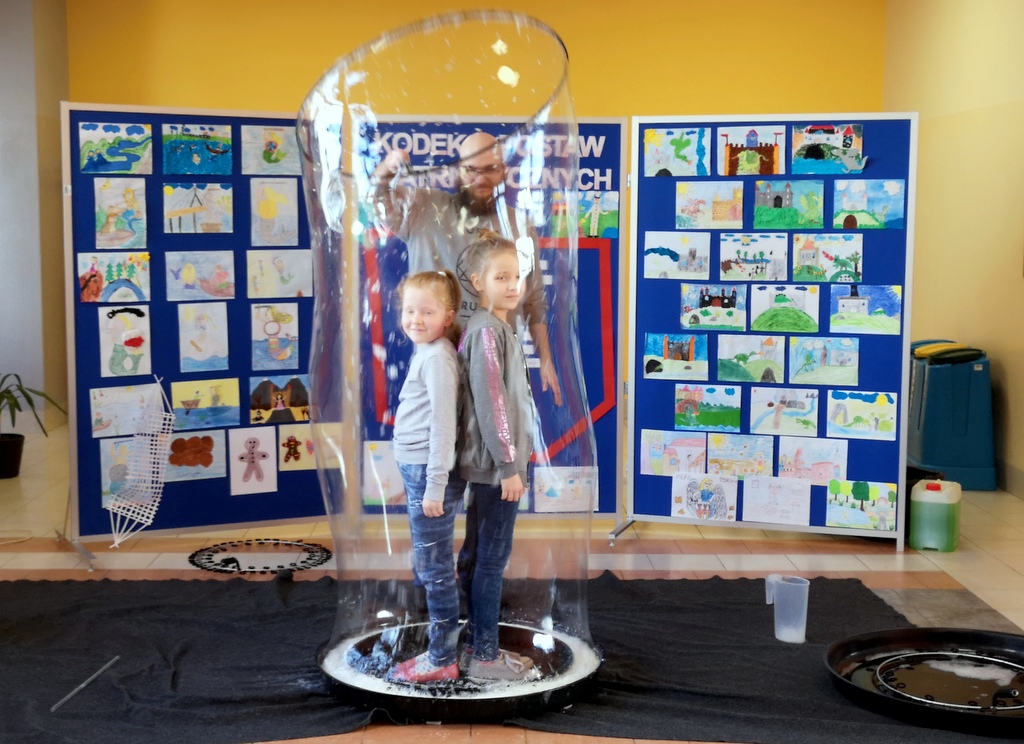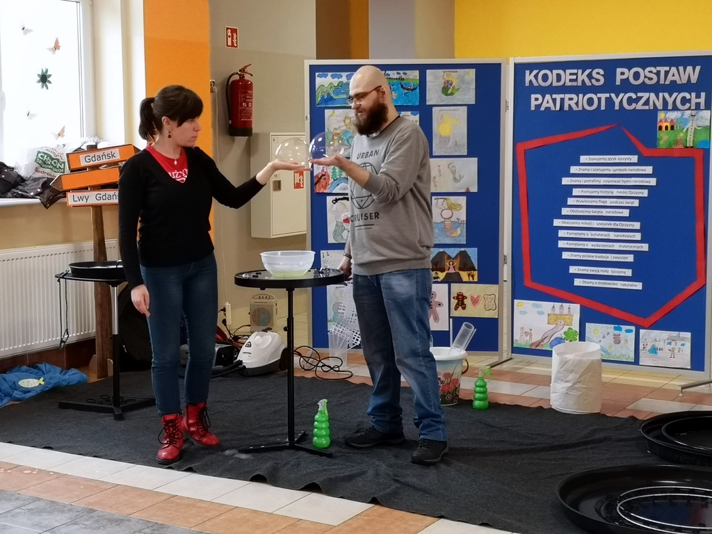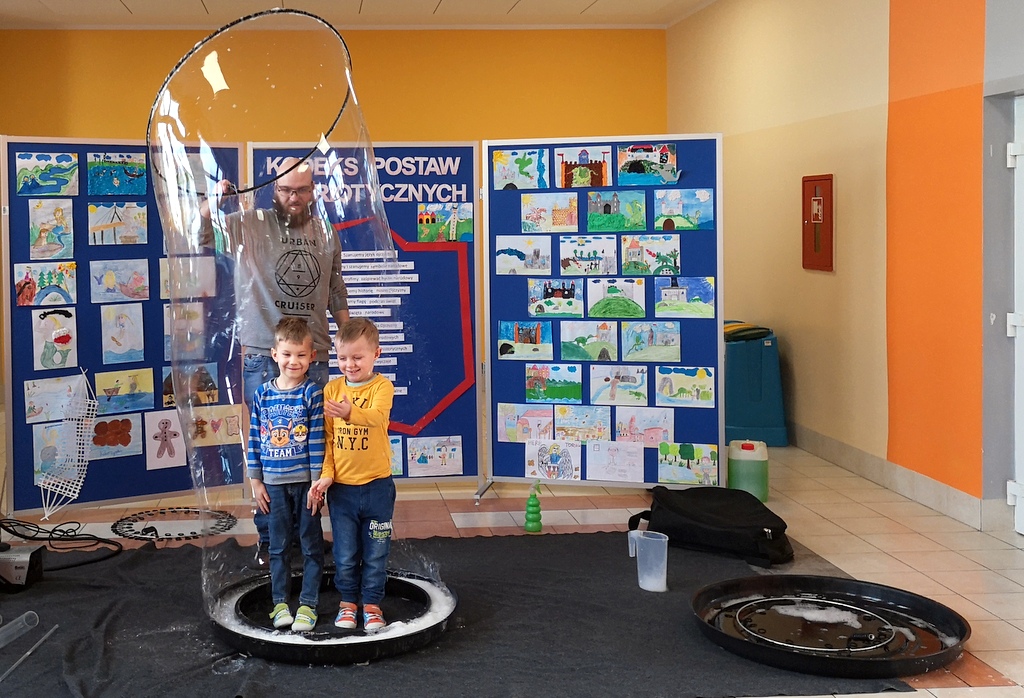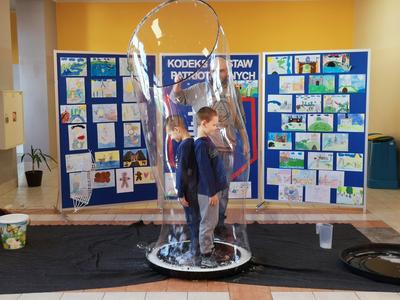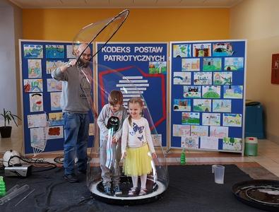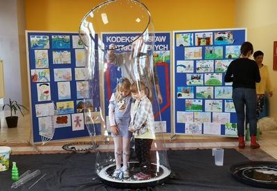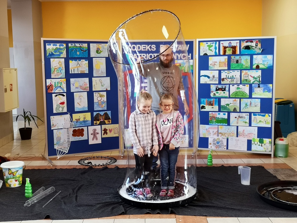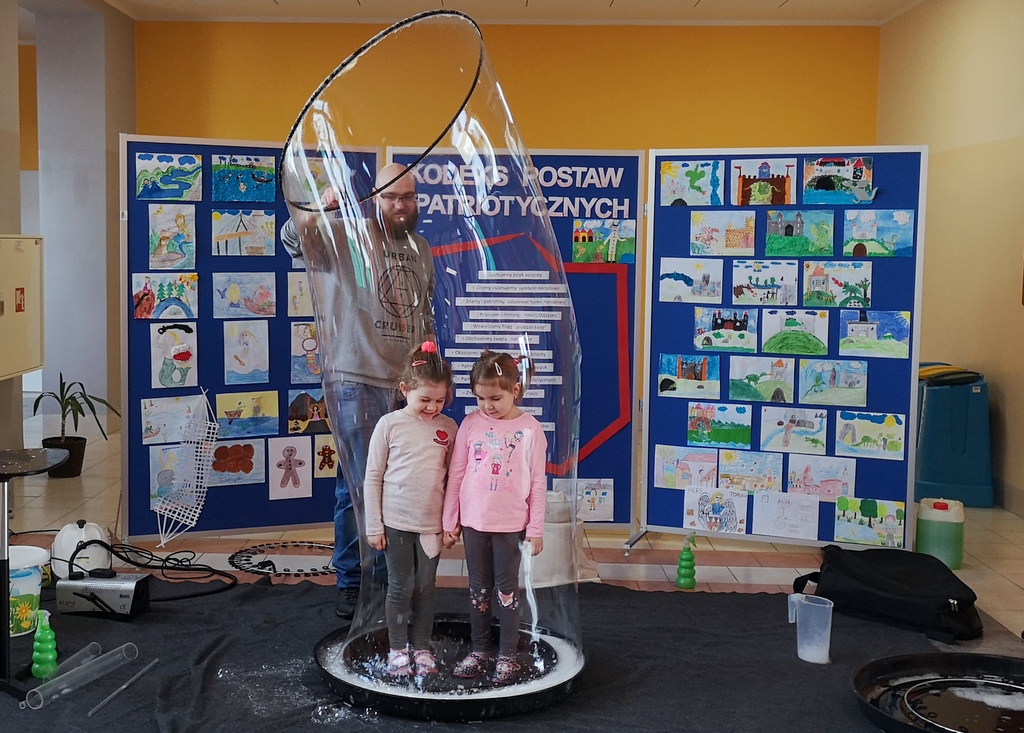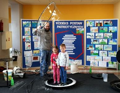 W poniedziałek 4 marca br. odbył się pokaz pt.” Bańki mydlane”, w wykonaniu Agencji Artystycznej Bulle z Gniezna. Przedszkolakom oraz uczniom z klas I – III zostały zaprezentowane bańki różnych rozmiarów i kolorów. Dzieci chętnie występowały w roli pomocników p. Magdy i p. Wojtka. Największą atrakcją była możliwość zamknięcia w bańce mydlanej każdego z uczestników spotkania.