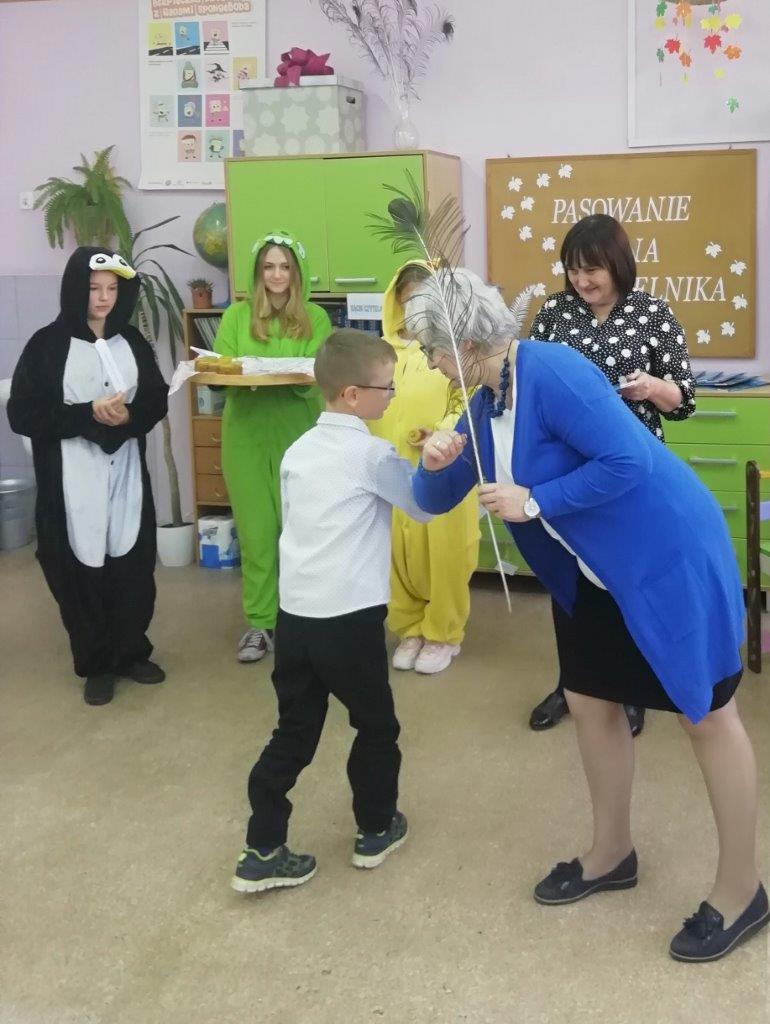 Po zrealizowaniu w/w zadań przyszli czytelnicy złożyli uroczyste przyrzeczenie, że zawsze będą szanować książki, a pani Dyrektor pawim piórem dokonała pasowania każdego z uczniów.