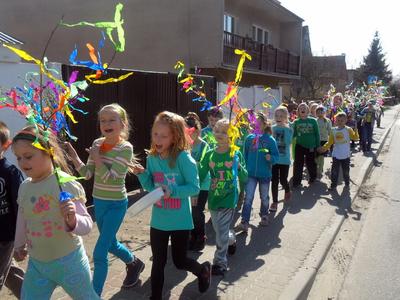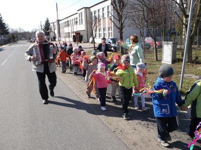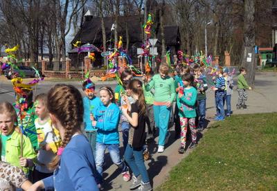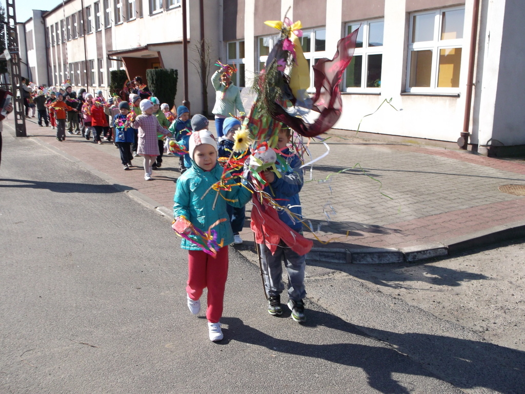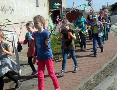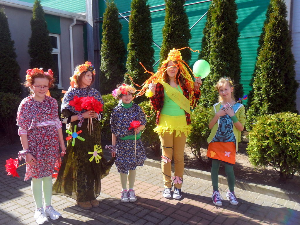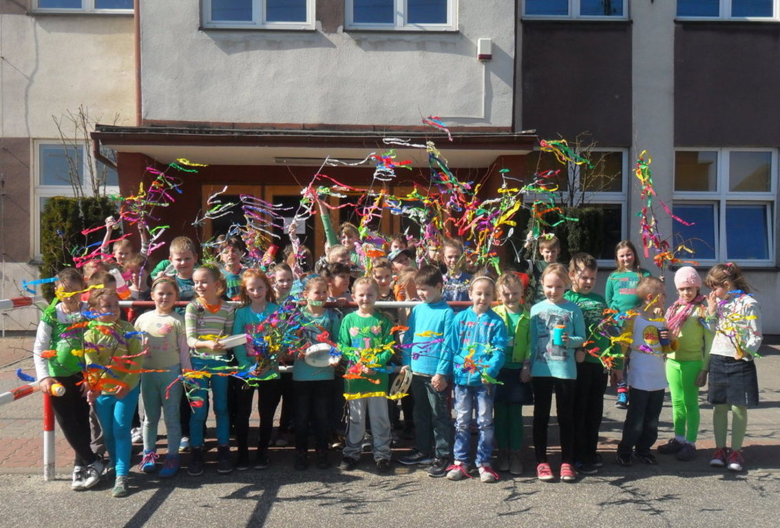 W podobny sposób wiosnę przywitali uczniowie klas I-III, którzy samodzielnie wykonali wiosenne gaiki i instrumenty perkusyjne. Tego dnia dominującym kolorem był kolor zielony.