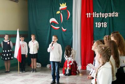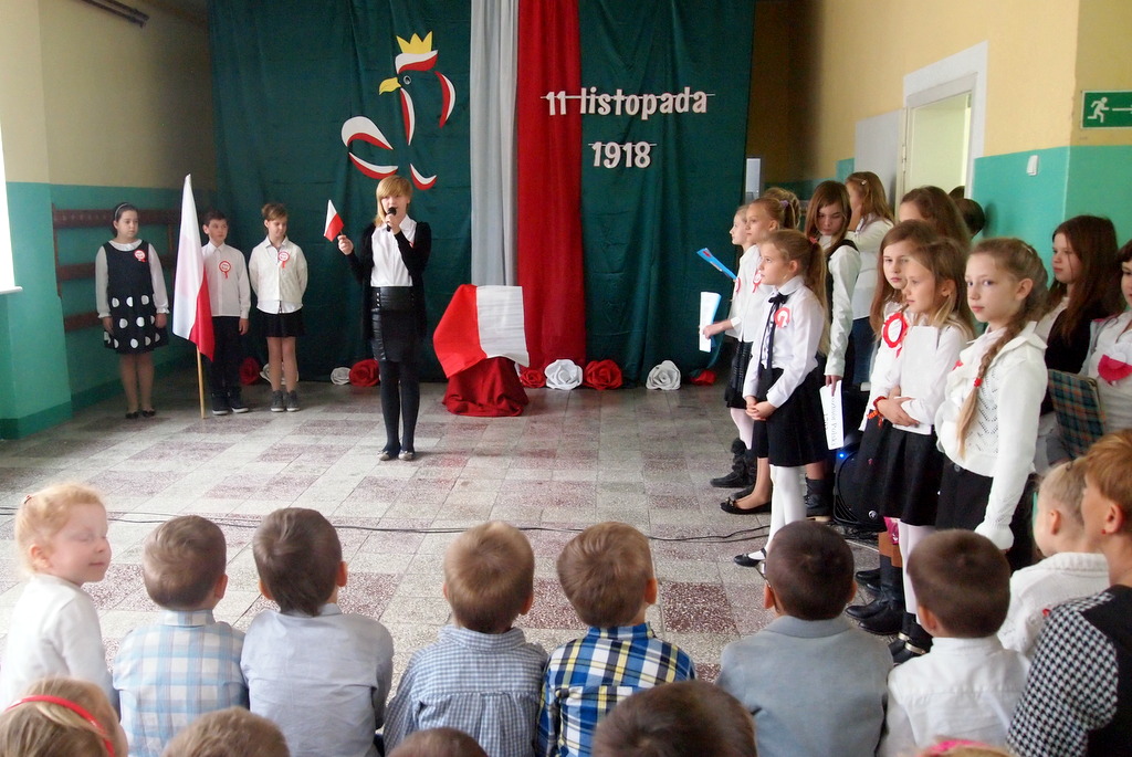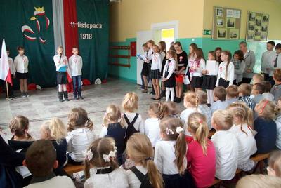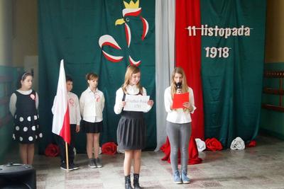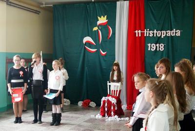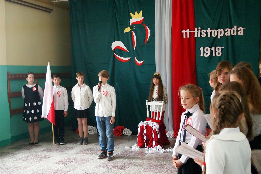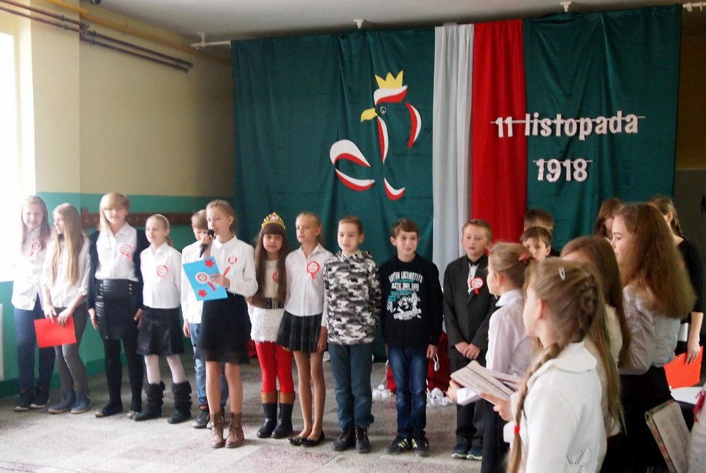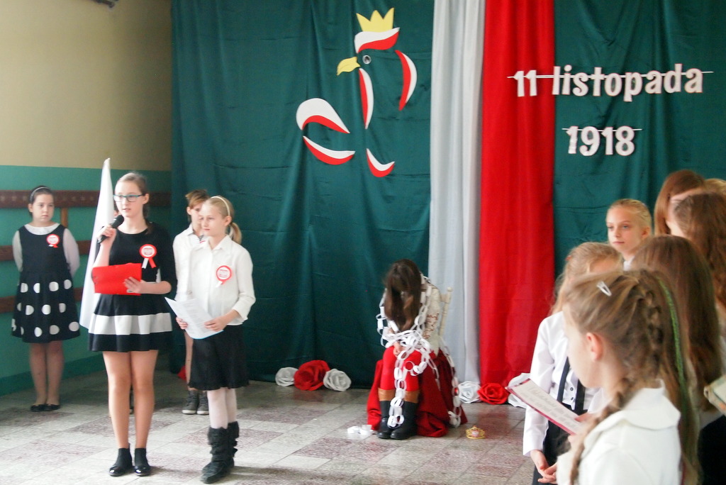 Dzień Niepodległości uczciliśmy uroczystą akademią pt. „Barwy naszej Ojczyzny” w dniu 12 listopada 2015 r. Wiersze patriotyczne recytowali uczniowie klasy V, a słowo wiążące wygłosiły uczennice klasy VI. Uroczysty nastrój podkreślały piękne dekoracje przygotowane przez panią Hannę Manię oraz wspaniały śpiew w wykonaniu naszych uczniów i uczennic z klas IV – VI pod kierunkiem pani Bogumiły Nowak. Wszyscy uczniowie w galowych strojach dumnie nosili własnoręcznie wykonane kotyliony oraz biało - czerwone róże.