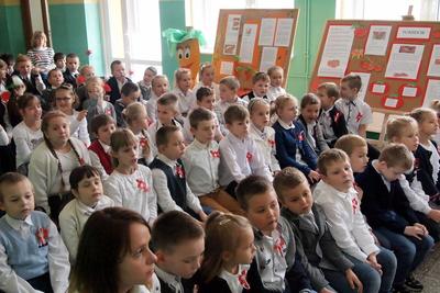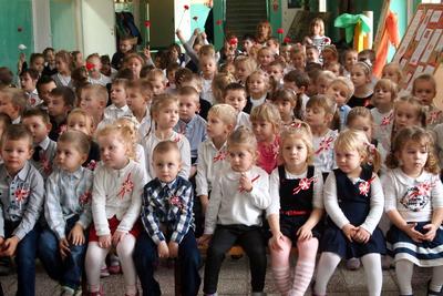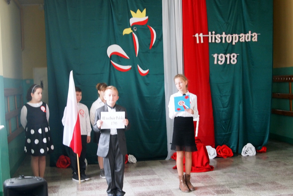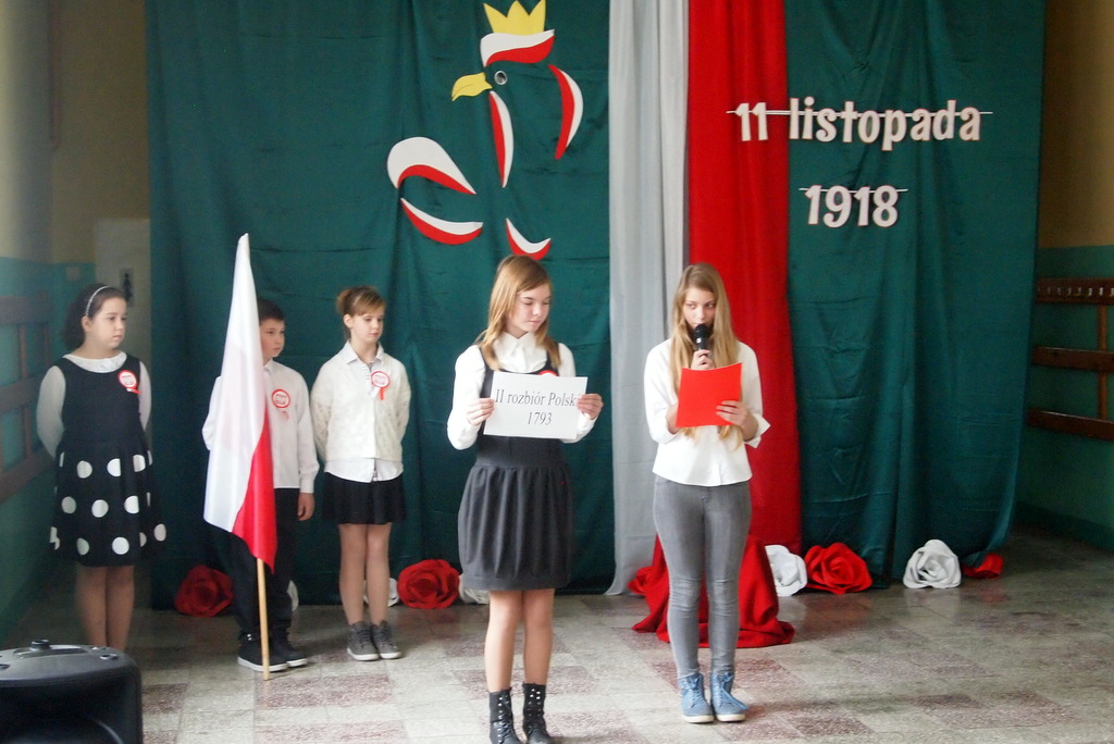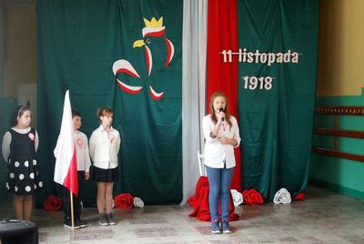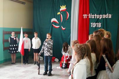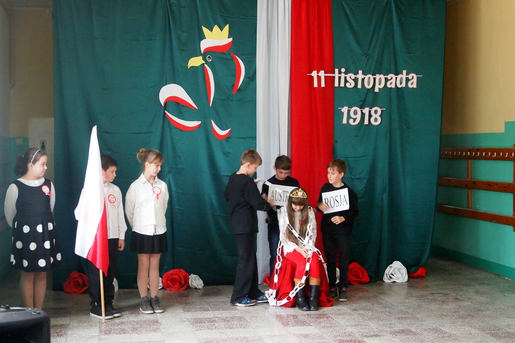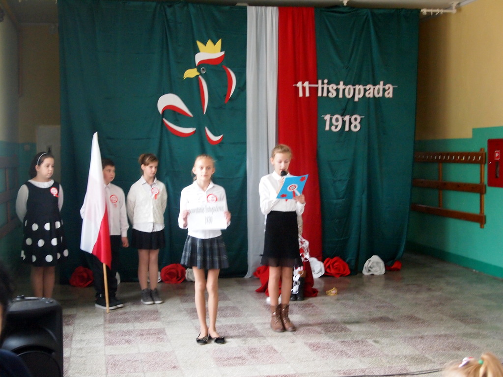 Dzień Niepodległości uczciliśmy uroczystą akademią pt. „Barwy naszej Ojczyzny” w dniu 12 listopada 2015 r. Wiersze patriotyczne recytowali uczniowie klasy V, a słowo wiążące wygłosiły uczennice klasy VI. Uroczysty nastrój podkreślały piękne dekoracje przygotowane przez panią Hannę Manię oraz wspaniały śpiew w wykonaniu naszych uczniów i uczennic z klas IV – VI pod kierunkiem pani Bogumiły Nowak. Wszyscy uczniowie w galowych strojach dumnie nosili własnoręcznie wykonane kotyliony oraz biało - czerwone róże.