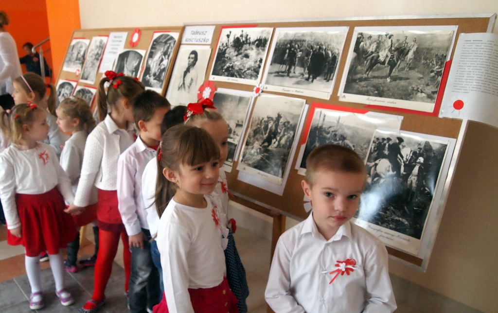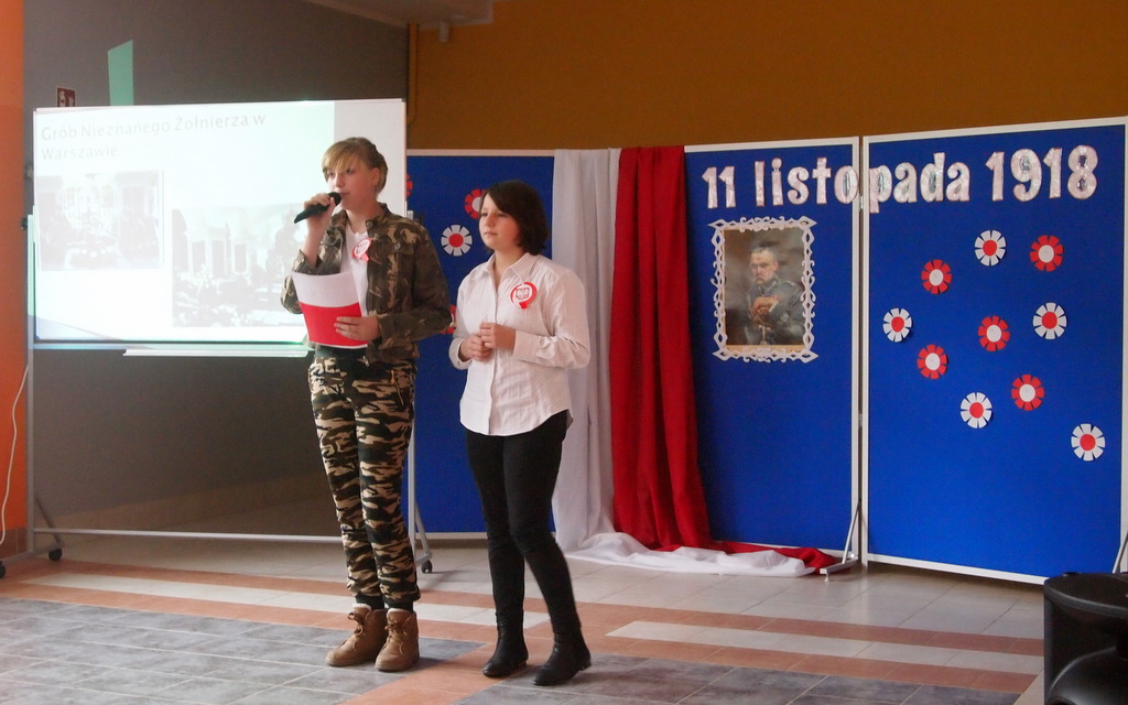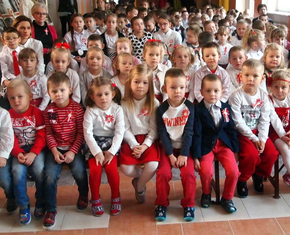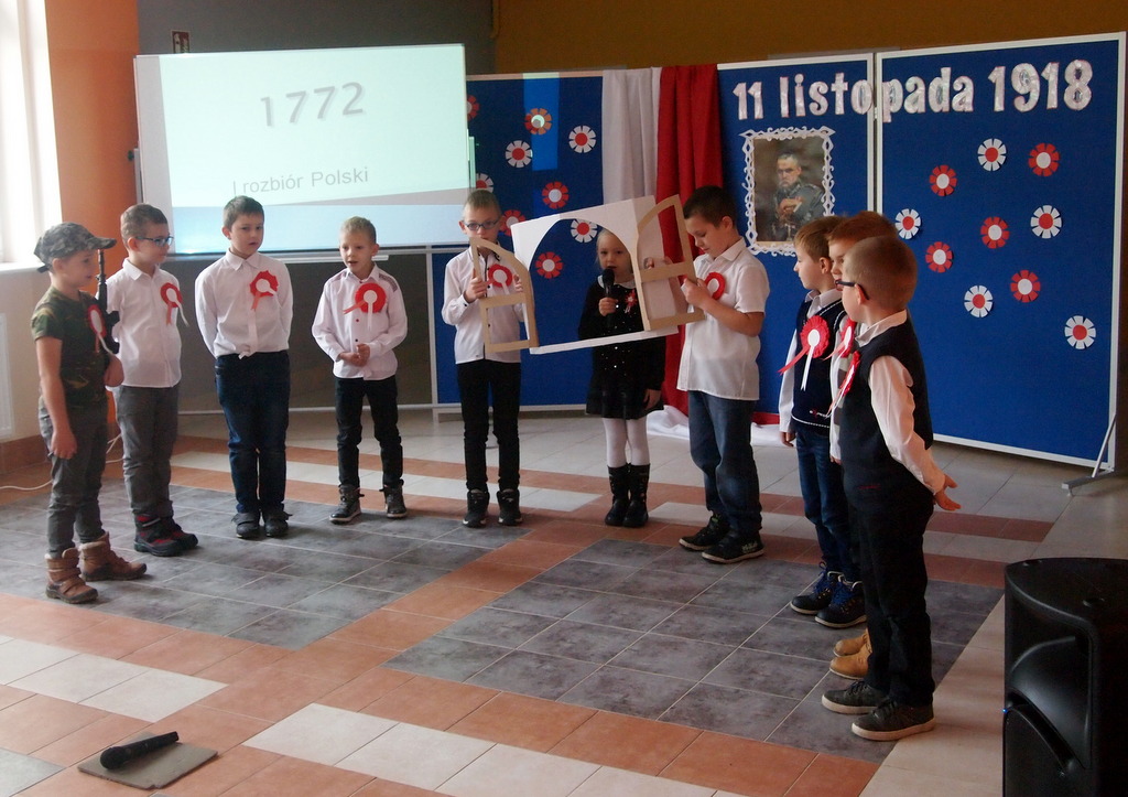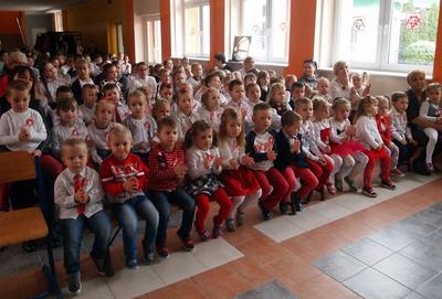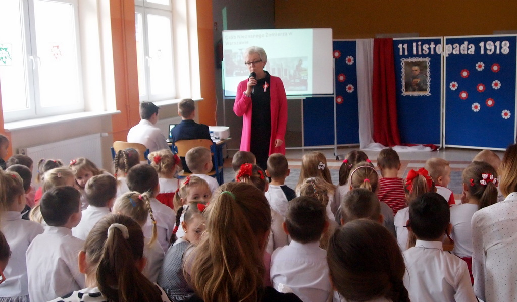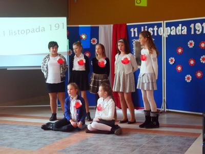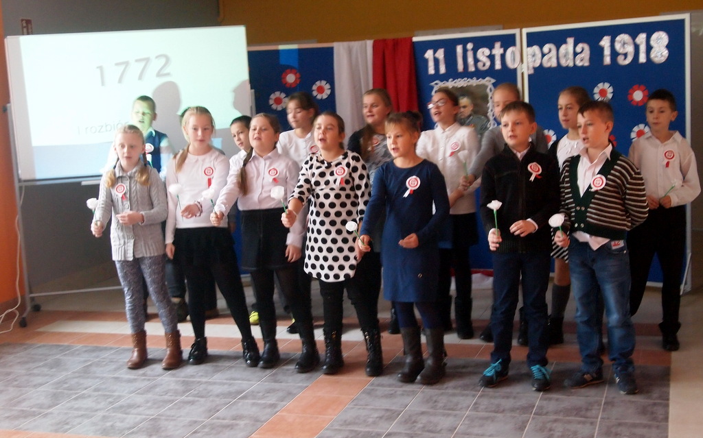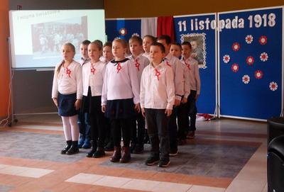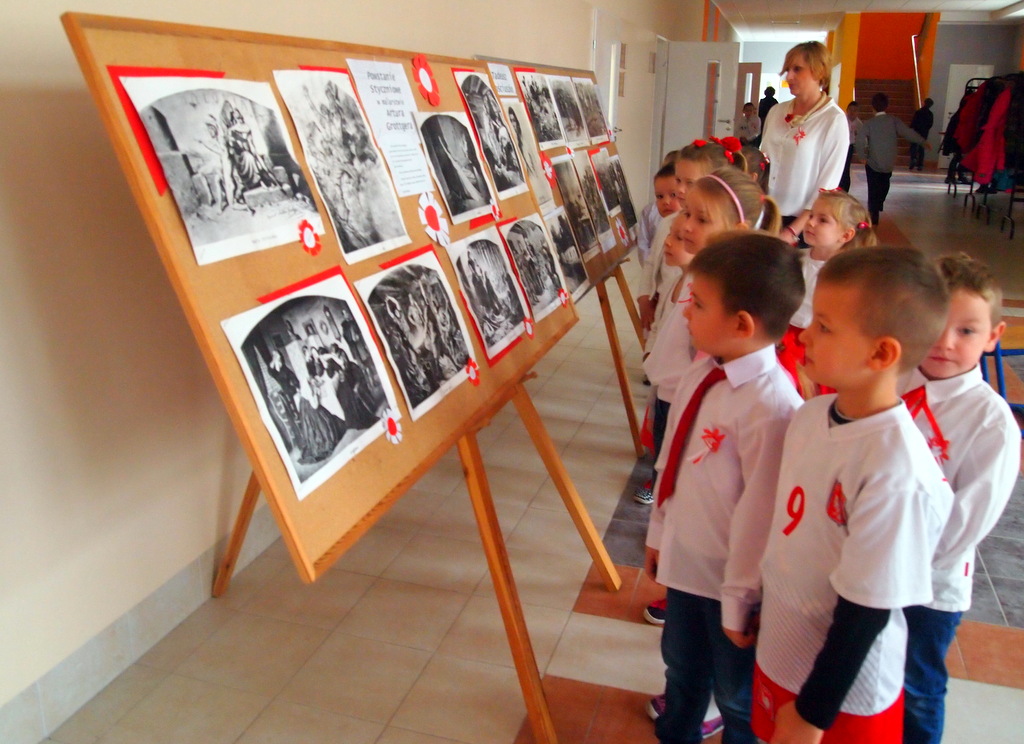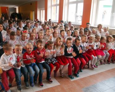 W tym dniu każdy miał przypięty biało-czerwony kotylion, a jedna z grup przedszkolaków na uroczystość przybyła w strojach biało–czerwonych. Na scenie prezentowały się wszystkie klasy, które z tej okazji zaśpiewały patriotyczną piosenkę. Pieśni przeplatane były słowem wiążącym wygłoszonym przez uczennice klasy VI. Podczas występu dzieci oglądały specjalnie na ten dzień przygotowaną prezentację multimedialną. Na zakończenie uroczystego apelu wszyscy wspólnie zaśpiewali Rotę. Po uroczystości uczniowie mogli obejrzeć gazetki tematycznie związane ze Świętem Niepodległości. Wystawę zatytułowano: Powstanie styczniowe w malarstwie Artura Grottgera oraz Tadeusz Kościuszko.