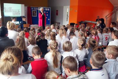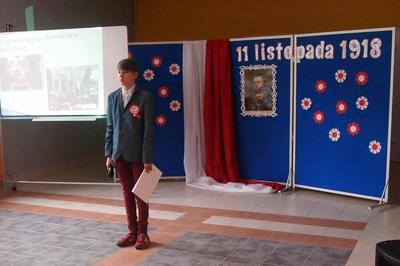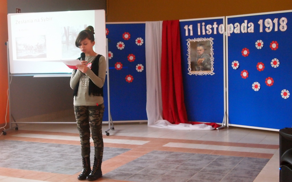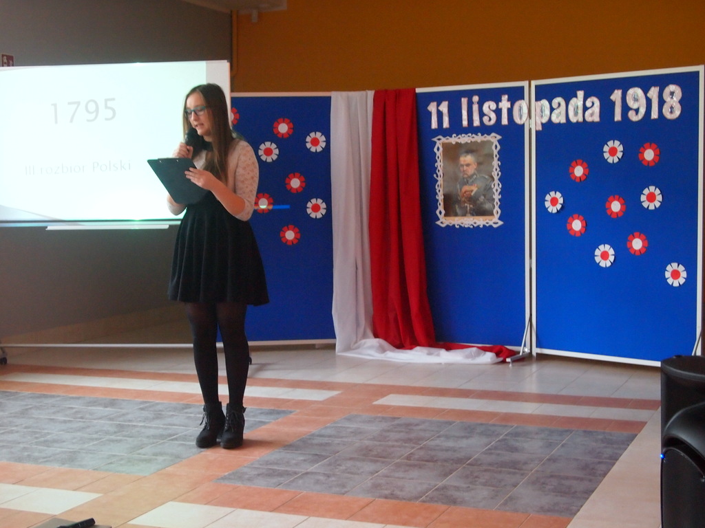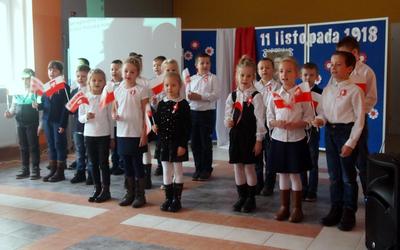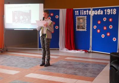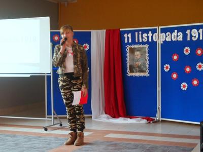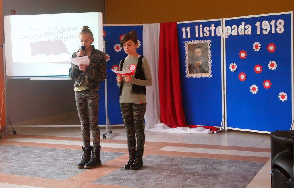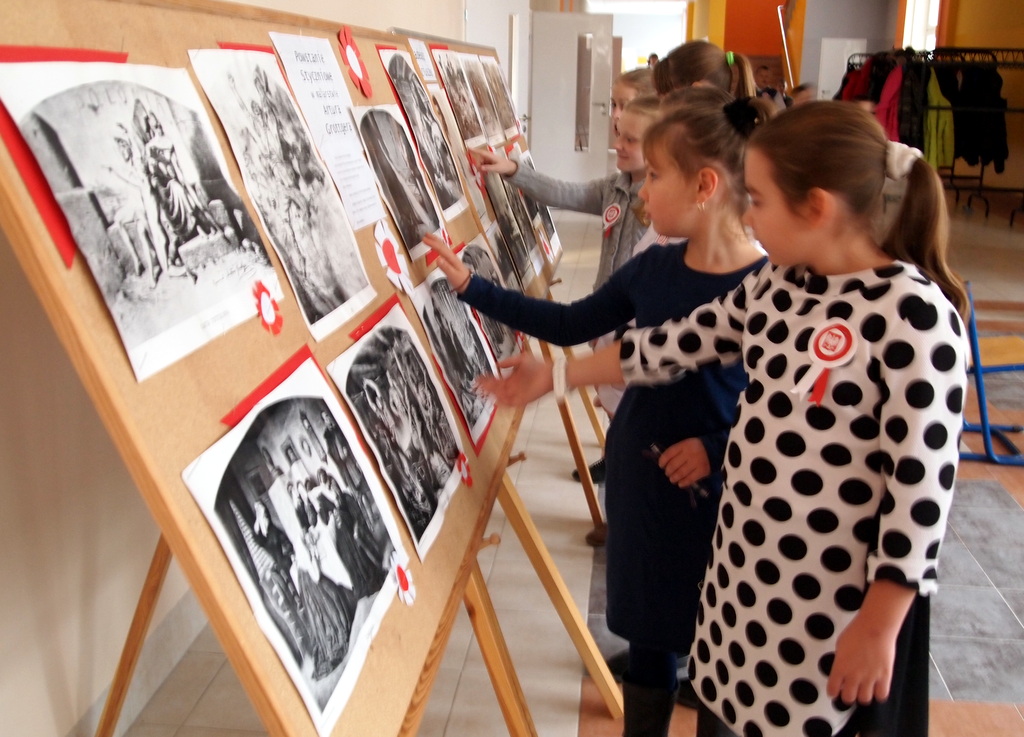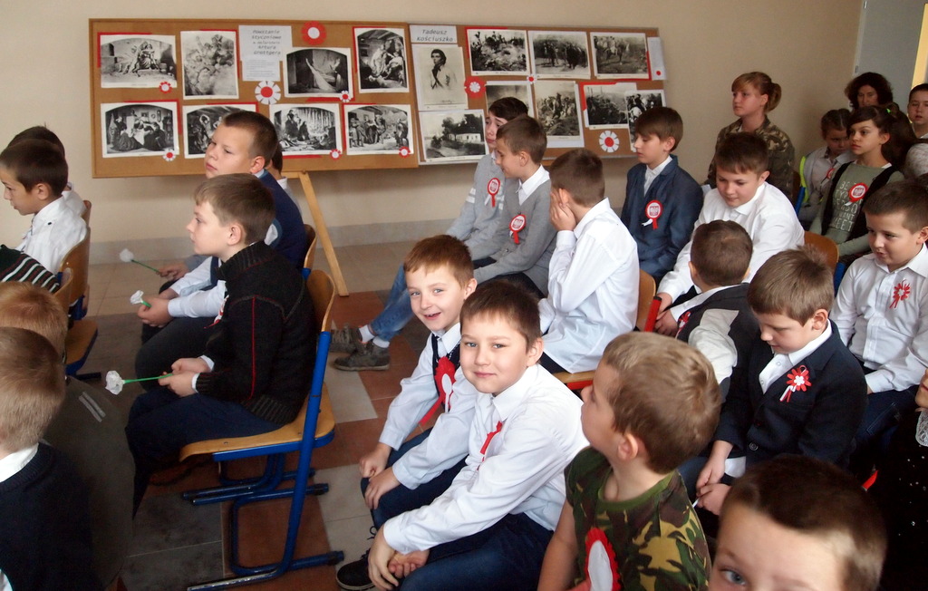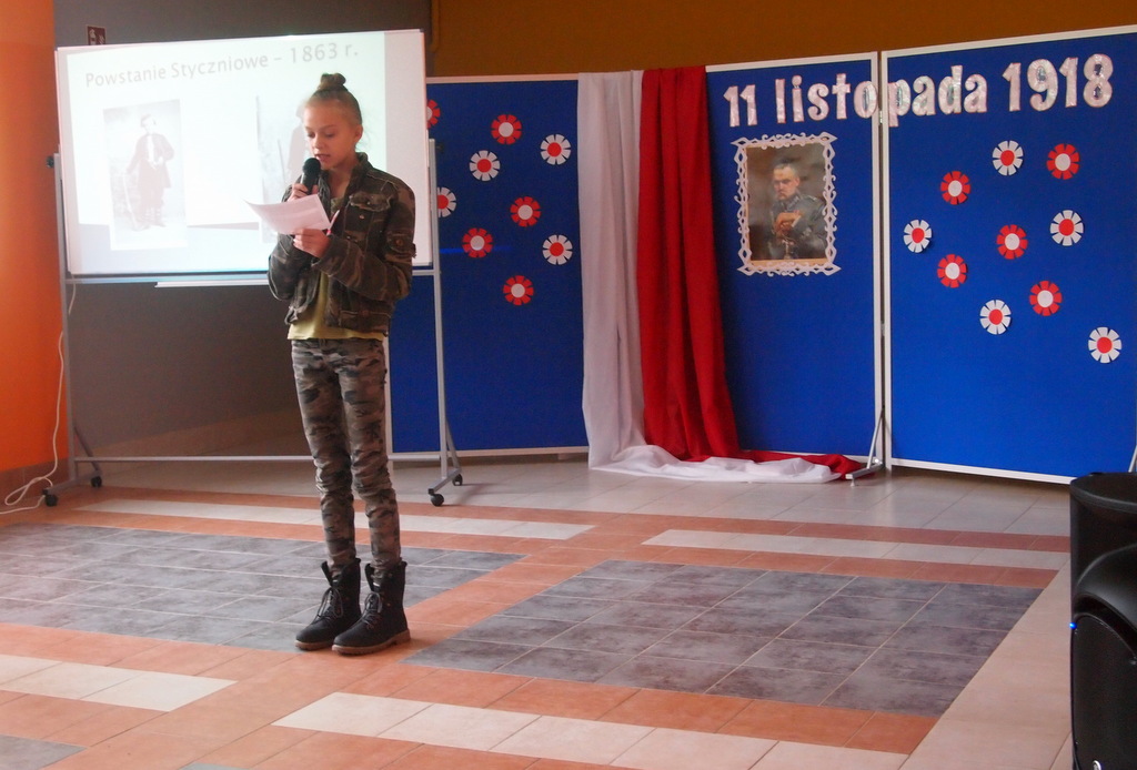W tym dniu każdy miał przypięty biało-czerwony kotylion, a jedna z grup przedszkolaków na uroczystość przybyła w strojach biało–czerwonych. Na scenie prezentowały się wszystkie klasy, które z tej okazji zaśpiewały patriotyczną piosenkę. Pieśni przeplatane były słowem wiążącym wygłoszonym przez uczennice klasy VI. Podczas występu dzieci oglądały specjalnie na ten dzień przygotowaną prezentację multimedialną. Na zakończenie uroczystego apelu wszyscy wspólnie zaśpiewali Rotę. Po uroczystości uczniowie mogli obejrzeć gazetki tematycznie związane ze Świętem Niepodległości. Wystawę zatytułowano: Powstanie styczniowe w malarstwie Artura Grottgera oraz Tadeusz Kościuszko.