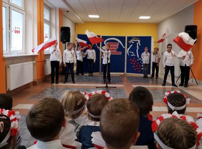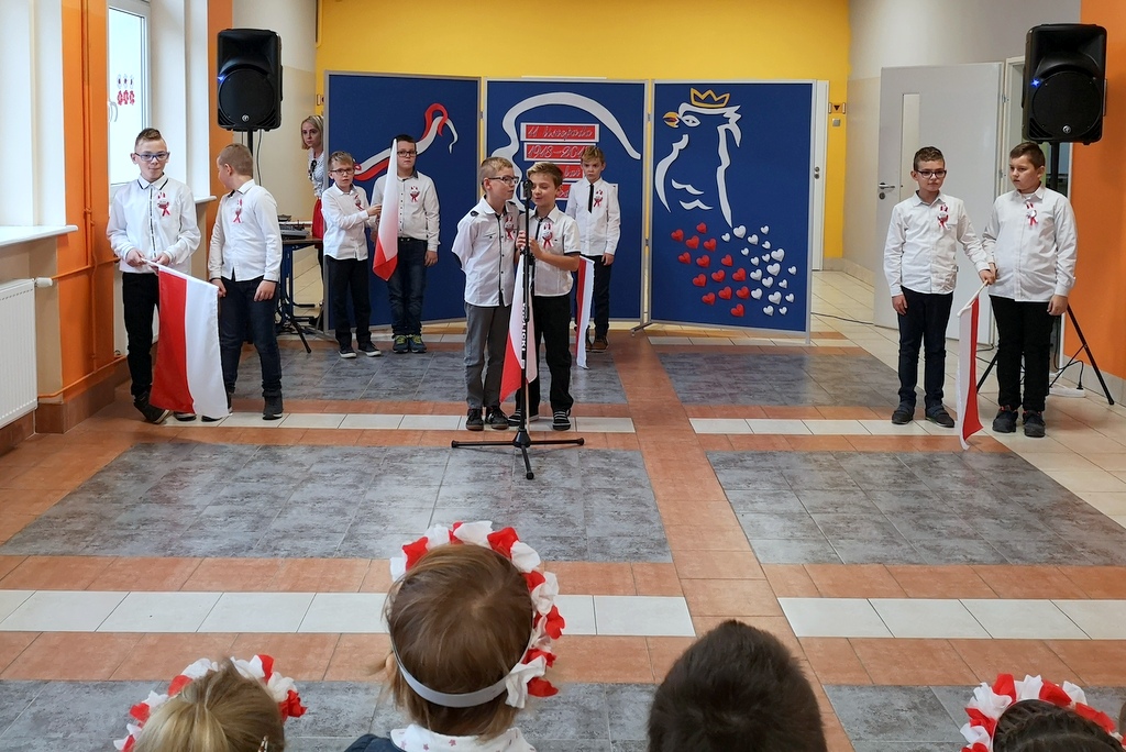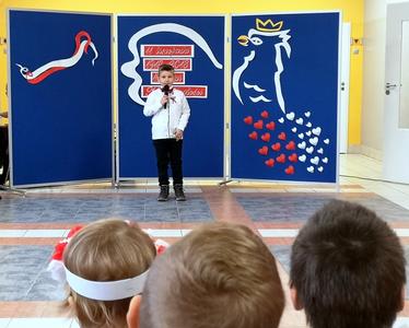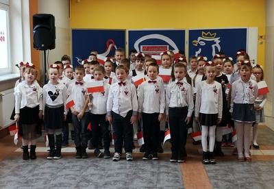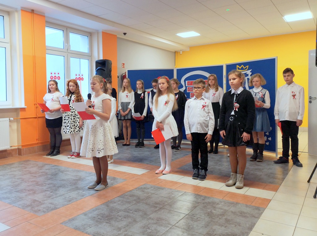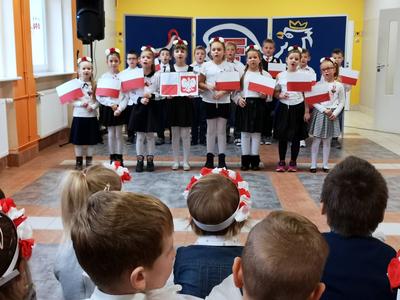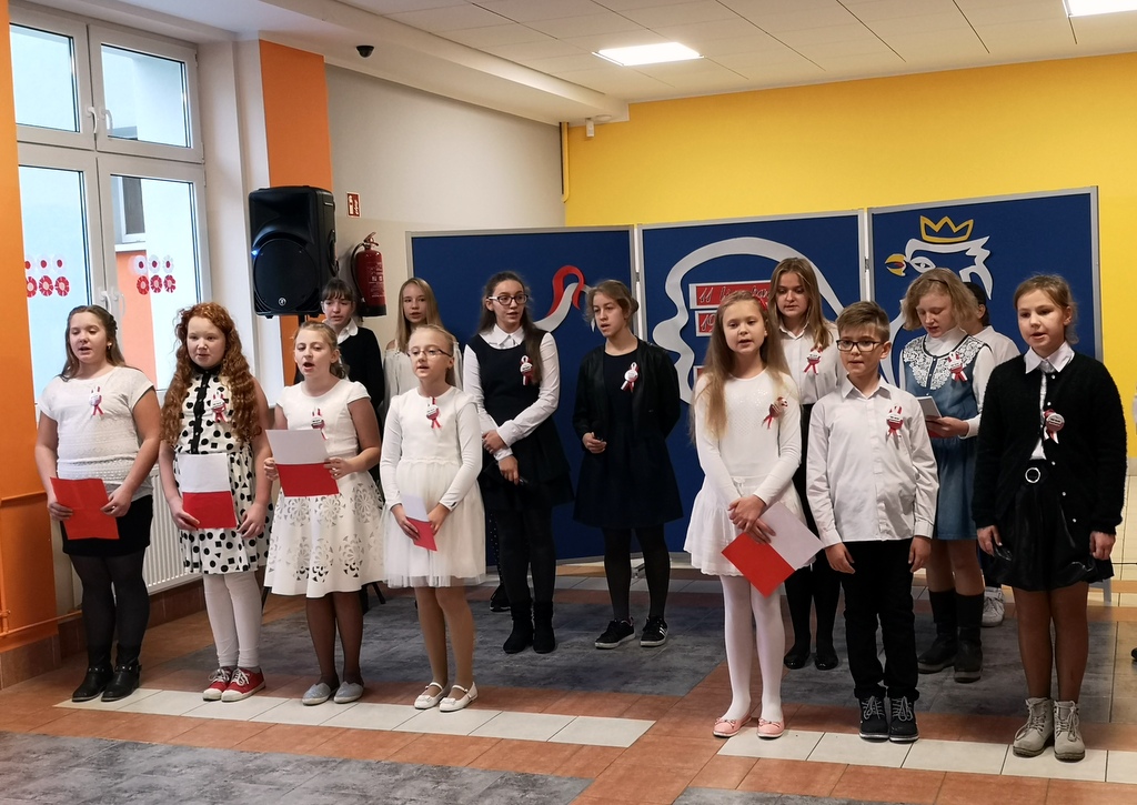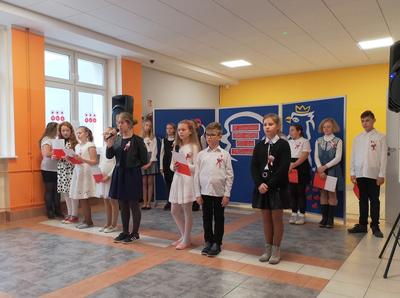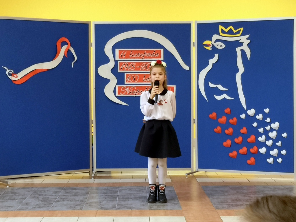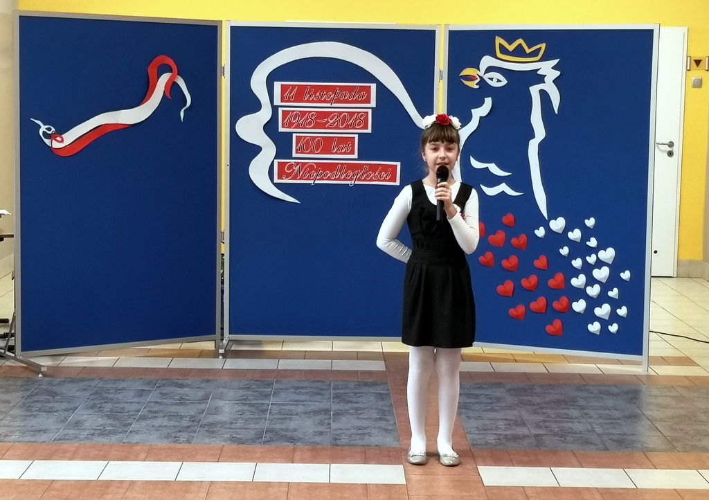 Kolejnym punktem tego świątecznego dnia był „Szkolny Konkurs Recytatorsko-Wokalny z okazji 100. Rocznicy Odzyskania przez Polskę Niepodległości”. Wybrzmiały, doskonale przygotowane przez uczniów z klas 0-VI , patriotyczne piosenki i wiersze.