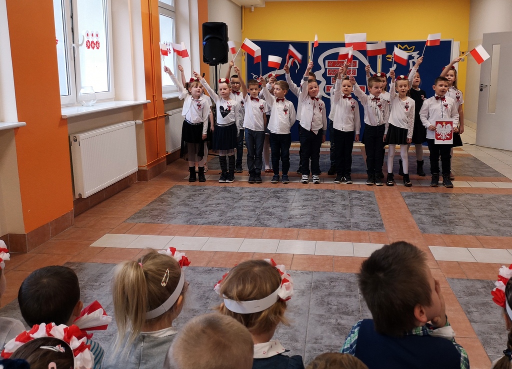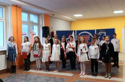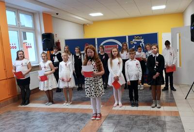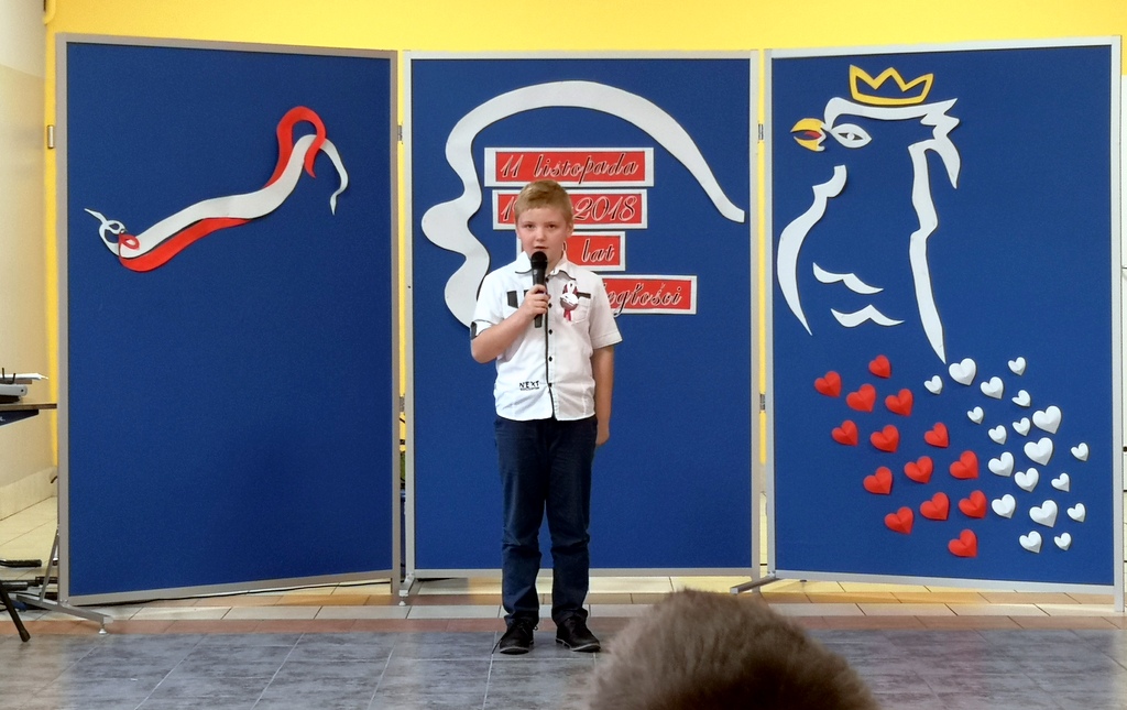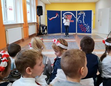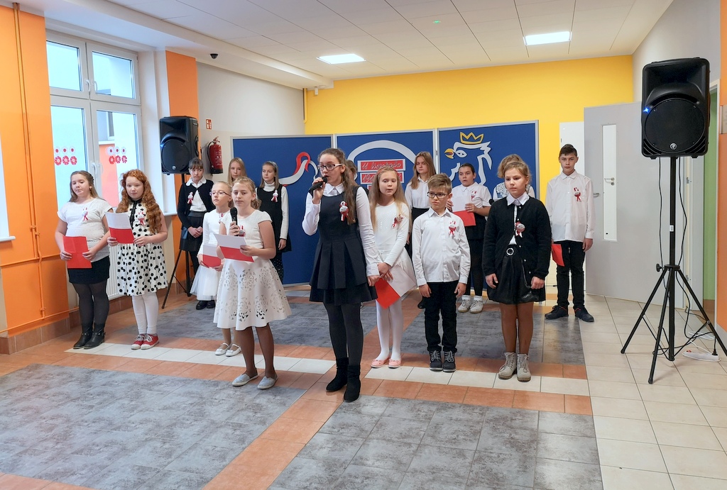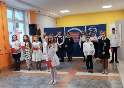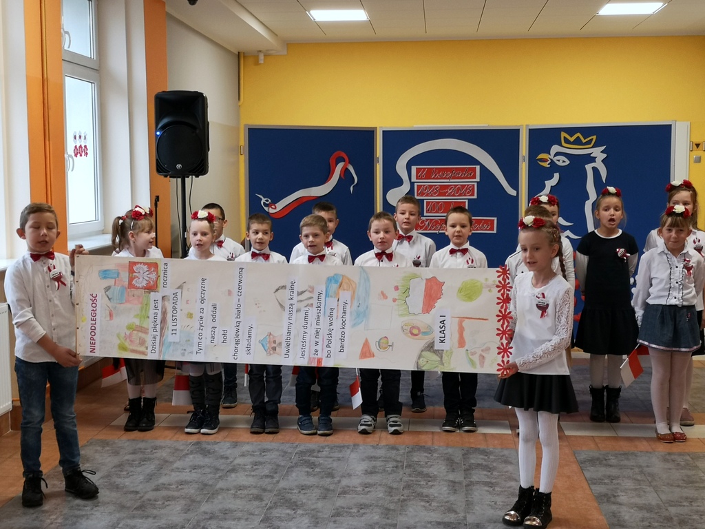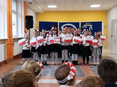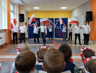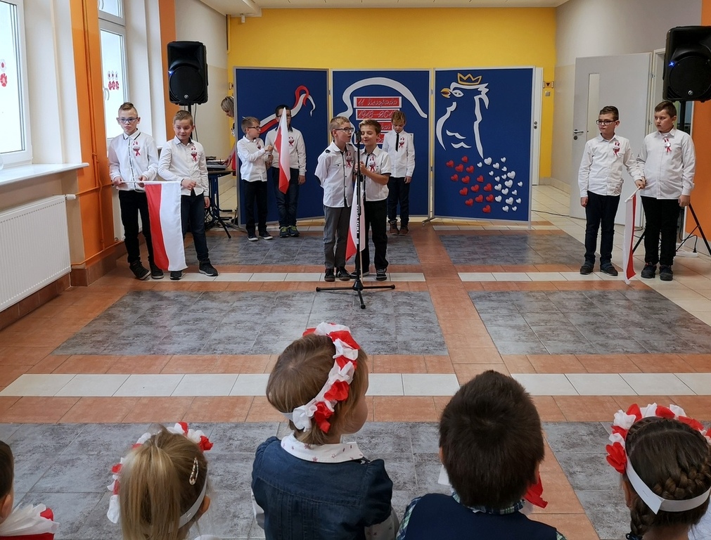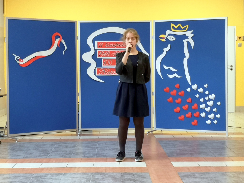Kolejnym punktem tego świątecznego dnia był „Szkolny Konkurs Recytatorsko-Wokalny z okazji 100. Rocznicy Odzyskania przez Polskę Niepodległości”. Wybrzmiały, doskonale przygotowane przez uczniów z klas 0-VI , patriotyczne piosenki i wiersze.