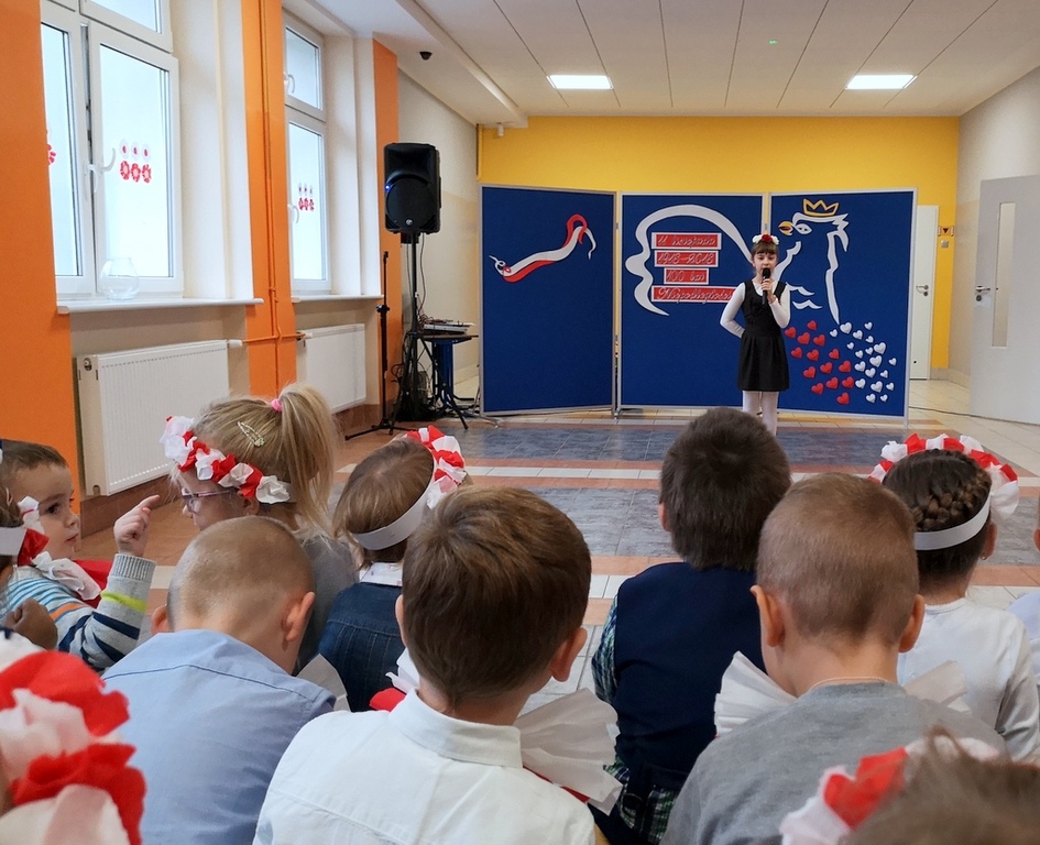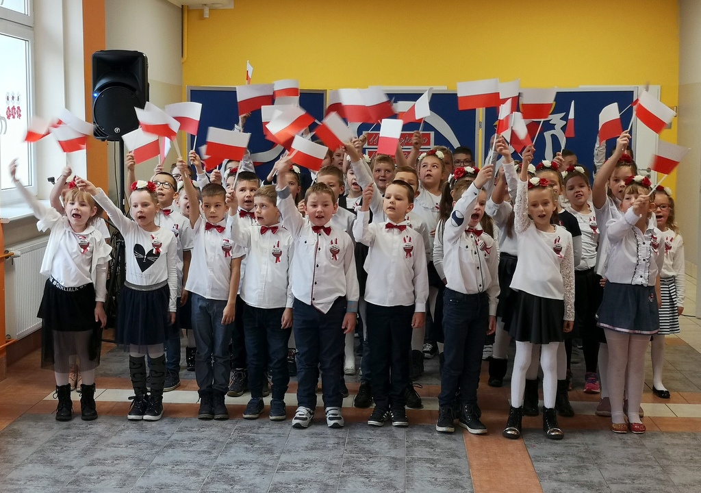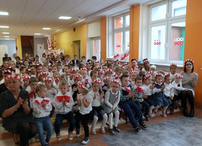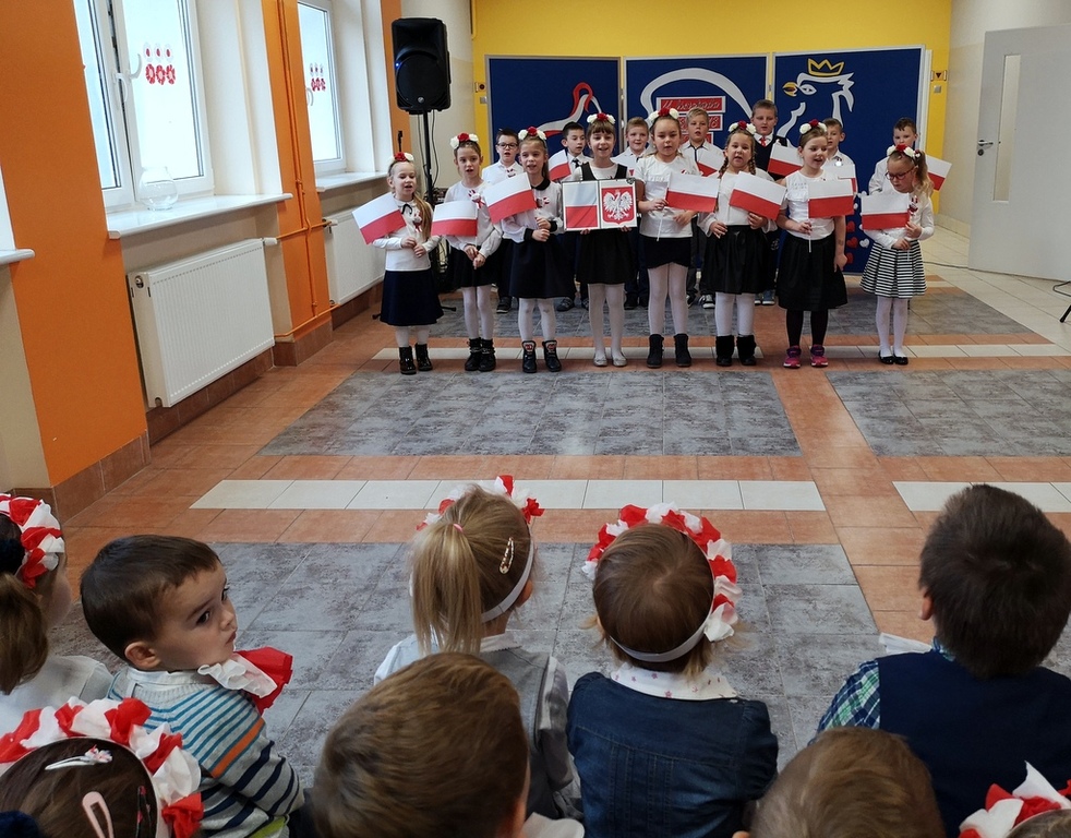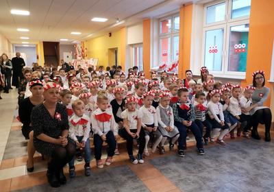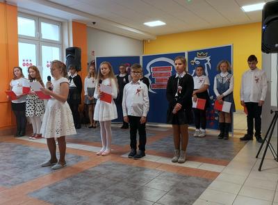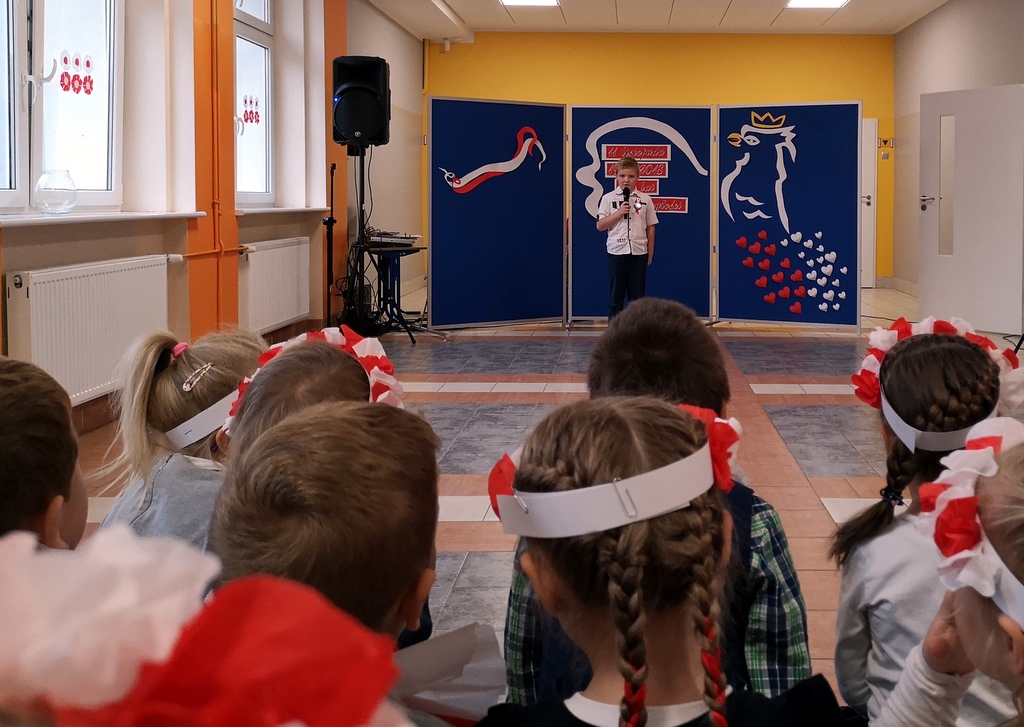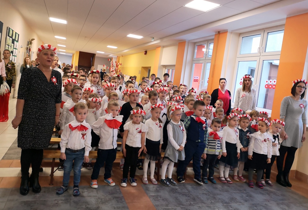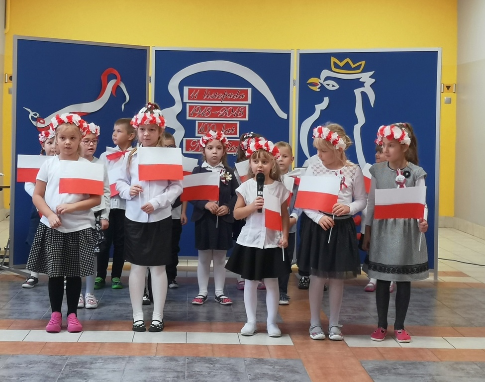 Kolejnym punktem tego świątecznego dnia był „Szkolny Konkurs Recytatorsko-Wokalny z okazji 100. Rocznicy Odzyskania przez Polskę Niepodległości”. Wybrzmiały, doskonale przygotowane przez uczniów z klas 0-VI , patriotyczne piosenki i wiersze.