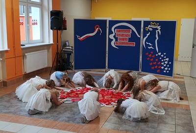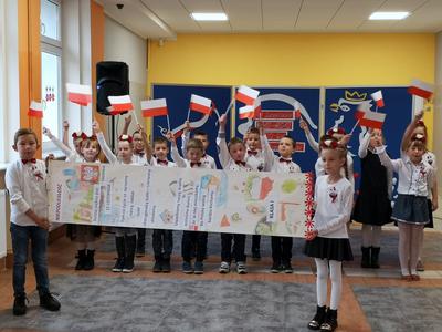 Obchody 100. Rocznicy Odzyskania Niepodległości przez Polskę zakończyły się wspólnym zdjęciem na tle szkolnych dekoracji i napisu umieszczonego w oknach szkoły „WIERNI NIEPODLEGŁEJ”.