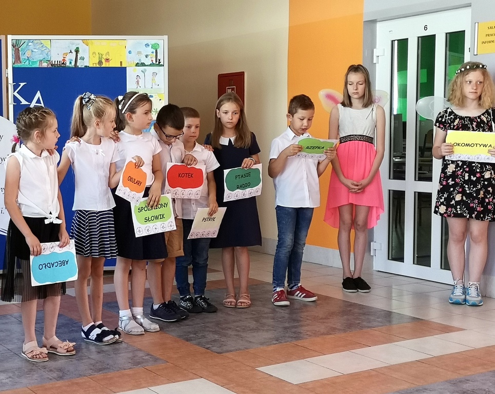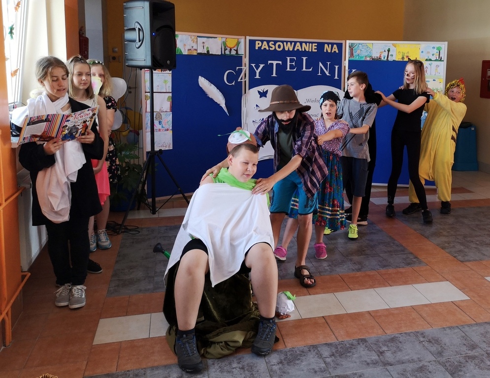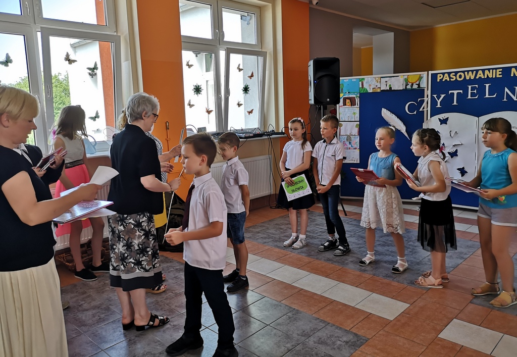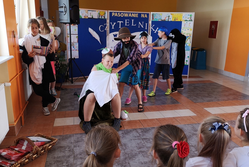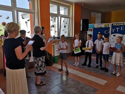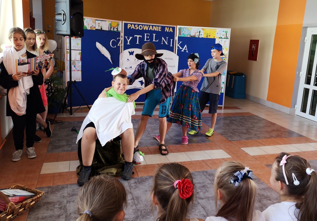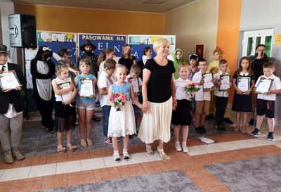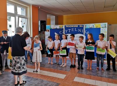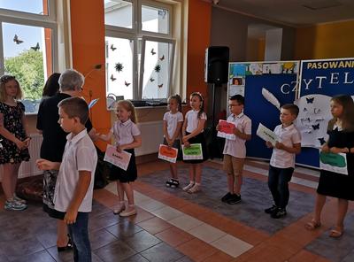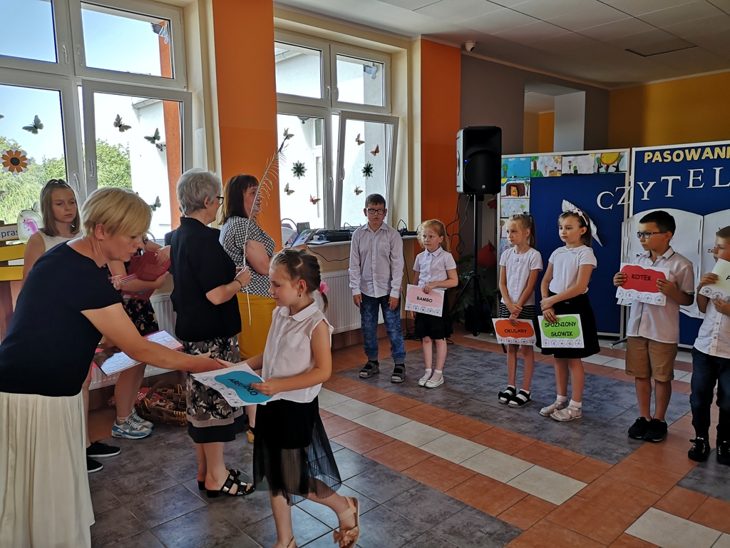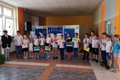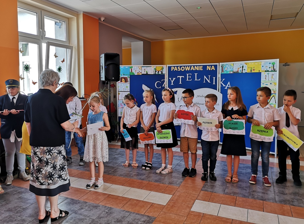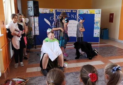 11 czerwca br. pierwszoklasiści mieli swoje święto. Tego dnia odbyło się ich uroczyste "Pasowanie na czytelnika biblioteki szkolnej ". Najpierw obejrzeli przedstawienie pt. "Rzepka", w wykonaniu koleżanek i kolegów z kl. IV- VI, a następnie wysłuchali wiersza Juliana Tuwima pt. "Ptasie radio". Kolejnym punktem było odczytanie przez uczniów klasy I fragmentów wierszy, wspomnianego wcześniej autora. Po wspaniale zdanym egzaminie oraz złożonym przyrzeczeniu, pani dyrektor Beata Kubacka, pawim piórem, pasowała pierwszoklasistów na pełnoprawnych czytelników. Z kolei pani bibliotekarka Danuta Olejnik wręczyła dzieciom pamiątkowe dyplomy, a wychowawczyni pani Izabela Kędziora - ciekawe książki. Były to miłe i uroczyste chwile także dla całej społeczności szkolnej.