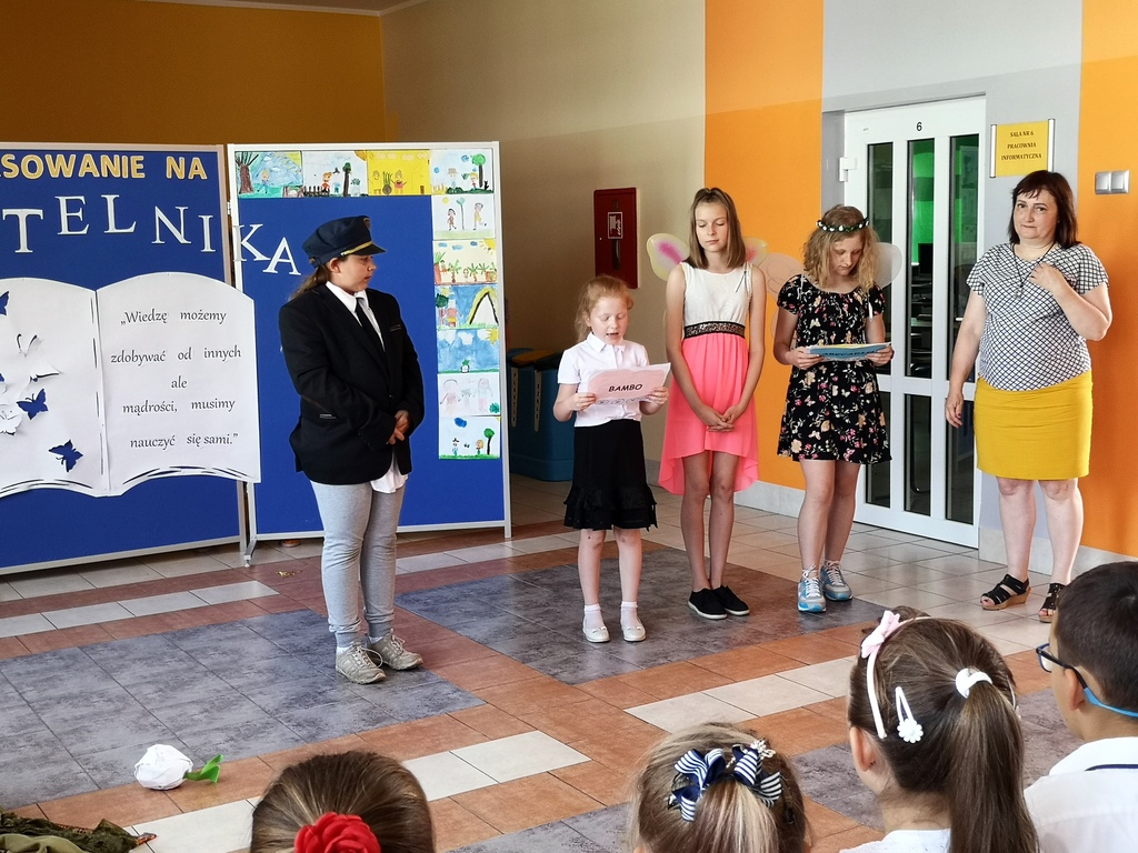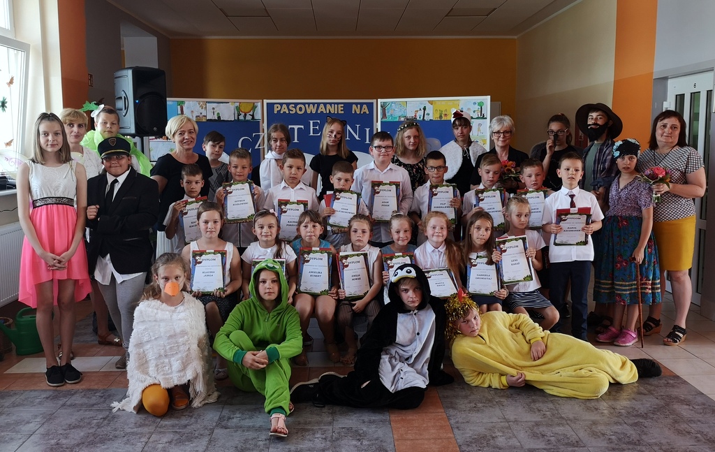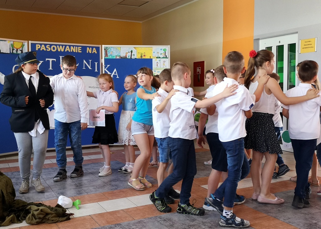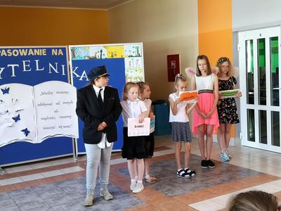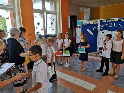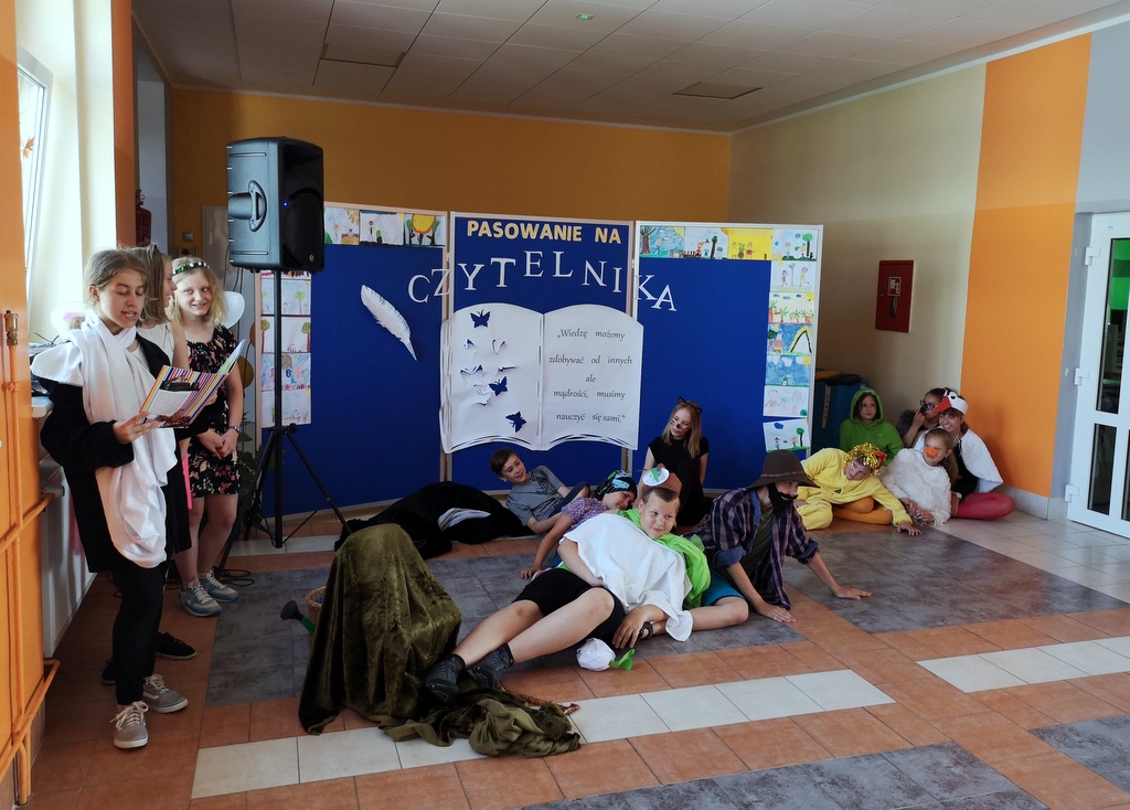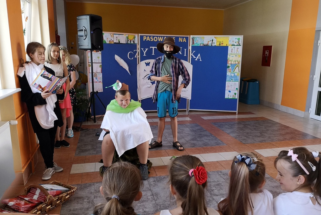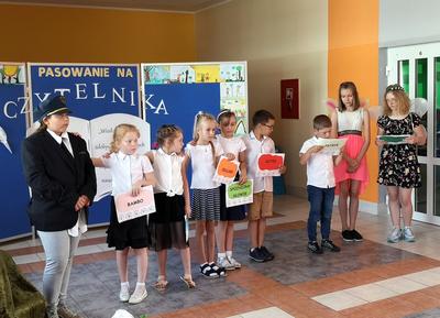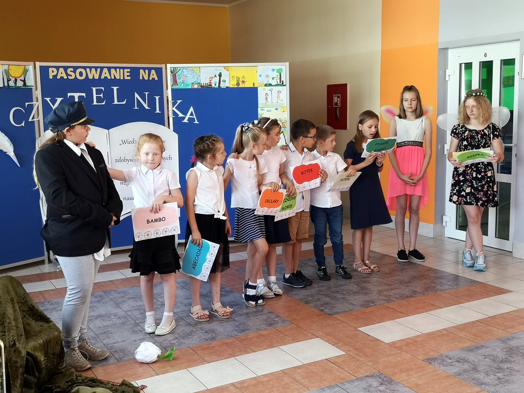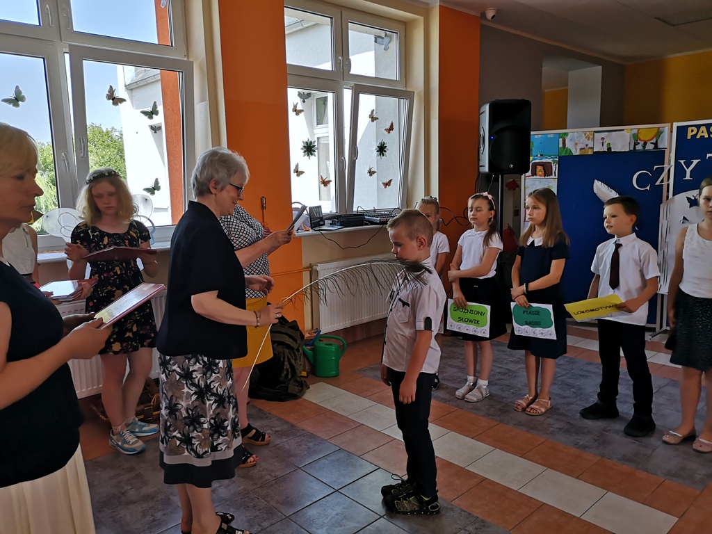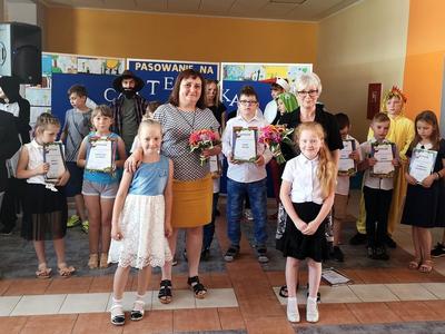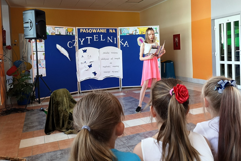 11 czerwca br. pierwszoklasiści mieli swoje święto. Tego dnia odbyło się ich uroczyste "Pasowanie na czytelnika biblioteki szkolnej ". Najpierw obejrzeli przedstawienie pt. "Rzepka", w wykonaniu koleżanek i kolegów z kl. IV- VI, a następnie wysłuchali wiersza Juliana Tuwima pt. "Ptasie radio". Kolejnym punktem było odczytanie przez uczniów klasy I fragmentów wierszy, wspomnianego wcześniej autora. Po wspaniale zdanym egzaminie oraz złożonym przyrzeczeniu, pani dyrektor Beata Kubacka, pawim piórem, pasowała pierwszoklasistów na pełnoprawnych czytelników. Z kolei pani bibliotekarka Danuta Olejnik wręczyła dzieciom pamiątkowe dyplomy, a wychowawczyni pani Izabela Kędziora - ciekawe książki. Były to miłe i uroczyste chwile także dla całej społeczności szkolnej.