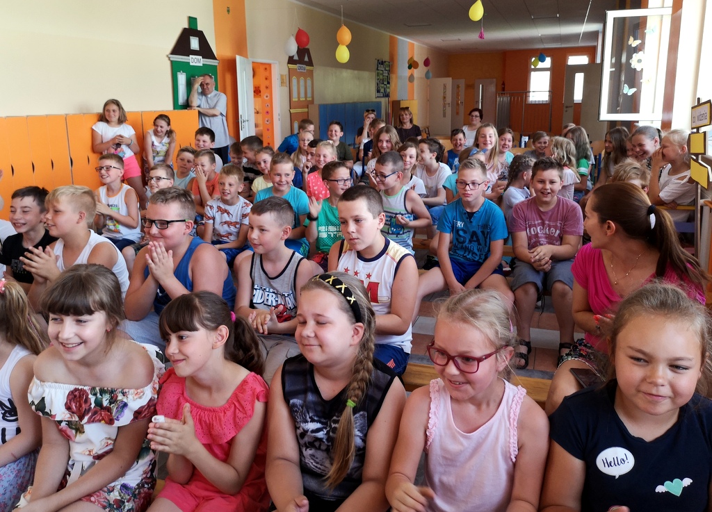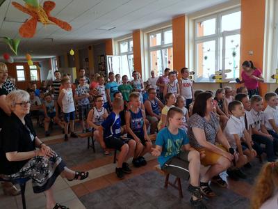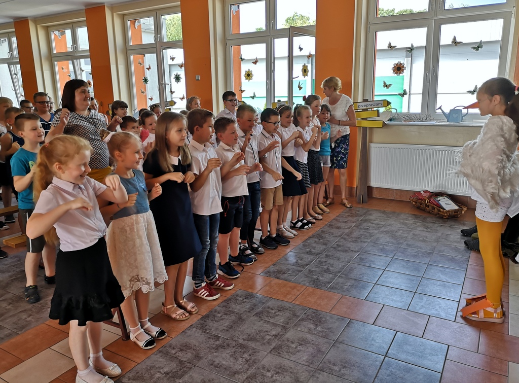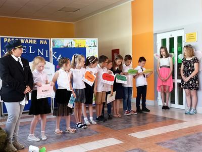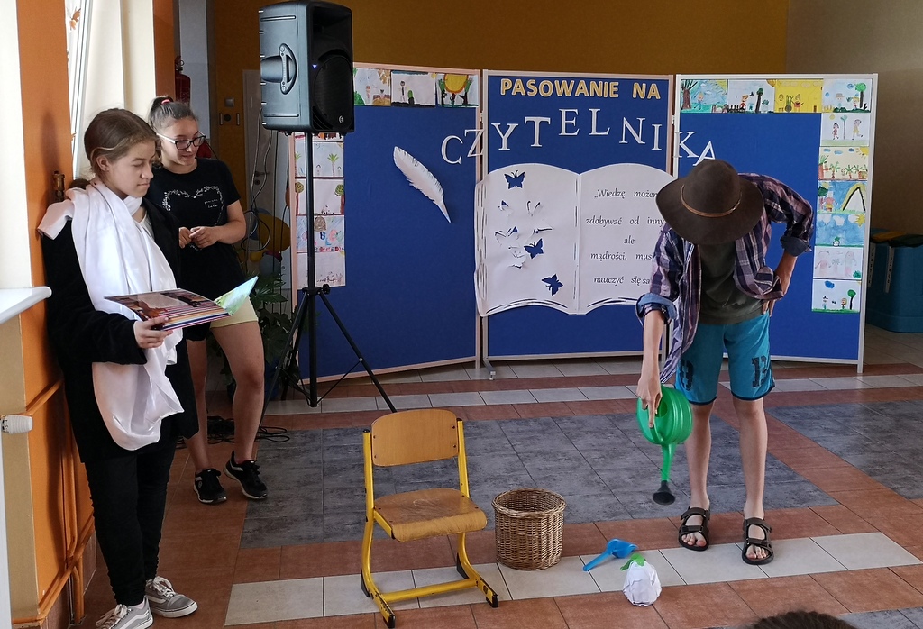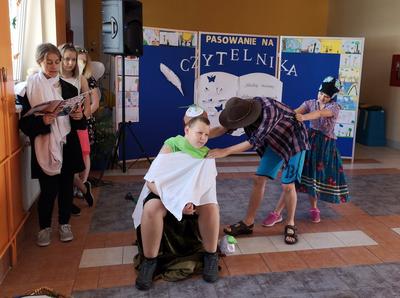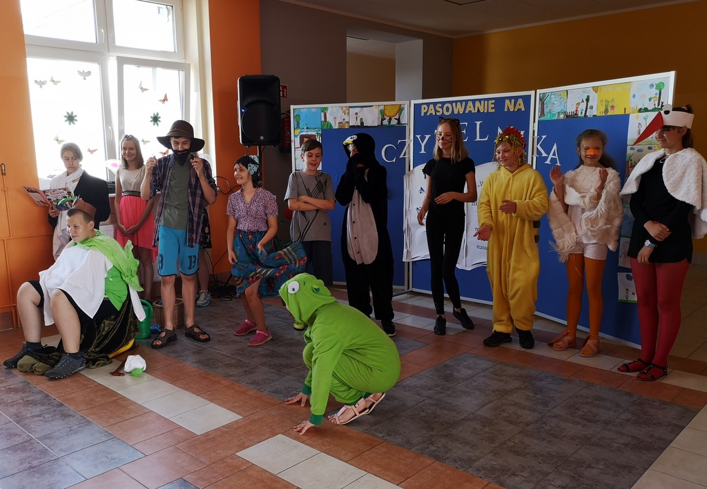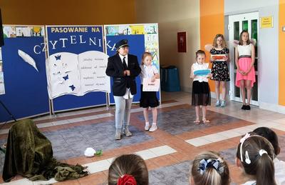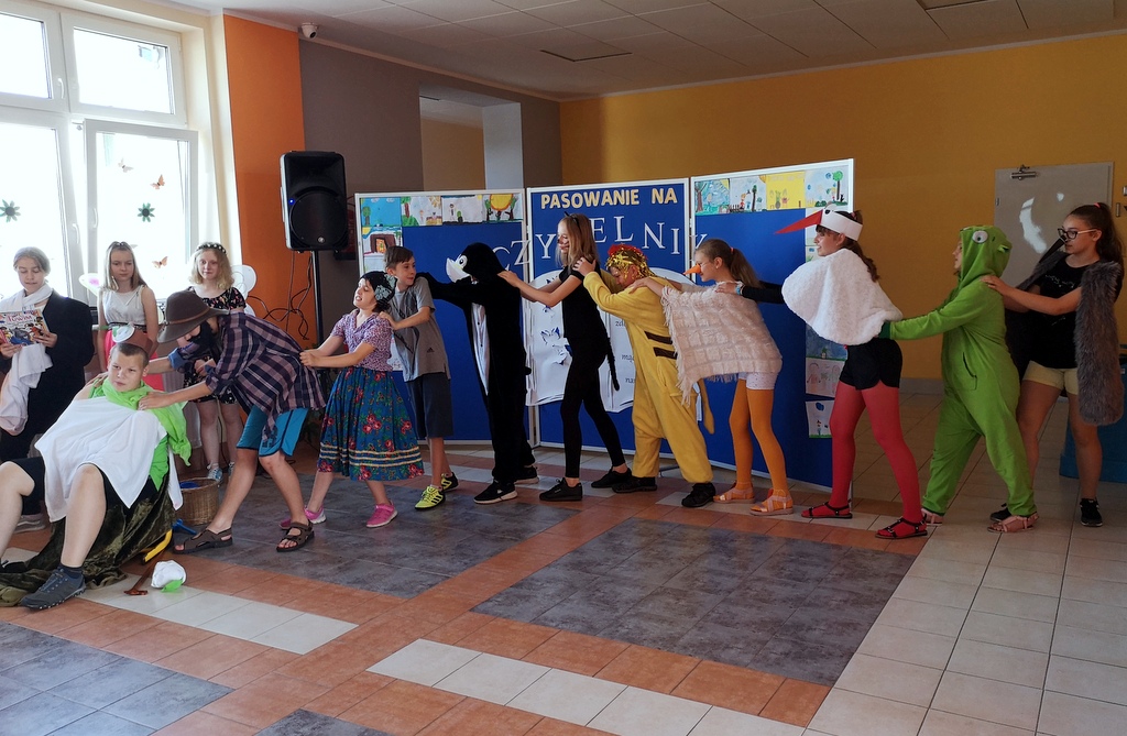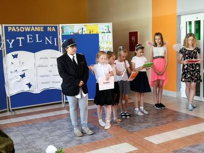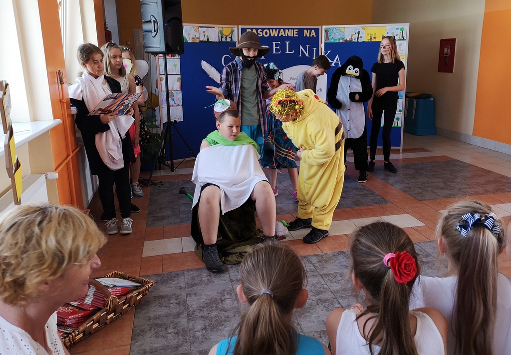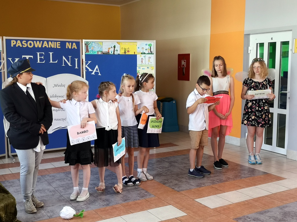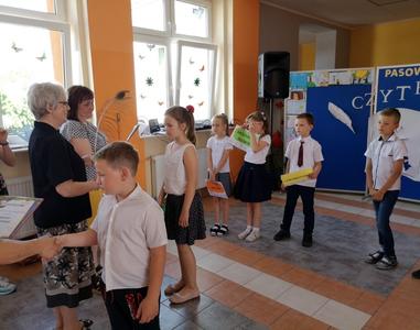 11 czerwca br. pierwszoklasiści mieli swoje święto. Tego dnia odbyło się ich uroczyste "Pasowanie na czytelnika biblioteki szkolnej ". Najpierw obejrzeli przedstawienie pt. "Rzepka", w wykonaniu koleżanek i kolegów z kl. IV- VI, a następnie wysłuchali wiersza Juliana Tuwima pt. "Ptasie radio". Kolejnym punktem było odczytanie przez uczniów klasy I fragmentów wierszy, wspomnianego wcześniej autora. Po wspaniale zdanym egzaminie oraz złożonym przyrzeczeniu, pani dyrektor Beata Kubacka, pawim piórem, pasowała pierwszoklasistów na pełnoprawnych czytelników. Z kolei pani bibliotekarka Danuta Olejnik wręczyła dzieciom pamiątkowe dyplomy, a wychowawczyni pani Izabela Kędziora - ciekawe książki. Były to miłe i uroczyste chwile także dla całej społeczności szkolnej.