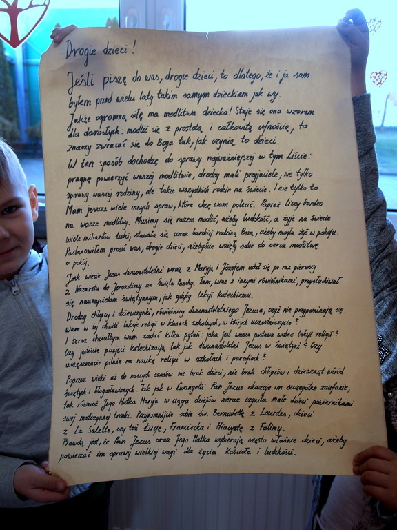Pierwszego dnia dzieci w ramach przygotowań do spotkania z Matką Bożą zaangażowały się w modlitwę o pokój oraz w intencji rodzin. Myślą przewodnią był "List do dzieci" autorstwa Jana Pawła II. Tego dnia uczniowie wykonali też prace plastyczne pt." Matka Boska - Czarna Madonna", z których w poszczególnych klasach przygotowano wystawę lub udekorowano okna.