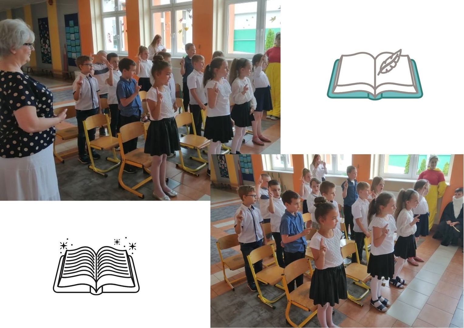 Następnie dzieci złożyły uroczyste przyrzeczenie, że zawsze będą szanować książki, a pani Dyrektor pawim piórem dokonała pasowania. Na pamiątkę każdy pasowany uczeń otrzymał dyplom wraz z książką.