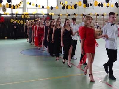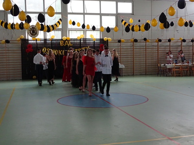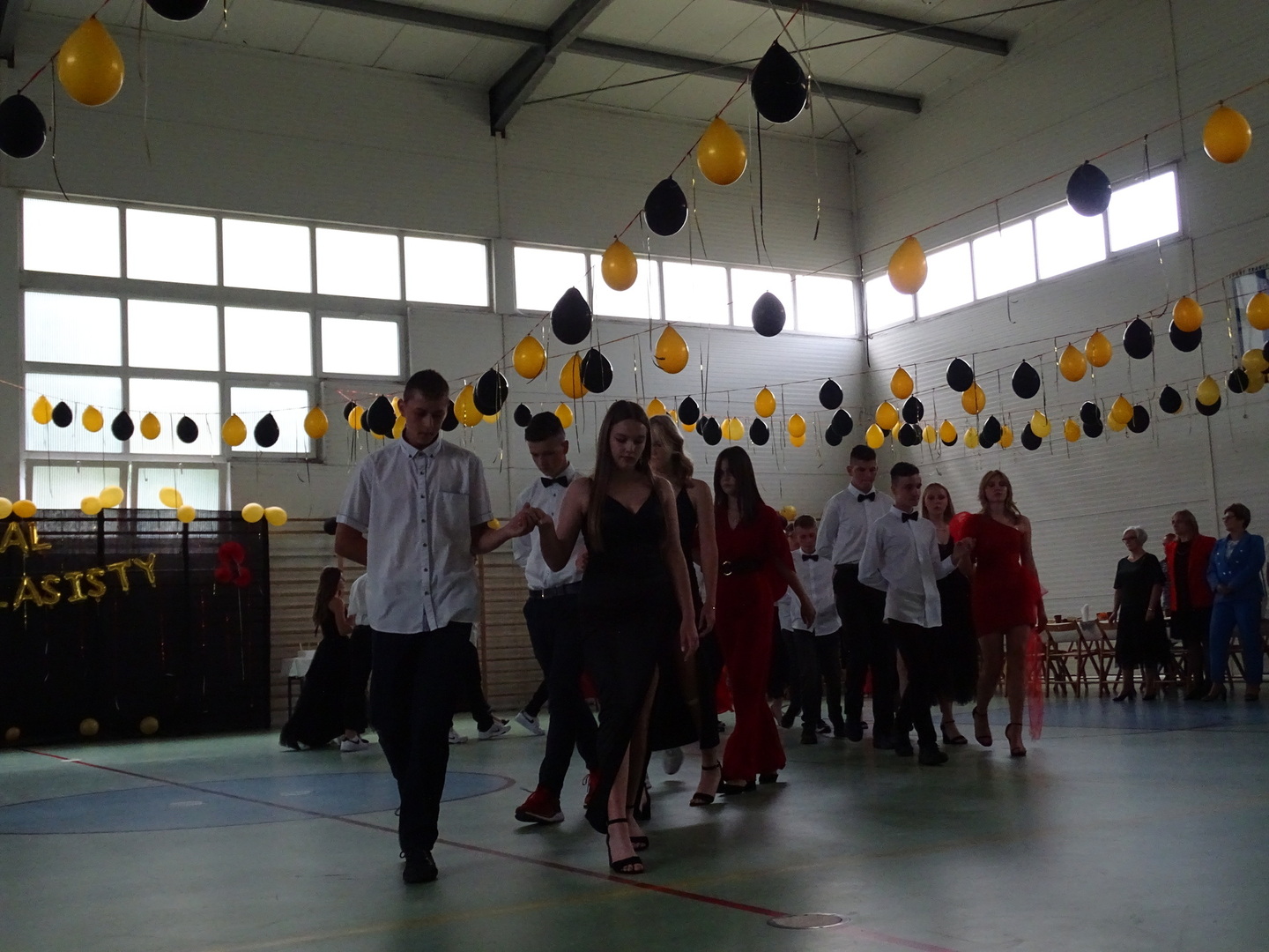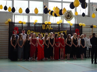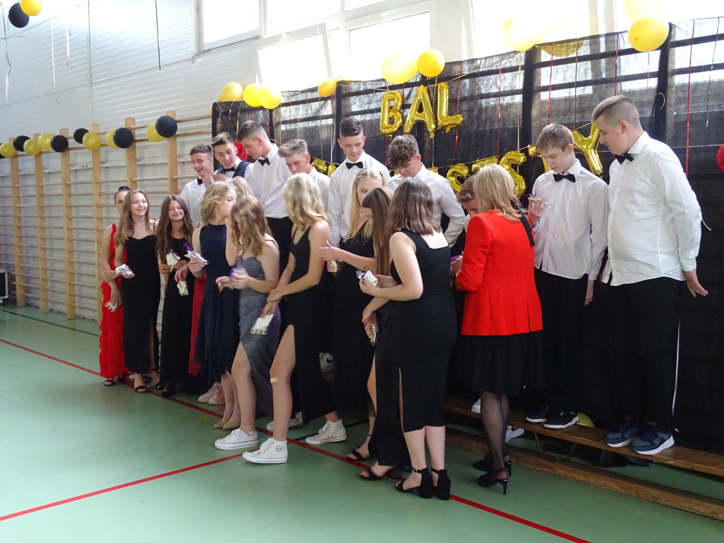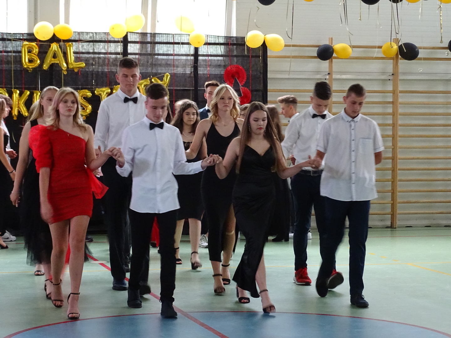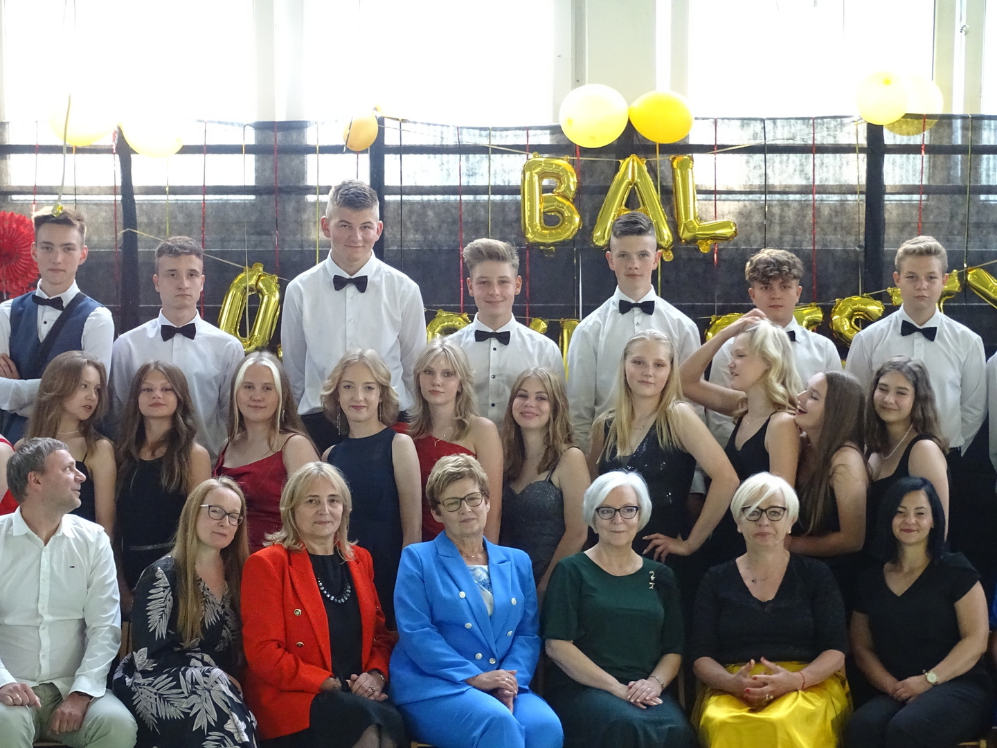 Podczas uroczystego rozpoczęcia pani Dyrektor powitała przybyłych rodziców, nauczycieli i uczniów klas ósmych – głównych bohaterów balu. Po tych życzeniach zabrzmiały pierwsze akordy poloneza, klasa ósma wraz z zaproszonymi uczniami -Klaudią, Szymonem, Oskarem i Przemysławem zaprezentowali pięknie wykonany układ taneczny zbierając na zakończenie zasłużone owacje.