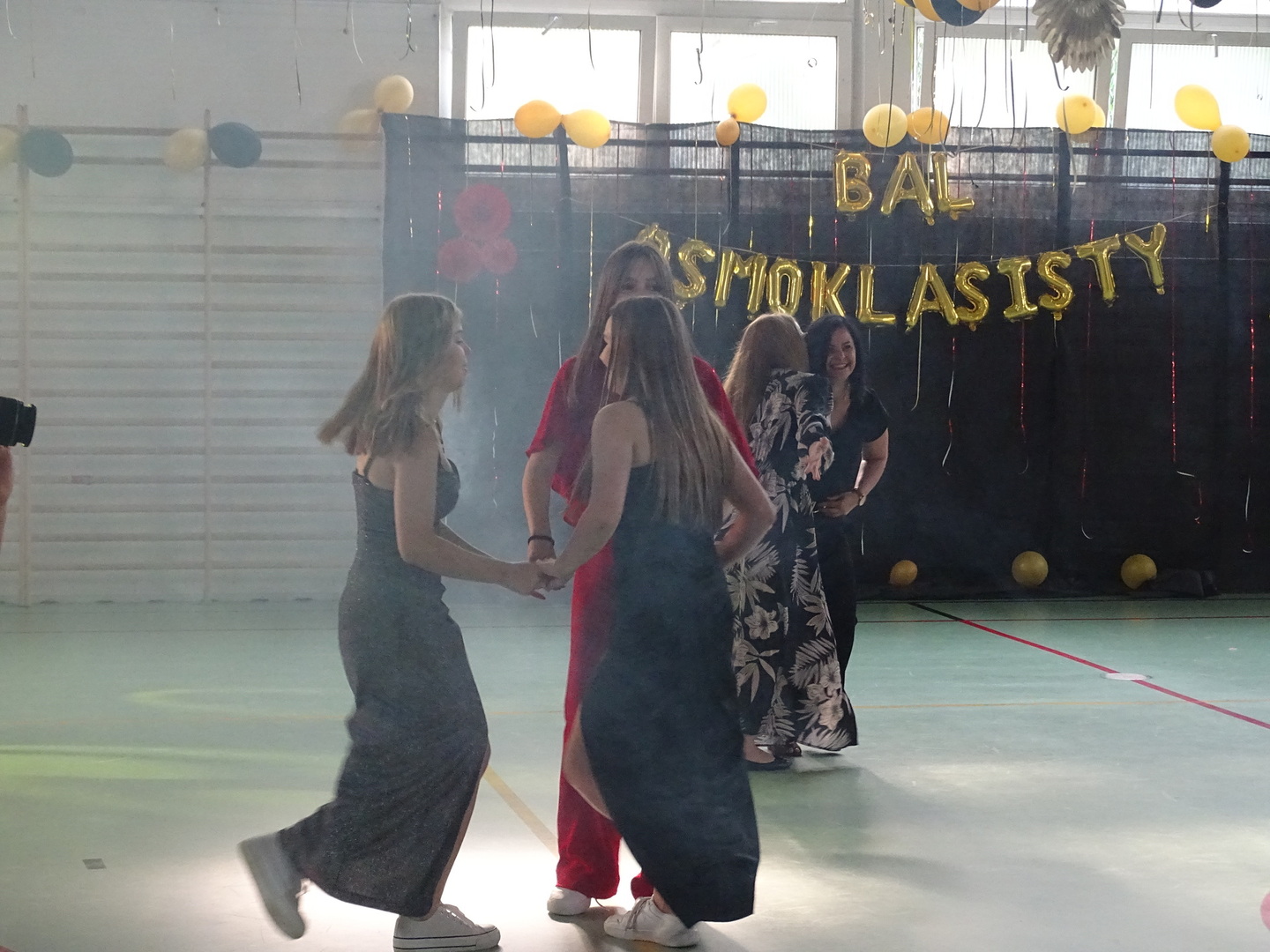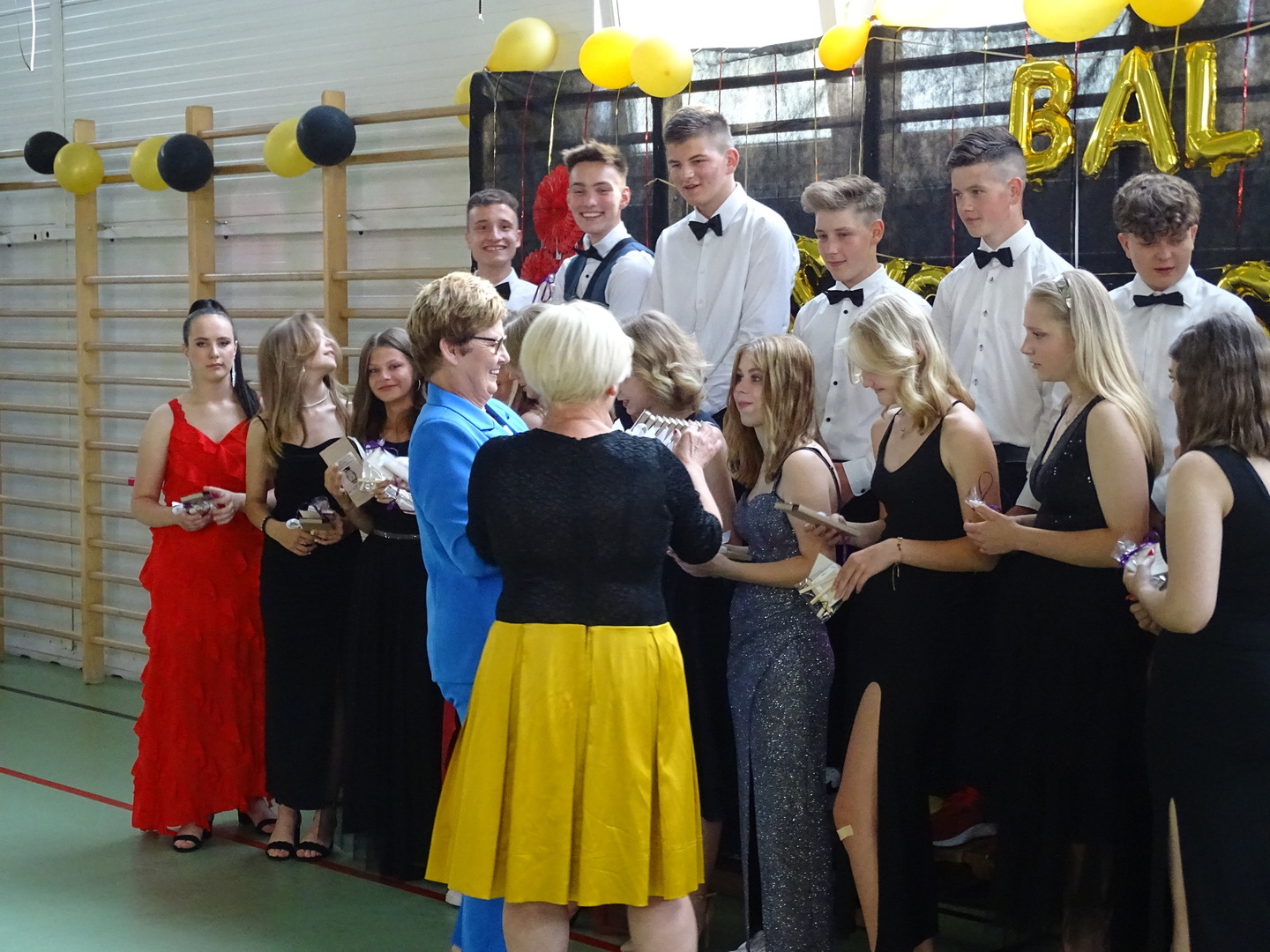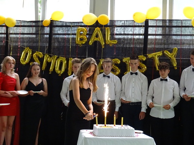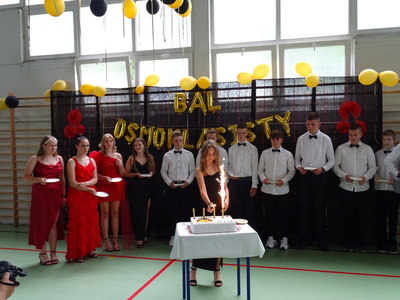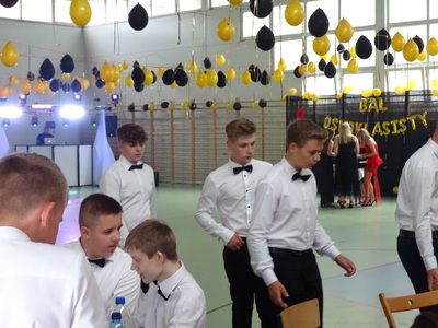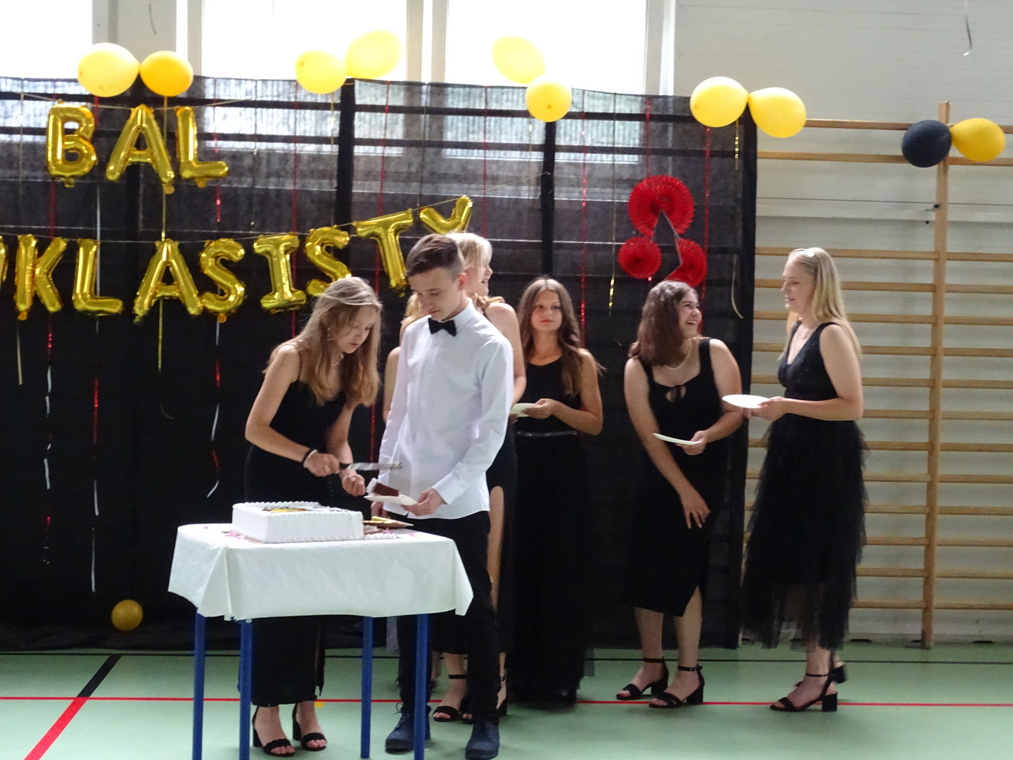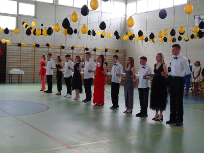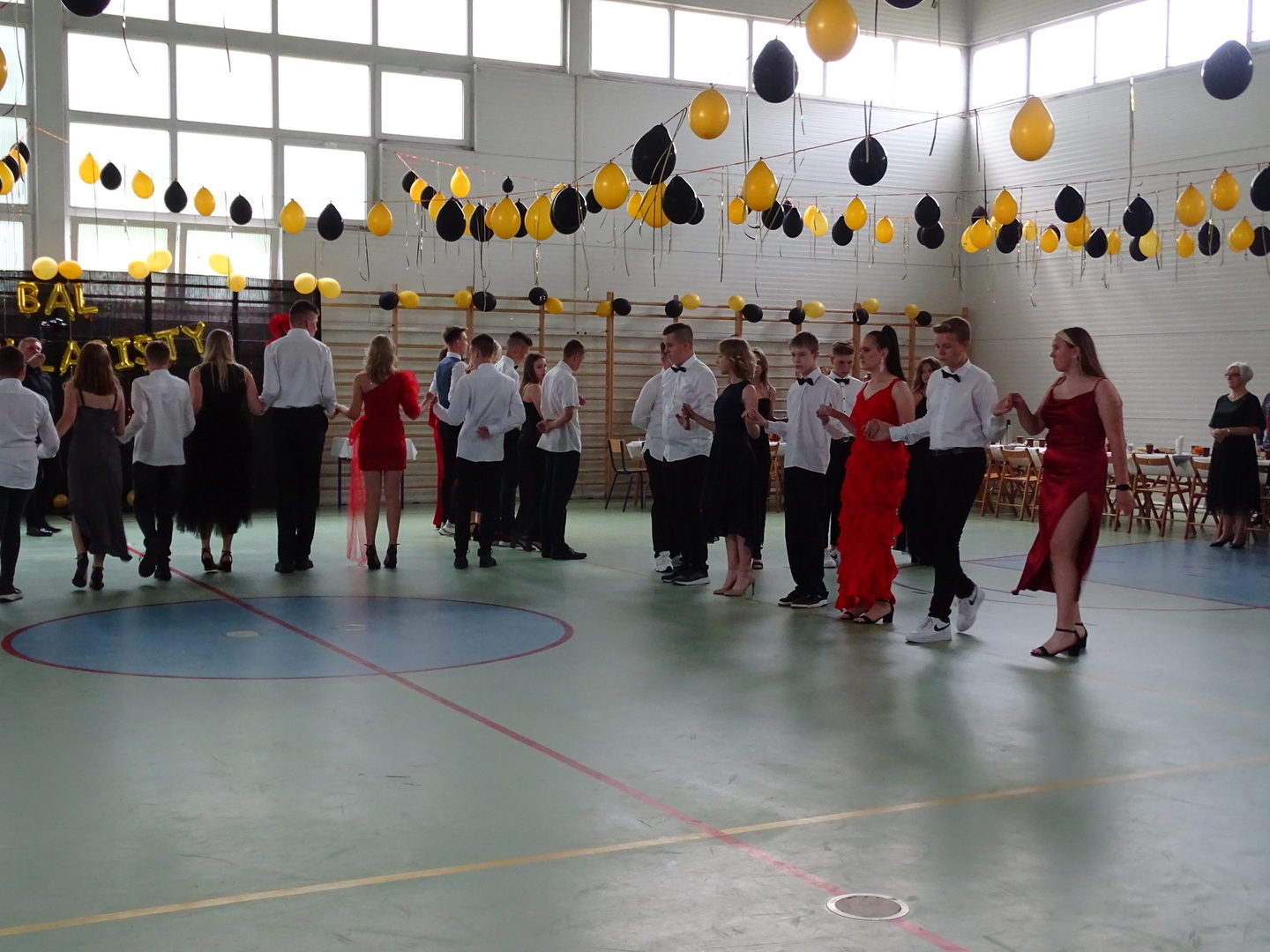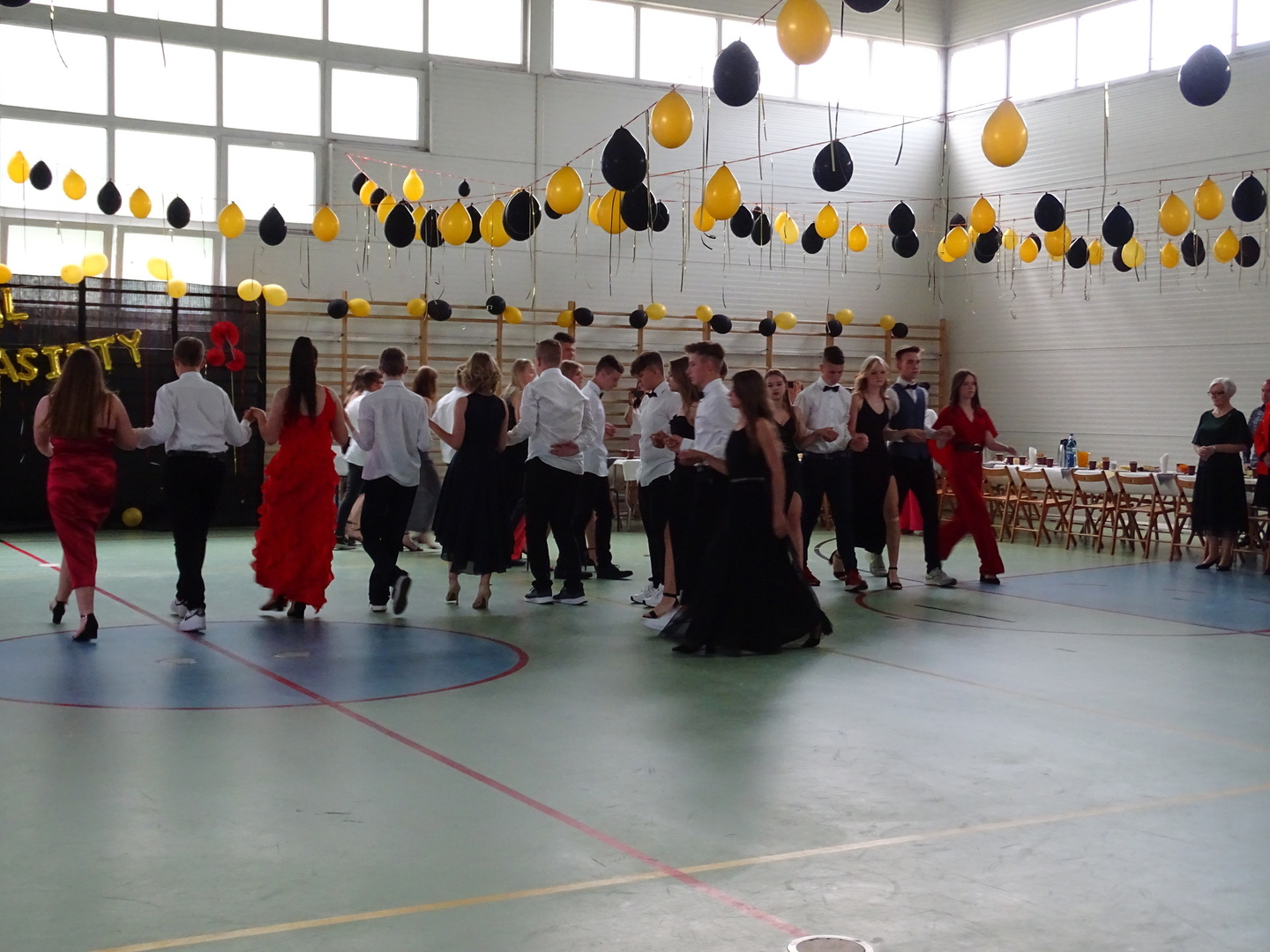 Podczas uroczystego rozpoczęcia pani Dyrektor powitała przybyłych rodziców, nauczycieli i uczniów klas ósmych – głównych bohaterów balu. Po tych życzeniach zabrzmiały pierwsze akordy poloneza, klasa ósma wraz z zaproszonymi uczniami -Klaudią, Szymonem, Oskarem i Przemysławem zaprezentowali pięknie wykonany układ taneczny zbierając na zakończenie zasłużone owacje.