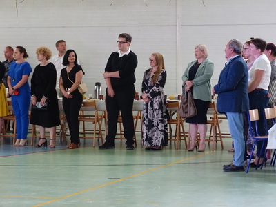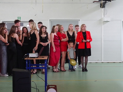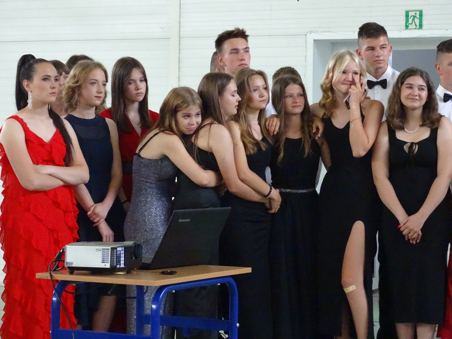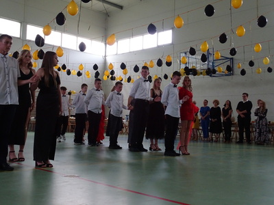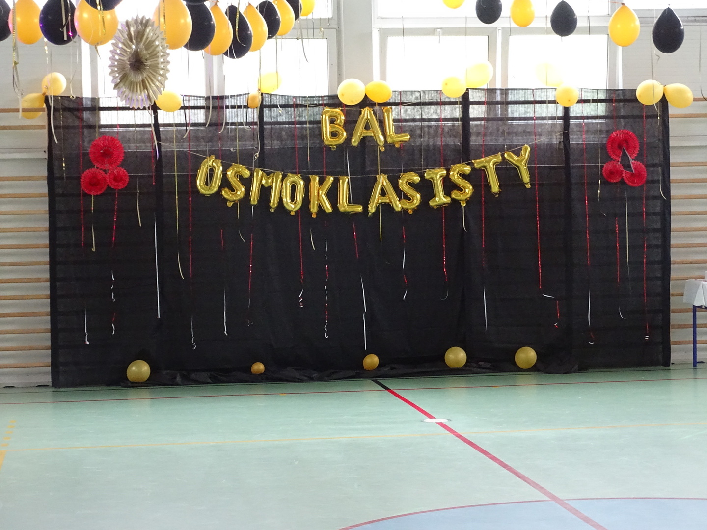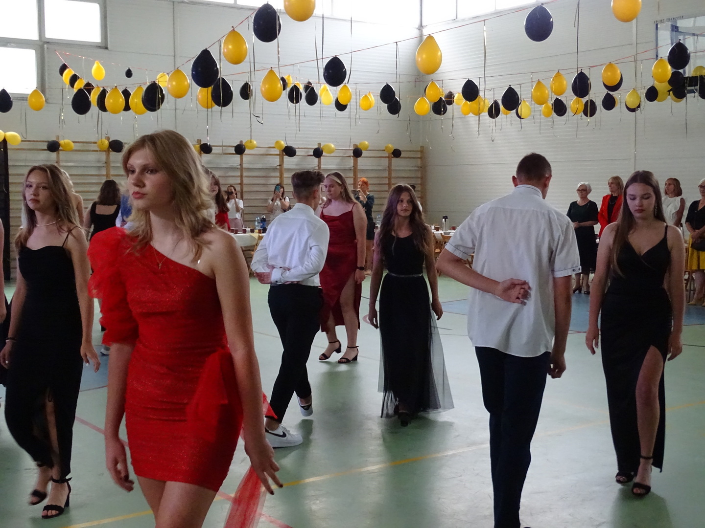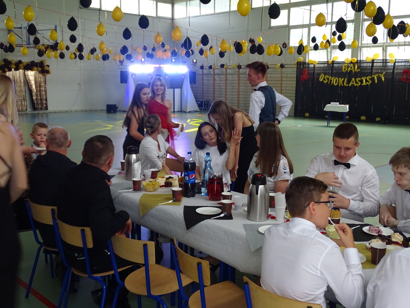 Podczas uroczystego rozpoczęcia pani Dyrektor powitała przybyłych rodziców, nauczycieli i uczniów klas ósmych – głównych bohaterów balu. Po tych życzeniach zabrzmiały pierwsze akordy poloneza, klasa ósma wraz z zaproszonymi uczniami -Klaudią, Szymonem, Oskarem i Przemysławem zaprezentowali pięknie wykonany układ taneczny zbierając na zakończenie zasłużone owacje.