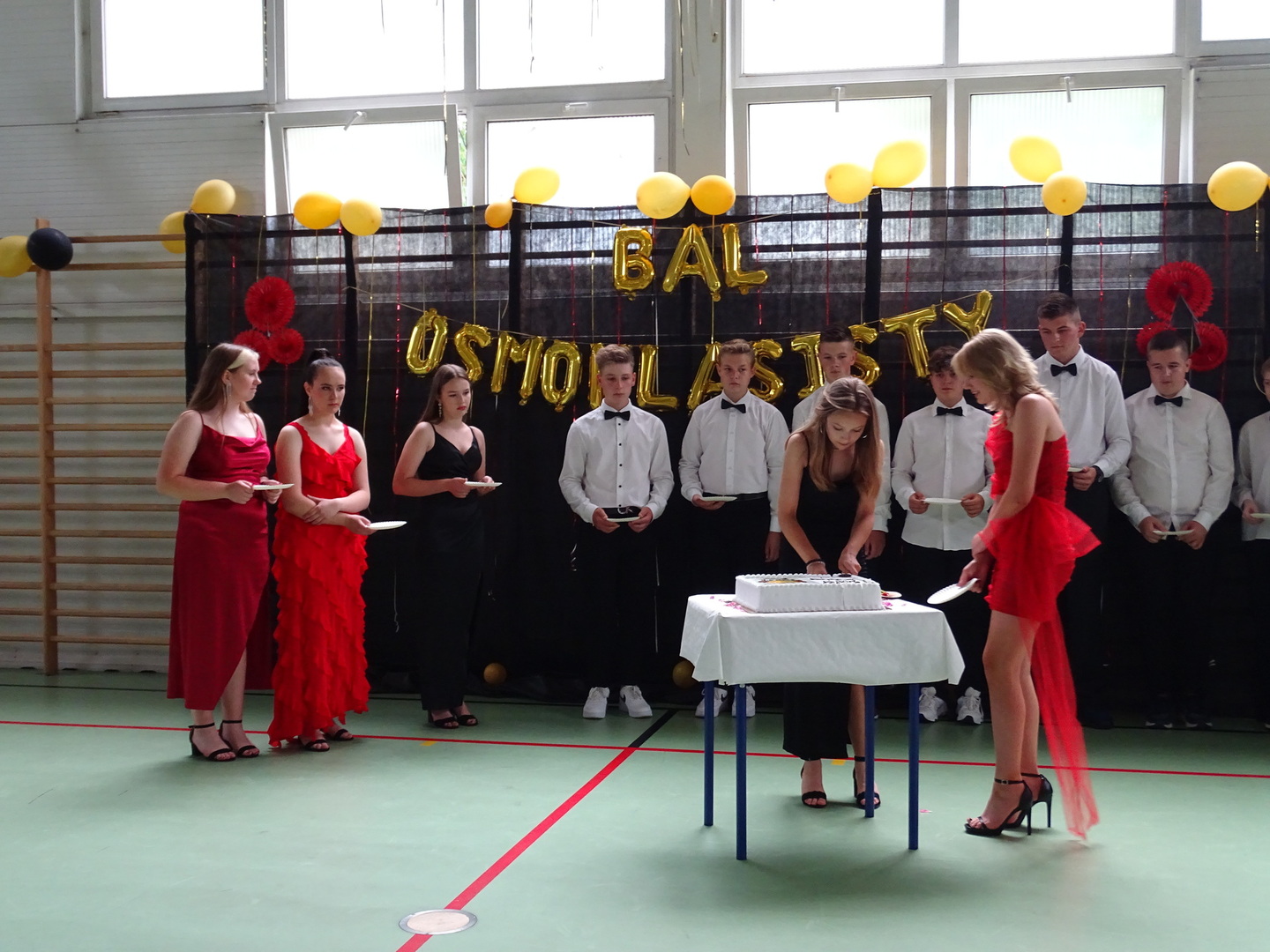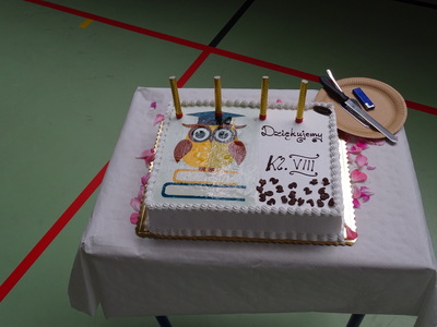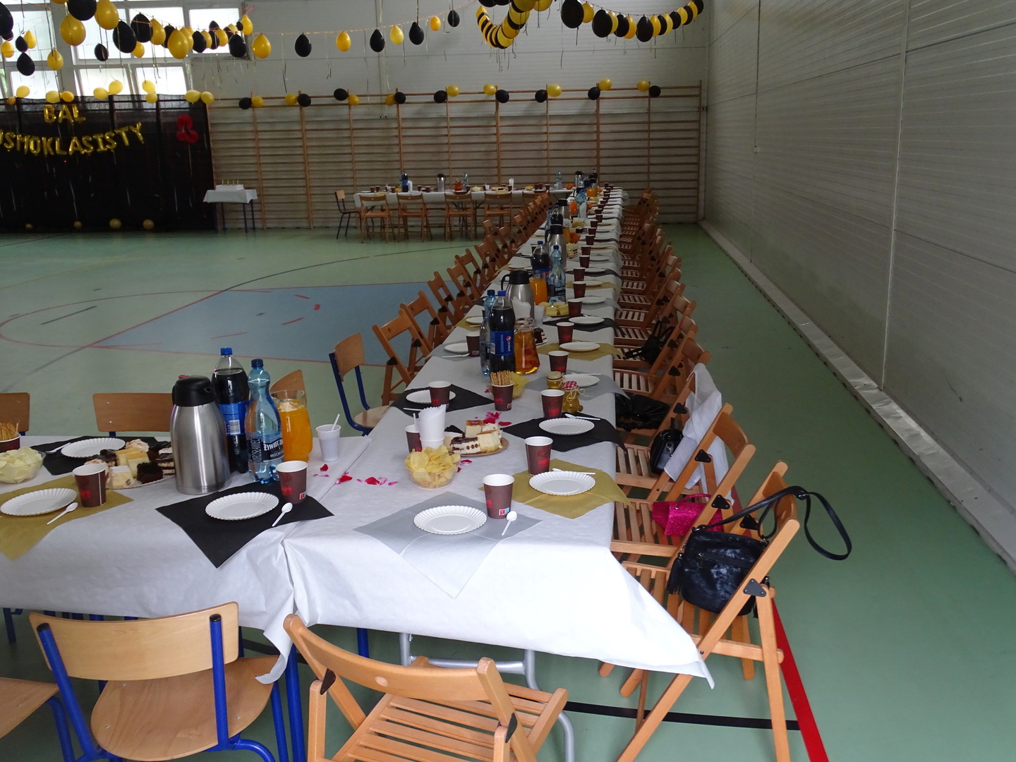 Następnie odbyła się biesiada (Rodzice przygotowali mnóstwo pyszności). Przewodnicząca klasy Ola podzieliła wspaniały tort, obejrzano wśród wielkich emocji prezentację przedstawiającą szkolną drogę uczniów od pierwszych dni w szkole do klasy ostatniej.