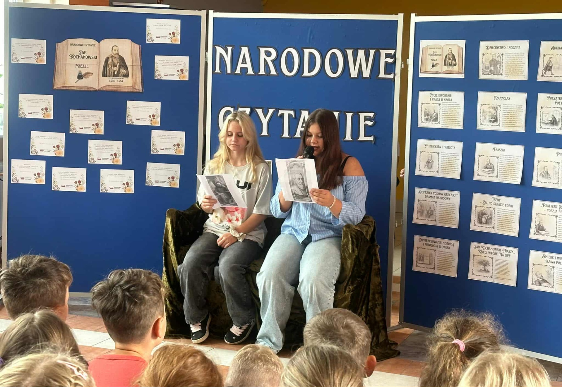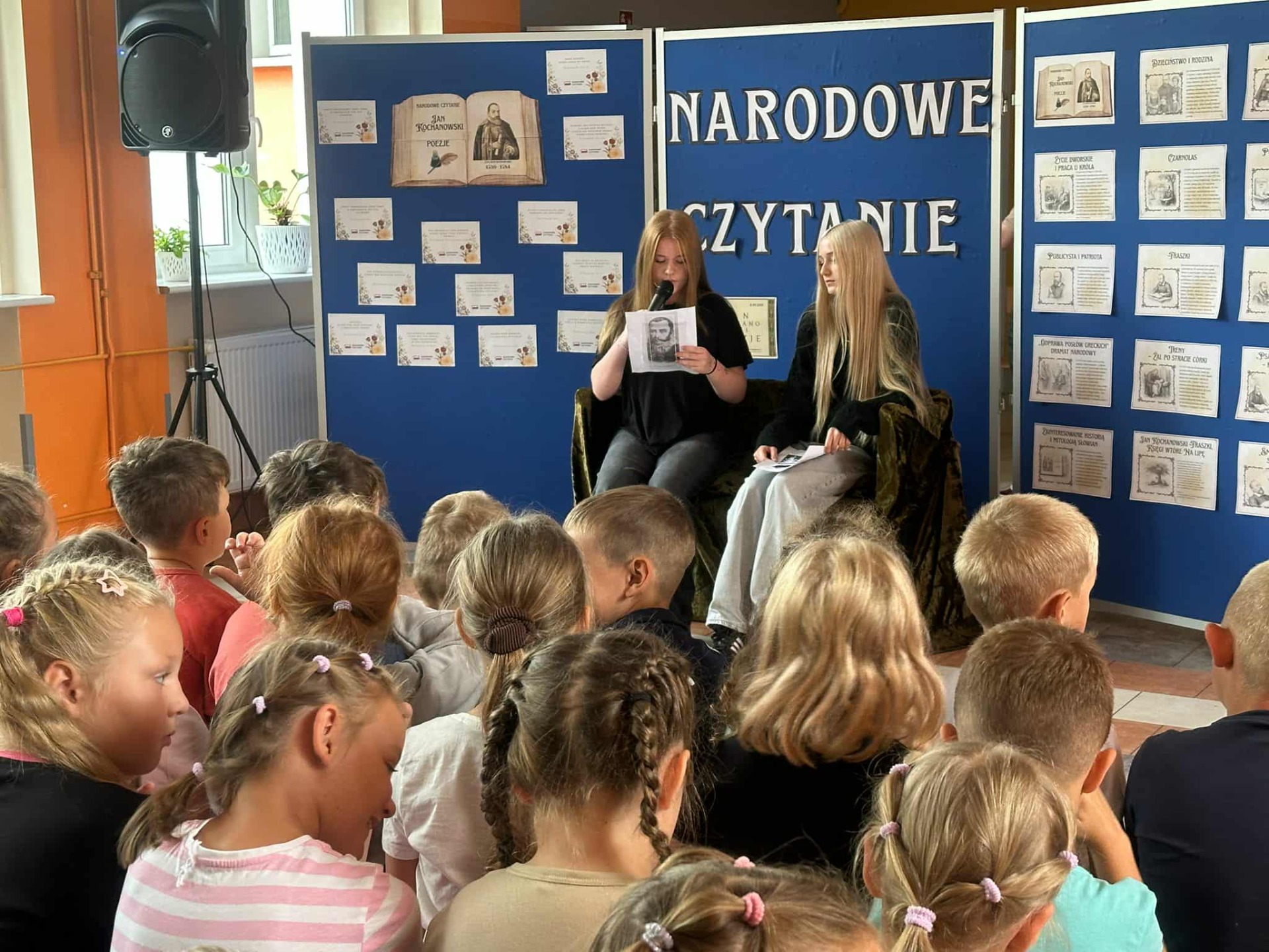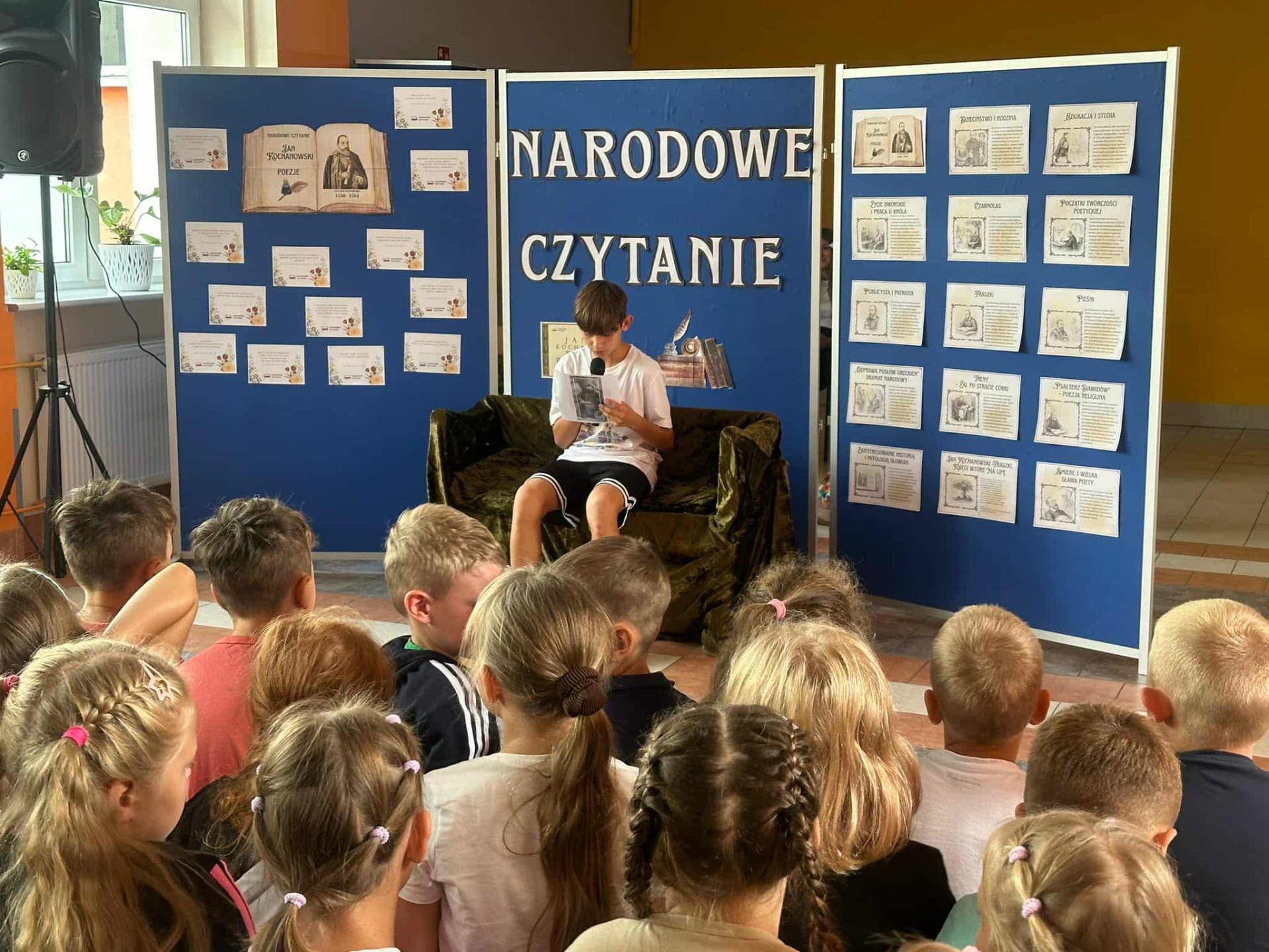 W poniedziałek w naszej szkole odbyło się Narodowe Czytanie poezji Jana Kochanowskiego. Utwory renesansowego poety zaprezentowali uczniowie klas VII i VIII oraz nauczyciele. Wszyscy z uwagą wysłuchali listu pary prezydenckiej oraz fraszek, pieśni i trenów Jana Kochanowskiego. Na koniec uczniowie otrzymali pamiątkową pieczęć do zeszytu.