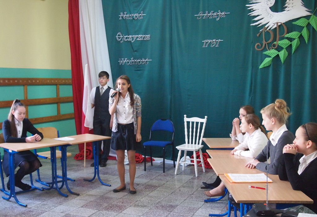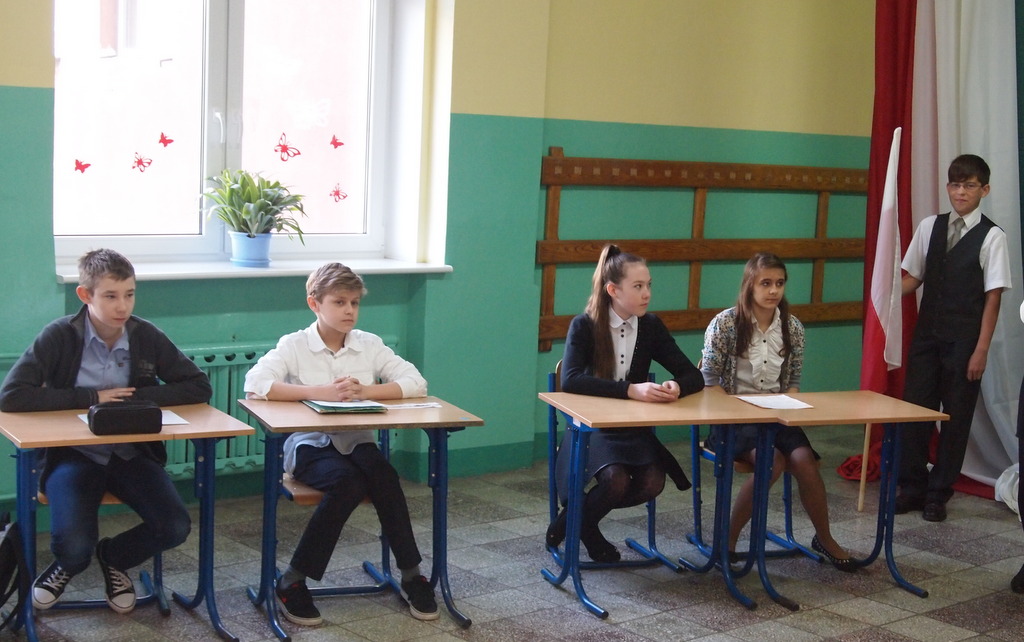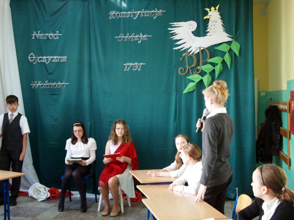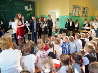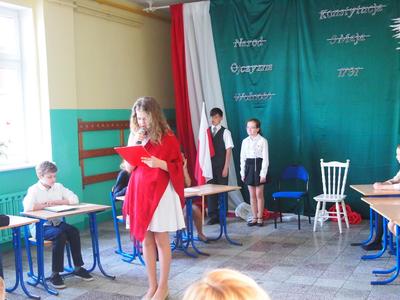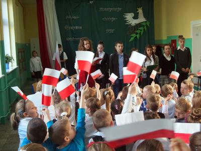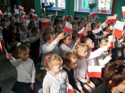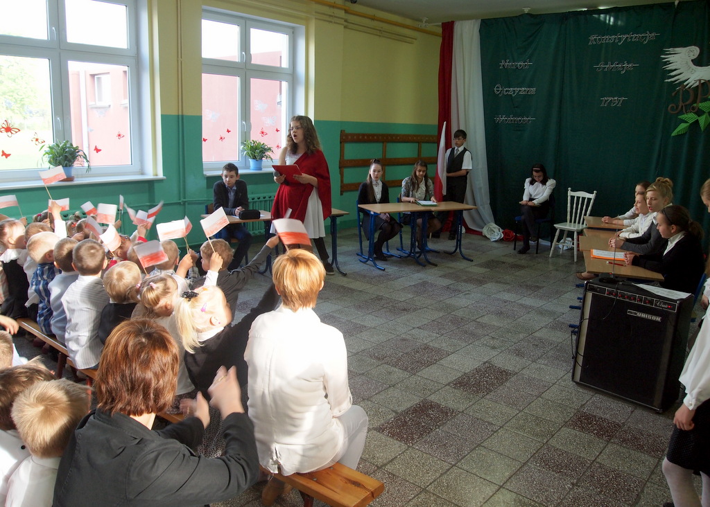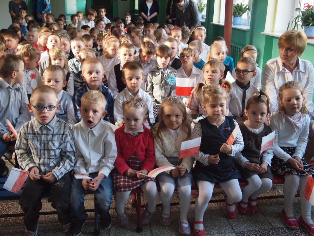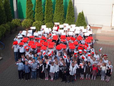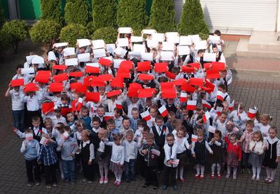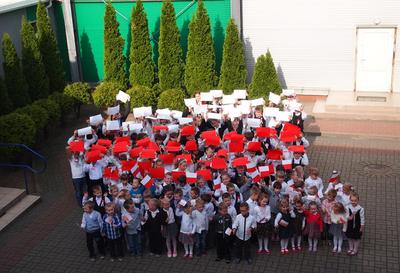 Po akademii każdy z uczniów klas I – III otrzymał czerwoną kartkę, a uczniowie klas IV – VI kartkę białą. Podczas krótkiego happeningu na boisku szkolnym z kartek biało-czerwonych uczniowie ułożyli flagę Polski. Dookoła nich ustawiły się przedszkolaki z chorągiewkami. W ten sposób nasza społeczność uczciła Święto Flagi.